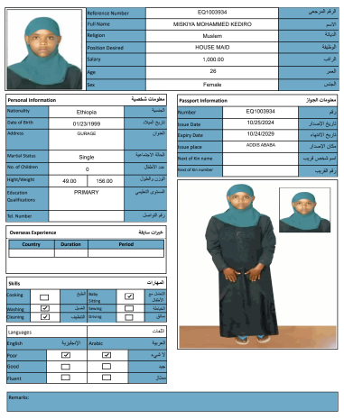 نوع الخدمة نوع الخدمة استقدام تأجير نقل خدمات الجنسية الجنسية الفلبين الهند مصر كينيا اثيوبيا بروندي بنغلاديش أوغندا أوغندا معروفة باكستان الفلبين معروفة اندونيسيا المهنة عاملة منزلية سائق خاص عاملة عناية زوجين ( عامله منزليه وسائق ) الديانة مسلم غير مسلم الخبرة سبق العمل لم يسبق العمل العمر العمر 15 16 17 18 19 20 21 22 23 24 25 26 27 28 29 30 31 32 33 34 35 36 37 38 39 40 41 42 43 44 45 46 47 48 49 50 51 52 53 54 55 56 57 58 59 60 الحالة العائلية الحالة العائلية اعزب متزوج مطلق ارمل اللغة اللغة العربية العربية العربية بنجالي نبالي فلبيني امهرية سواحلي عربي + لغتها الاساسية اندونيسي اوغندي بروندي الوزن الوزن 40 41 42 43 44 45 46 47 48 49 50 51 52 53 54 55 56 57 58 59 60 61 62 63 64 65 66 67 68 69 70 71 72 73 74 75 76 77 78 79 80 81 82 83 84 85 86 87 88 89 90 91 92 93 94 95 96 97 98 99 100 الطول الطول 100 101 102 103 104 105 106 107 108 109 110 111 112 113 114 115 116 117 118 119 120 121 122 123 124 125 126 127 128 129 130 131 132 133 134 135 136 137 138 139 140 141 142 143 144 145 146 147 148 149 150 151 152 153 154 155 156 157 158 159 160 161 162 163 164 165 166 167 168 169 170 171 172 173 174 175 176 177 178 179 180 181 182 183 184 185 186 187 188 189 190 الطلبات الطلبات التنظيف الغسيل الكوي الطبيخ العربي عناية الأطفال عناية كبار السن عناية الرضيع تعليم الأطفال التنظيف - الغسيل - الكوي التنظيف - الغسيل - الكوي- رغبة في تعلم الطبخ التنظيف - الغسيل - الكوي- رغبة في العناية بالاطفال بحث مسح بحث متقدم REHIMA SEID MOHAMMED اثيوبيا العمر 24 الخبرة لم يسبق العمل الديانة مسلم رقم الملف EQ1301196 حجز العاملة NEIMA IBRE MOHAMMED اثيوبيا العمر 24 الخبرة لم يسبق العمل الديانة مسلم رقم الملف EQ1426449 حجز العاملة NURIYA CHKISA GAGURO اثيوبيا العمر 28 الخبرة لم يسبق العمل الديانة مسلم رقم الملف EP9120713 حجز العاملة MEHUBA NEJU TEREFE اثيوبيا العمر 23 الخبرة لم يسبق العمل الديانة مسلم رقم الملف EQ2336843 حجز العاملة MASHLA SEID MEKONIN اثيوبيا العمر 26 الخبرة لم يسبق العمل الديانة مسلم رقم الملف EQ1093700 حجز العاملة FETIYA AMAN SAYID اثيوبيا العمر 26 الخبرة لم يسبق العمل الديانة مسلم رقم الملف EQ1288386 حجز العاملة HAYAT SIRWANA EBADO اثيوبيا العمر 23 الخبرة لم يسبق العمل الديانة مسلم رقم الملف EQ1566224 حجز العاملة MEKIYA JEMAL ABDUREHMAN اثيوبيا العمر 24 الخبرة لم يسبق العمل الديانة مسلم رقم الملف EQ1119470 حجز العاملة NEIMA TUNI KEDIR اثيوبيا العمر 28 الخبرة لم يسبق العمل الديانة مسلم رقم الملف EP9348886 حجز العاملة MISKIYA MOHAMMED KEDIRO اثيوبيا العمر 26 الخبرة لم يسبق العمل الديانة مسلم رقم الملف EQ1003934 حجز العاملة 1 2 3 4