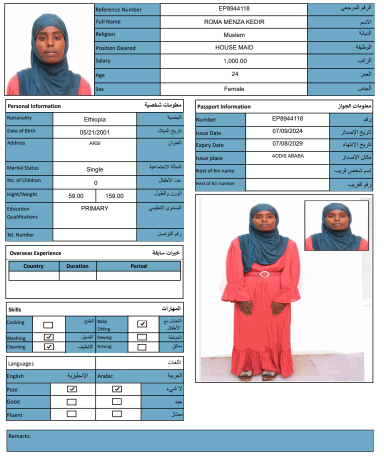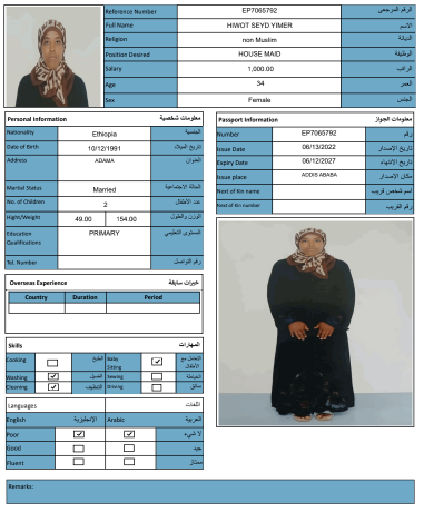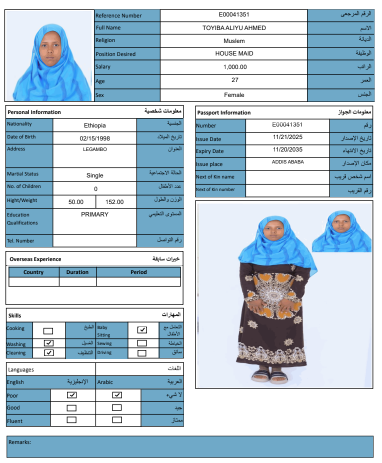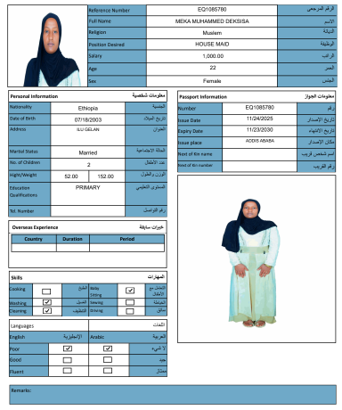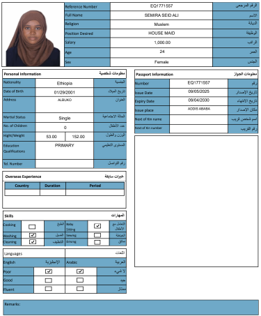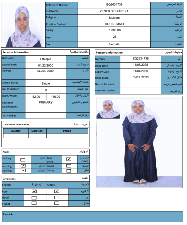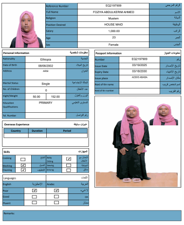 نوع الخدمة نوع الخدمة استقدام تأجير نقل خدمات الجنسية الجنسية الفلبين الهند مصر كينيا اثيوبيا بروندي بنغلاديش أوغندا أوغندا معروفة باكستان الفلبين معروفة اندونيسيا المهنة عاملة منزلية سائق خاص عاملة عناية زوجين ( عامله منزليه وسائق ) الديانة مسلم غير مسلم الخبرة سبق العمل لم يسبق العمل العمر العمر 15 16 17 18 19 20 21 22 23 24 25 26 27 28 29 30 31 32 33 34 35 36 37 38 39 40 41 42 43 44 45 46 47 48 49 50 51 52 53 54 55 56 57 58 59 60 الحالة العائلية الحالة العائلية اعزب متزوج مطلق ارمل اللغة اللغة العربية العربية العربية بنجالي نبالي فلبيني امهرية سواحلي عربي + لغتها الاساسية اندونيسي اوغندي بروندي الوزن الوزن 40 41 42 43 44 45 46 47 48 49 50 51 52 53 54 55 56 57 58 59 60 61 62 63 64 65 66 67 68 69 70 71 72 73 74 75 76 77 78 79 80 81 82 83 84 85 86 87 88 89 90 91 92 93 94 95 96 97 98 99 100 الطول الطول 100 101 102 103 104 105 106 107 108 109 110 111 112 113 114 115 116 117 118 119 120 121 122 123 124 125 126 127 128 129 130 131 132 133 134 135 136 137 138 139 140 141 142 143 144 145 146 147 148 149 150 151 152 153 154 155 156 157 158 159 160 161 162 163 164 165 166 167 168 169 170 171 172 173 174 175 176 177 178 179 180 181 182 183 184 185 186 187 188 189 190 الطلبات الطلبات التنظيف الغسيل الكوي الطبيخ العربي عناية الأطفال عناية كبار السن عناية الرضيع تعليم الأطفال التنظيف - الغسيل - الكوي التنظيف - الغسيل - الكوي- رغبة في تعلم الطبخ التنظيف - الغسيل - الكوي- رغبة في العناية بالاطفال بحث مسح بحث متقدم ZENEB SEID AREGA اثيوبيا العمر 25 الخبرة لم يسبق العمل الديانة مسلم رقم الملف EQ2634739 حجز العاملة HIWOT SEYD YIMER اثيوبيا العمر 34 الخبرة لم يسبق العمل الديانة غير مسلم رقم الملف EP7065792 حجز العاملة MEKA MUHAMMED DEKSISA اثيوبيا العمر 22 الخبرة لم يسبق العمل الديانة مسلم رقم الملف EQ1085780 حجز العاملة FOZIYA ABDULKERIM AHMED اثيوبيا العمر 23 الخبرة لم يسبق العمل الديانة مسلم رقم الملف EQ2197909 حجز العاملة TOYIBA ALIYU AHMED اثيوبيا العمر 27 الخبرة لم يسبق العمل الديانة مسلم رقم الملف E00041351 حجز العاملة SEMIRA SEID ALI اثيوبيا العمر 24 الخبرة لم يسبق العمل الديانة مسلم رقم الملف EQ1771557 حجز العاملة SALIYA ABDELLA ABAFITA اثيوبيا العمر 21 الخبرة لم يسبق العمل الديانة مسلم رقم الملف EQ2192532 حجز العاملة ROMA MENZA KEDIR اثيوبيا العمر 24 الخبرة لم يسبق العمل الديانة مسلم رقم الملف EP8944118 حجز العاملة RABIA MUHAMMED AHMED اثيوبيا العمر 25 الخبرة لم يسبق العمل الديانة مسلم رقم الملف EQ1558924 حجز العاملة NESRA JEMALU ABADIGA اثيوبيا العمر 23 الخبرة لم يسبق العمل الديانة مسلم رقم الملف EQ1507189 حجز العاملة 1 2 3 4 5 6