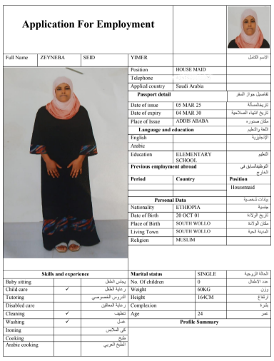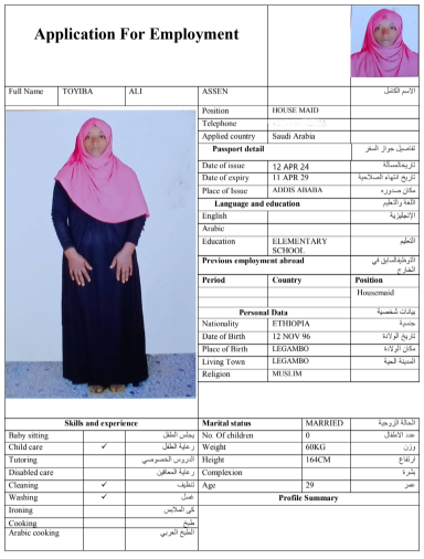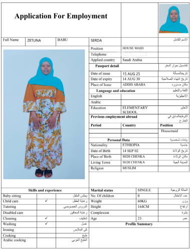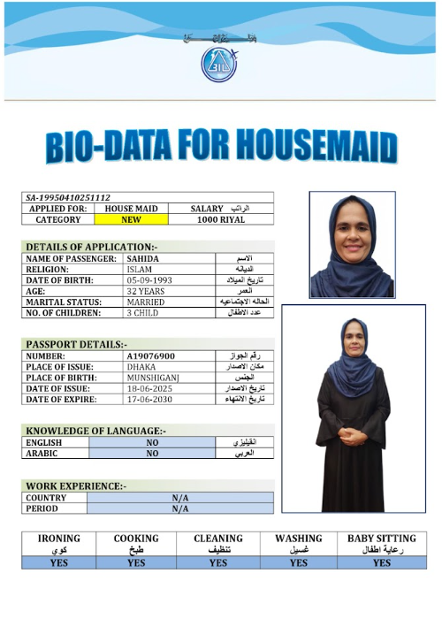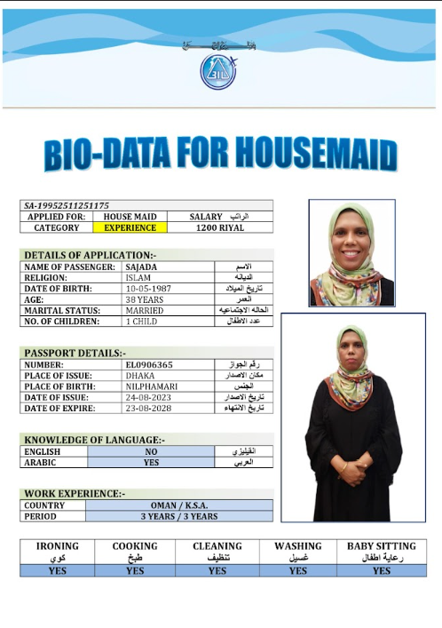 نوع الخدمة نوع الخدمة استقدام تأجير نقل خدمات الجنسية الجنسية الفلبين الهند مصر كينيا اثيوبيا بروندي بنغلاديش أوغندا أوغندا معروفة باكستان الفلبين معروفة اندونيسيا المهنة عاملة منزلية سائق خاص عاملة عناية زوجين ( عامله منزليه وسائق ) الديانة مسلم غير مسلم الخبرة سبق العمل لم يسبق العمل العمر العمر 15 16 17 18 19 20 21 22 23 24 25 26 27 28 29 30 31 32 33 34 35 36 37 38 39 40 41 42 43 44 45 46 47 48 49 50 51 52 53 54 55 56 57 58 59 60 الحالة العائلية الحالة العائلية اعزب متزوج مطلق ارمل اللغة اللغة العربية العربية العربية بنجالي نبالي فلبيني امهرية سواحلي عربي + لغتها الاساسية اندونيسي اوغندي بروندي الوزن الوزن 40 41 42 43 44 45 46 47 48 49 50 51 52 53 54 55 56 57 58 59 60 61 62 63 64 65 66 67 68 69 70 71 72 73 74 75 76 77 78 79 80 81 82 83 84 85 86 87 88 89 90 91 92 93 94 95 96 97 98 99 100 الطول الطول 100 101 102 103 104 105 106 107 108 109 110 111 112 113 114 115 116 117 118 119 120 121 122 123 124 125 126 127 128 129 130 131 132 133 134 135 136 137 138 139 140 141 142 143 144 145 146 147 148 149 150 151 152 153 154 155 156 157 158 159 160 161 162 163 164 165 166 167 168 169 170 171 172 173 174 175 176 177 178 179 180 181 182 183 184 185 186 187 188 189 190 الطلبات الطلبات التنظيف الغسيل الكوي الطبيخ العربي عناية الأطفال عناية كبار السن عناية الرضيع تعليم الأطفال التنظيف - الغسيل - الكوي التنظيف - الغسيل - الكوي- رغبة في تعلم الطبخ التنظيف - الغسيل - الكوي- رغبة في العناية بالاطفال بحث مسح بحث متقدم ROJINA AKTER بنغلاديش العمر 37 الخبرة لم يسبق العمل الديانة مسلم رقم الملف A20132322 حجز العاملة ROKEYA KHATUN بنغلاديش العمر 39 الخبرة سبق العمل الديانة مسلم رقم الملف A14967251 حجز العاملة ROMENA AKTER بنغلاديش العمر 26 الخبرة لم يسبق العمل الديانة مسلم رقم الملف A08503562 حجز العاملة SAHIDA بنغلاديش العمر 32 الخبرة لم يسبق العمل الديانة مسلم رقم الملف A19076900 حجز العاملة SAJADA بنغلاديش العمر 38 الخبرة سبق العمل الديانة مسلم رقم الملف EL0906365 حجز العاملة ZEYNEBA SEID YIMER اثيوبيا العمر 24 الخبرة لم يسبق العمل الديانة مسلم رقم الملف EQ2147254 حجز العاملة ZETUNA BABU SERDA اثيوبيا العمر 23 الخبرة لم يسبق العمل الديانة مسلم رقم الملف EQ1675942 حجز العاملة ZAMZAM HAJI EDAO اثيوبيا العمر 25 الخبرة لم يسبق العمل الديانة مسلم رقم الملف EQ2741470 حجز العاملة TOYIBA ALI ASSEN اثيوبيا العمر 29 الخبرة لم يسبق العمل الديانة مسلم رقم الملف EP8792020 حجز العاملة TEJE BAYITA ADUGNA اثيوبيا العمر 24 الخبرة لم يسبق العمل الديانة غير مسلم رقم الملف EQ2794163 حجز العاملة 3 4 5 6 7 8 9 10 11