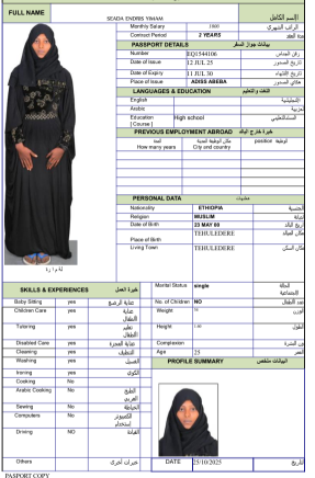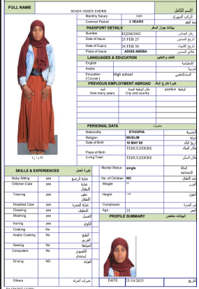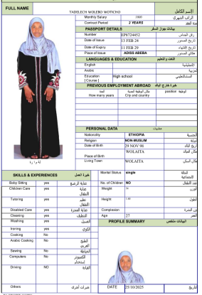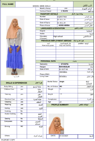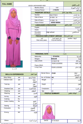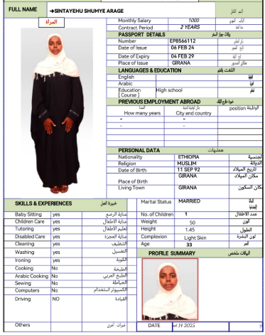 نوع الخدمة نوع الخدمة استقدام تأجير نقل خدمات الجنسية الجنسية الفلبين الهند مصر كينيا اثيوبيا بروندي بنغلاديش أوغندا أوغندا معروفة باكستان الفلبين معروفة اندونيسيا المهنة عاملة منزلية سائق خاص عاملة عناية زوجين ( عامله منزليه وسائق ) الديانة مسلم غير مسلم الخبرة سبق العمل لم يسبق العمل العمر العمر 15 16 17 18 19 20 21 22 23 24 25 26 27 28 29 30 31 32 33 34 35 36 37 38 39 40 41 42 43 44 45 46 47 48 49 50 51 52 53 54 55 56 57 58 59 60 الحالة العائلية الحالة العائلية اعزب متزوج مطلق ارمل اللغة اللغة العربية العربية العربية بنجالي نبالي فلبيني امهرية سواحلي عربي + لغتها الاساسية اندونيسي اوغندي بروندي الوزن الوزن 40 41 42 43 44 45 46 47 48 49 50 51 52 53 54 55 56 57 58 59 60 61 62 63 64 65 66 67 68 69 70 71 72 73 74 75 76 77 78 79 80 81 82 83 84 85 86 87 88 89 90 91 92 93 94 95 96 97 98 99 100 الطول الطول 100 101 102 103 104 105 106 107 108 109 110 111 112 113 114 115 116 117 118 119 120 121 122 123 124 125 126 127 128 129 130 131 132 133 134 135 136 137 138 139 140 141 142 143 144 145 146 147 148 149 150 151 152 153 154 155 156 157 158 159 160 161 162 163 164 165 166 167 168 169 170 171 172 173 174 175 176 177 178 179 180 181 182 183 184 185 186 187 188 189 190 الطلبات الطلبات التنظيف الغسيل الكوي الطبيخ العربي عناية الأطفال عناية كبار السن عناية الرضيع تعليم الأطفال التنظيف - الغسيل - الكوي التنظيف - الغسيل - الكوي- رغبة في تعلم الطبخ التنظيف - الغسيل - الكوي- رغبة في العناية بالاطفال بحث مسح بحث متقدم TADELECH WOLEBO WOTICHO اثيوبيا العمر 27 الخبرة لم يسبق العمل الديانة غير مسلم رقم الملف EP8724452 حجز العاملة ➜SINTAYEHU SHUMYE ARAGE اثيوبيا العمر 33 الخبرة لم يسبق العمل الديانة مسلم رقم الملف EP8566112 حجز العاملة SENEDU ABEBE MOLLA اثيوبيا العمر 25 الخبرة لم يسبق العمل الديانة غير مسلم رقم الملف EQ8927968 حجز العاملة SELAMAWIT BAYE MELESE اثيوبيا العمر 23 الخبرة لم يسبق العمل الديانة غير مسلم رقم الملف EQ2757667 حجز العاملة SEADA MOHAMMED SEID اثيوبيا العمر 25 الخبرة لم يسبق العمل الديانة مسلم رقم الملف EQ1374411 حجز العاملة SEADA HUSEN ENDRIS اثيوبيا العمر 25 الخبرة لم يسبق العمل الديانة مسلم رقم الملف EQ2062442 حجز العاملة SEADA FENTAW HASSEN اثيوبيا العمر 23 الخبرة لم يسبق العمل الديانة مسلم رقم الملف EQ1742270 حجز العاملة SEADA ENDRIS YIMAM اثيوبيا العمر 25 الخبرة لم يسبق العمل الديانة مسلم رقم الملف EQ1544106 حجز العاملة SHFA SADYAAMAN اثيوبيا العمر 39 الخبرة لم يسبق العمل الديانة مسلم رقم الملف EQ2045383 حجز العاملة RUKIYA ADEM HYSSEN اثيوبيا العمر 26 الخبرة لم يسبق العمل الديانة مسلم رقم الملف EQ2174937 حجز العاملة 8 9 10 11 12 13 14 15 16