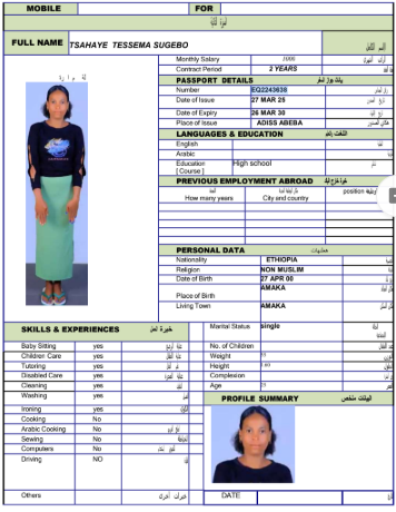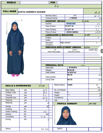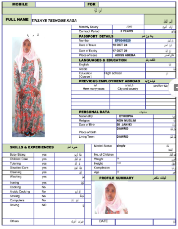 نوع الخدمة نوع الخدمة استقدام تأجير نقل خدمات الجنسية الجنسية الفلبين الهند مصر كينيا اثيوبيا بروندي بنغلاديش أوغندا أوغندا معروفة باكستان الفلبين معروفة اندونيسيا المهنة عاملة منزلية سائق خاص عاملة عناية زوجين ( عامله منزليه وسائق ) الديانة مسلم غير مسلم الخبرة سبق العمل لم يسبق العمل العمر العمر 15 16 17 18 19 20 21 22 23 24 25 26 27 28 29 30 31 32 33 34 35 36 37 38 39 40 41 42 43 44 45 46 47 48 49 50 51 52 53 54 55 56 57 58 59 60 الحالة العائلية الحالة العائلية اعزب متزوج مطلق ارمل اللغة اللغة العربية العربية العربية بنجالي نبالي فلبيني امهرية سواحلي عربي + لغتها الاساسية اندونيسي اوغندي بروندي الوزن الوزن 40 41 42 43 44 45 46 47 48 49 50 51 52 53 54 55 56 57 58 59 60 61 62 63 64 65 66 67 68 69 70 71 72 73 74 75 76 77 78 79 80 81 82 83 84 85 86 87 88 89 90 91 92 93 94 95 96 97 98 99 100 الطول الطول 100 101 102 103 104 105 106 107 108 109 110 111 112 113 114 115 116 117 118 119 120 121 122 123 124 125 126 127 128 129 130 131 132 133 134 135 136 137 138 139 140 141 142 143 144 145 146 147 148 149 150 151 152 153 154 155 156 157 158 159 160 161 162 163 164 165 166 167 168 169 170 171 172 173 174 175 176 177 178 179 180 181 182 183 184 185 186 187 188 189 190 الطلبات الطلبات التنظيف الغسيل الكوي الطبيخ العربي عناية الأطفال عناية كبار السن عناية الرضيع تعليم الأطفال التنظيف - الغسيل - الكوي التنظيف - الغسيل - الكوي- رغبة في تعلم الطبخ التنظيف - الغسيل - الكوي- رغبة في العناية بالاطفال بحث مسح بحث متقدم SUDI KEDIR ABAFITA اثيوبيا العمر 24 الخبرة لم يسبق العمل الديانة مسلم رقم الملف EP8551097 حجز العاملة Tesfanesh dae dawuro اثيوبيا العمر 25 الخبرة لم يسبق العمل الديانة مسلم رقم الملف EP9327048 حجز العاملة Tesfanesh dae dawuro اثيوبيا العمر 25 الخبرة لم يسبق العمل الديانة غير مسلم رقم الملف EQ1557691 حجز العاملة TIGIST GETACHOW ASFAW اثيوبيا العمر 22 الخبرة لم يسبق العمل الديانة غير مسلم رقم الملف EQ1960651 حجز العاملة TIGIST KENAW TADESE اثيوبيا العمر 25 الخبرة لم يسبق العمل الديانة غير مسلم رقم الملف EQ1659870 حجز العاملة TINSAYE TESHOME KASA اثيوبيا العمر 32 الخبرة لم يسبق العمل الديانة غير مسلم رقم الملف EP9346029 حجز العاملة MARU MUZE HASSEN اثيوبيا العمر 26 الخبرة لم يسبق العمل الديانة مسلم رقم الملف EQ1926156 حجز العاملة TSAHAYE TESSEMA SUGEBO اثيوبيا العمر 25 الخبرة لم يسبق العمل الديانة غير مسلم رقم الملف EQ2243638 حجز العاملة TSEGANESH SEMON MENTA اثيوبيا العمر 35 الخبرة لم يسبق العمل الديانة غير مسلم رقم الملف EP9256071 حجز العاملة WELANSA BIRU GUDETA اثيوبيا العمر 24 الخبرة لم يسبق العمل الديانة غير مسلم رقم الملف EP8379690 حجز العاملة 18 19 20 21 22 23 24 25 26