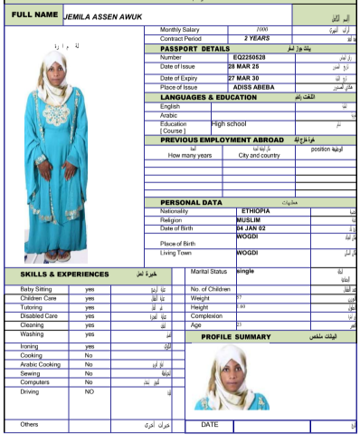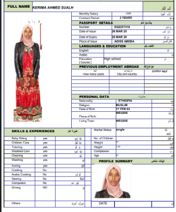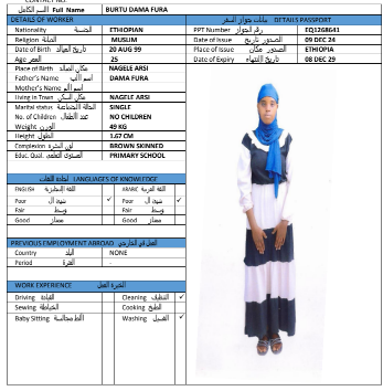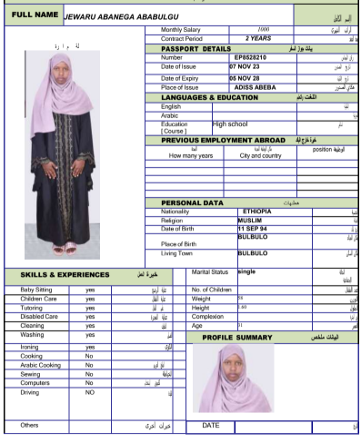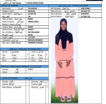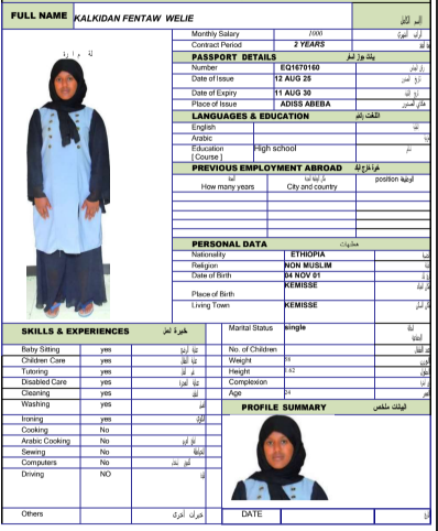 نوع الخدمة نوع الخدمة استقدام تأجير نقل خدمات الجنسية الجنسية الفلبين الهند مصر كينيا اثيوبيا بروندي بنغلاديش أوغندا أوغندا معروفة باكستان الفلبين معروفة اندونيسيا المهنة عاملة منزلية سائق خاص عاملة عناية زوجين ( عامله منزليه وسائق ) الديانة مسلم غير مسلم الخبرة سبق العمل لم يسبق العمل العمر العمر 15 16 17 18 19 20 21 22 23 24 25 26 27 28 29 30 31 32 33 34 35 36 37 38 39 40 41 42 43 44 45 46 47 48 49 50 51 52 53 54 55 56 57 58 59 60 الحالة العائلية الحالة العائلية اعزب متزوج مطلق ارمل اللغة اللغة العربية العربية العربية بنجالي نبالي فلبيني امهرية سواحلي عربي + لغتها الاساسية اندونيسي اوغندي بروندي الوزن الوزن 40 41 42 43 44 45 46 47 48 49 50 51 52 53 54 55 56 57 58 59 60 61 62 63 64 65 66 67 68 69 70 71 72 73 74 75 76 77 78 79 80 81 82 83 84 85 86 87 88 89 90 91 92 93 94 95 96 97 98 99 100 الطول الطول 100 101 102 103 104 105 106 107 108 109 110 111 112 113 114 115 116 117 118 119 120 121 122 123 124 125 126 127 128 129 130 131 132 133 134 135 136 137 138 139 140 141 142 143 144 145 146 147 148 149 150 151 152 153 154 155 156 157 158 159 160 161 162 163 164 165 166 167 168 169 170 171 172 173 174 175 176 177 178 179 180 181 182 183 184 185 186 187 188 189 190 الطلبات الطلبات التنظيف الغسيل الكوي الطبيخ العربي عناية الأطفال عناية كبار السن عناية الرضيع تعليم الأطفال التنظيف - الغسيل - الكوي التنظيف - الغسيل - الكوي- رغبة في تعلم الطبخ التنظيف - الغسيل - الكوي- رغبة في العناية بالاطفال بحث مسح بحث متقدم KETIMA TEMAM KEDIR اثيوبيا العمر 26 الخبرة لم يسبق العمل الديانة مسلم رقم الملف EP9175596 حجز العاملة KERIMA AHMED SUALH اثيوبيا العمر 23 الخبرة لم يسبق العمل الديانة مسلم رقم الملف EQ2237316 حجز العاملة KEBEBUSH TAFESA BEYENA اثيوبيا العمر 24 الخبرة لم يسبق العمل الديانة غير مسلم رقم الملف EQ1920019 حجز العاملة KEBEBUSH ABABU GEMECHU اثيوبيا العمر 25 الخبرة لم يسبق العمل الديانة مسلم رقم الملف EP7935920 حجز العاملة KALKIDAN FENTAW WELIE اثيوبيا العمر 24 الخبرة لم يسبق العمل الديانة غير مسلم رقم الملف EQ1670160 حجز العاملة JEWARU ABANEGA ABABULGU اثيوبيا العمر 31 الخبرة لم يسبق العمل الديانة مسلم رقم الملف EP8528210 حجز العاملة JEMILA ASSEN AWUK اثيوبيا العمر 23 الخبرة لم يسبق العمل الديانة مسلم رقم الملف EQ2250528 حجز العاملة CHALA JEMAL EDEO اثيوبيا العمر 24 الخبرة لم يسبق العمل الديانة مسلم رقم الملف EP8159983 حجز العاملة BURTU DAMA FURA اثيوبيا العمر 25 الخبرة لم يسبق العمل الديانة مسلم رقم الملف EQ1268641 حجز العاملة BILKISA ADEM MUHAMMED اثيوبيا العمر 22 الخبرة لم يسبق العمل الديانة مسلم رقم الملف EQ2822639 حجز العاملة 20 21 22 23 24 25 26 27 28