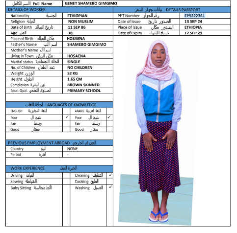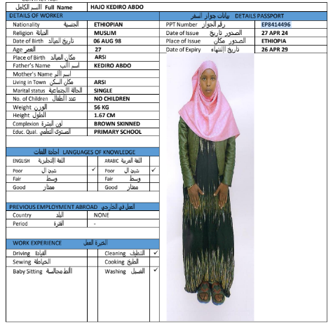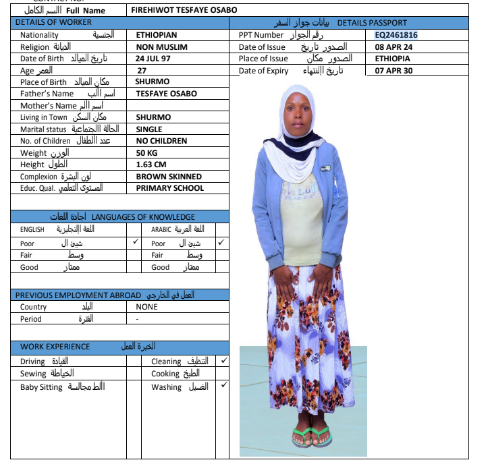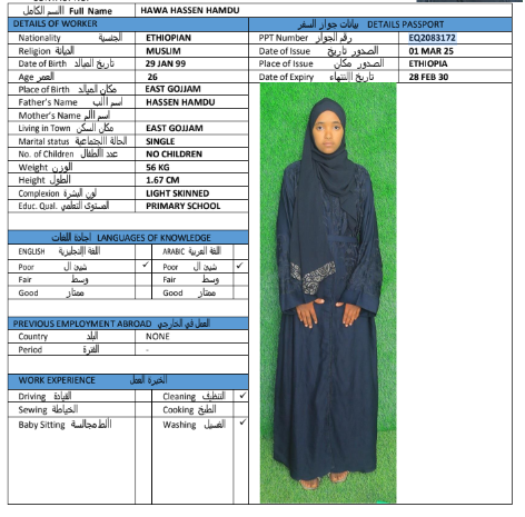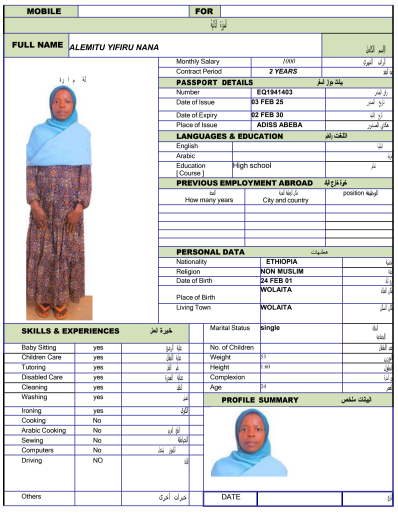 نوع الخدمة نوع الخدمة استقدام تأجير نقل خدمات الجنسية الجنسية الفلبين الهند مصر كينيا اثيوبيا بروندي بنغلاديش أوغندا أوغندا معروفة باكستان الفلبين معروفة اندونيسيا المهنة عاملة منزلية سائق خاص عاملة عناية زوجين ( عامله منزليه وسائق ) الديانة مسلم غير مسلم الخبرة سبق العمل لم يسبق العمل العمر العمر 15 16 17 18 19 20 21 22 23 24 25 26 27 28 29 30 31 32 33 34 35 36 37 38 39 40 41 42 43 44 45 46 47 48 49 50 51 52 53 54 55 56 57 58 59 60 الحالة العائلية الحالة العائلية اعزب متزوج مطلق ارمل اللغة اللغة العربية العربية العربية بنجالي نبالي فلبيني امهرية سواحلي عربي + لغتها الاساسية اندونيسي اوغندي بروندي الوزن الوزن 40 41 42 43 44 45 46 47 48 49 50 51 52 53 54 55 56 57 58 59 60 61 62 63 64 65 66 67 68 69 70 71 72 73 74 75 76 77 78 79 80 81 82 83 84 85 86 87 88 89 90 91 92 93 94 95 96 97 98 99 100 الطول الطول 100 101 102 103 104 105 106 107 108 109 110 111 112 113 114 115 116 117 118 119 120 121 122 123 124 125 126 127 128 129 130 131 132 133 134 135 136 137 138 139 140 141 142 143 144 145 146 147 148 149 150 151 152 153 154 155 156 157 158 159 160 161 162 163 164 165 166 167 168 169 170 171 172 173 174 175 176 177 178 179 180 181 182 183 184 185 186 187 188 189 190 الطلبات الطلبات التنظيف الغسيل الكوي الطبيخ العربي عناية الأطفال عناية كبار السن عناية الرضيع تعليم الأطفال التنظيف - الغسيل - الكوي التنظيف - الغسيل - الكوي- رغبة في تعلم الطبخ التنظيف - الغسيل - الكوي- رغبة في العناية بالاطفال بحث مسح بحث متقدم ALEMITU YIFIRU NANA اثيوبيا العمر 24 الخبرة لم يسبق العمل الديانة غير مسلم رقم الملف EQ1941403 حجز العاملة HAWA HASSEN HAMDU اثيوبيا العمر 26 الخبرة لم يسبق العمل الديانة مسلم رقم الملف EQ2083172 حجز العاملة FIREHIWOT TESFAYE OSABO اثيوبيا العمر 27 الخبرة لم يسبق العمل الديانة غير مسلم رقم الملف EQ2461816 حجز العاملة GENET SHAMEBO GIMGIMO اثيوبيا العمر 38 الخبرة لم يسبق العمل الديانة غير مسلم رقم الملف EP9222361 حجز العاملة HAJO KEDIRO ABDO اثيوبيا العمر 27 الخبرة لم يسبق العمل الديانة مسلم رقم الملف EP8414496 حجز العاملة SHEGA SANI ALIYAS اثيوبيا العمر 24 الخبرة لم يسبق العمل الديانة مسلم رقم الملف EQ2448198 حجز العاملة SENAYIT MENTA HABTEMARIYAM اثيوبيا العمر 23 الخبرة لم يسبق العمل الديانة غير مسلم رقم الملف EQ2475488 حجز العاملة SEMIRA FIRA ABADURA اثيوبيا العمر 22 الخبرة لم يسبق العمل الديانة مسلم رقم الملف EQ1400196 حجز العاملة SADIYA TABIRO GEMEDA اثيوبيا العمر 25 الخبرة لم يسبق العمل الديانة مسلم رقم الملف EP8294723 حجز العاملة MESERET TAMIRAT BACHA اثيوبيا العمر 28 الخبرة لم يسبق العمل الديانة غير مسلم رقم الملف EP8913182 حجز العاملة 25 26 27 28 29 30 31 32