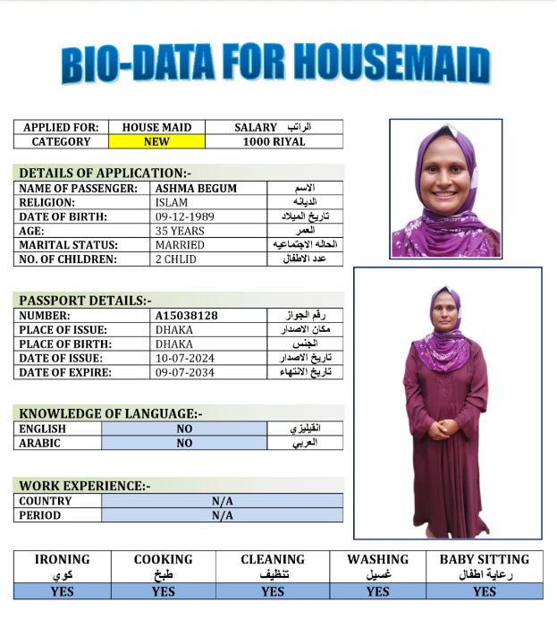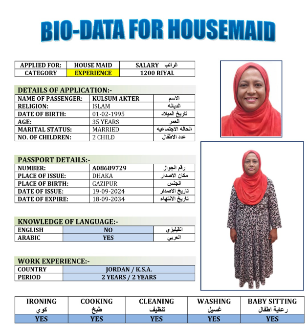 نوع الخدمة نوع الخدمة استقدام تأجير نقل خدمات الجنسية الجنسية الفلبين الهند مصر كينيا اثيوبيا بروندي بنغلاديش أوغندا أوغندا معروفة باكستان الفلبين معروفة اندونيسيا المهنة عاملة منزلية سائق خاص عاملة عناية زوجين ( عامله منزليه وسائق ) الديانة مسلم غير مسلم الخبرة سبق العمل لم يسبق العمل العمر العمر 15 16 17 18 19 20 21 22 23 24 25 26 27 28 29 30 31 32 33 34 35 36 37 38 39 40 41 42 43 44 45 46 47 48 49 50 51 52 53 54 55 56 57 58 59 60 الحالة العائلية الحالة العائلية اعزب متزوج مطلق ارمل اللغة اللغة العربية العربية العربية بنجالي نبالي فلبيني امهرية سواحلي عربي + لغتها الاساسية اندونيسي اوغندي بروندي الوزن الوزن 40 41 42 43 44 45 46 47 48 49 50 51 52 53 54 55 56 57 58 59 60 61 62 63 64 65 66 67 68 69 70 71 72 73 74 75 76 77 78 79 80 81 82 83 84 85 86 87 88 89 90 91 92 93 94 95 96 97 98 99 100 الطول الطول 100 101 102 103 104 105 106 107 108 109 110 111 112 113 114 115 116 117 118 119 120 121 122 123 124 125 126 127 128 129 130 131 132 133 134 135 136 137 138 139 140 141 142 143 144 145 146 147 148 149 150 151 152 153 154 155 156 157 158 159 160 161 162 163 164 165 166 167 168 169 170 171 172 173 174 175 176 177 178 179 180 181 182 183 184 185 186 187 188 189 190 الطلبات الطلبات التنظيف الغسيل الكوي الطبيخ العربي عناية الأطفال عناية كبار السن عناية الرضيع تعليم الأطفال التنظيف - الغسيل - الكوي التنظيف - الغسيل - الكوي- رغبة في تعلم الطبخ التنظيف - الغسيل - الكوي- رغبة في العناية بالاطفال بحث مسح بحث متقدم MST HASINA AKTER بنغلاديش العمر 43 الخبرة سبق العمل الديانة مسلم رقم الملف EN0032210 حجز العاملة NURUNNAHAR بنغلاديش العمر 35 الخبرة لم يسبق العمل الديانة مسلم رقم الملف A16367813 حجز العاملة MST MONZILA BEGUM بنغلاديش العمر 35 الخبرة لم يسبق العمل الديانة مسلم رقم الملف A18783012 حجز العاملة TANEA بنغلاديش العمر 34 الخبرة لم يسبق العمل الديانة مسلم رقم الملف A17843852 حجز العاملة LOTA RANI DASH بنغلاديش العمر 35 الخبرة لم يسبق العمل الديانة غير مسلم رقم الملف A13538024 حجز العاملة KULSUM AKTER بنغلاديش العمر 35 الخبرة سبق العمل الديانة مسلم رقم الملف A08689729 حجز العاملة GOLAPY AKTER بنغلاديش العمر 35 الخبرة سبق العمل الديانة مسلم رقم الملف EL0824792 حجز العاملة ASHMA BEGUM بنغلاديش العمر 35 الخبرة لم يسبق العمل الديانة مسلم رقم الملف A15038128 حجز العاملة MST SHAHINOOR بنغلاديش العمر 36 الخبرة لم يسبق العمل الديانة مسلم رقم الملف A01079963 حجز العاملة MOMOTAZ BEGUM بنغلاديش العمر 35 الخبرة لم يسبق العمل الديانة مسلم رقم الملف A18306642 حجز العاملة 1 2 3 4