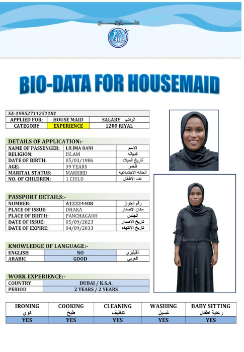 نوع الخدمة نوع الخدمة استقدام تأجير نقل خدمات الجنسية الجنسية الفلبين الهند مصر كينيا اثيوبيا بروندي بنغلاديش أوغندا أوغندا معروفة باكستان الفلبين معروفة اندونيسيا المهنة عاملة منزلية سائق خاص عاملة عناية زوجين ( عامله منزليه وسائق ) الديانة مسلم غير مسلم الخبرة سبق العمل لم يسبق العمل العمر العمر 15 16 17 18 19 20 21 22 23 24 25 26 27 28 29 30 31 32 33 34 35 36 37 38 39 40 41 42 43 44 45 46 47 48 49 50 51 52 53 54 55 56 57 58 59 60 الحالة العائلية الحالة العائلية اعزب متزوج مطلق ارمل اللغة اللغة العربية العربية العربية بنجالي نبالي فلبيني امهرية سواحلي عربي + لغتها الاساسية اندونيسي اوغندي بروندي الوزن الوزن 40 41 42 43 44 45 46 47 48 49 50 51 52 53 54 55 56 57 58 59 60 61 62 63 64 65 66 67 68 69 70 71 72 73 74 75 76 77 78 79 80 81 82 83 84 85 86 87 88 89 90 91 92 93 94 95 96 97 98 99 100 الطول الطول 100 101 102 103 104 105 106 107 108 109 110 111 112 113 114 115 116 117 118 119 120 121 122 123 124 125 126 127 128 129 130 131 132 133 134 135 136 137 138 139 140 141 142 143 144 145 146 147 148 149 150 151 152 153 154 155 156 157 158 159 160 161 162 163 164 165 166 167 168 169 170 171 172 173 174 175 176 177 178 179 180 181 182 183 184 185 186 187 188 189 190 الطلبات الطلبات التنظيف الغسيل الكوي الطبيخ العربي عناية الأطفال عناية كبار السن عناية الرضيع تعليم الأطفال التنظيف - الغسيل - الكوي التنظيف - الغسيل - الكوي- رغبة في تعلم الطبخ التنظيف - الغسيل - الكوي- رغبة في العناية بالاطفال بحث مسح بحث متقدم MORSHEDA بنغلاديش العمر 41 الخبرة سبق العمل الديانة مسلم رقم الملف A07822212 حجز العاملة MOMANA AKTER بنغلاديش العمر 37 الخبرة لم يسبق العمل الديانة مسلم رقم الملف A18894628 حجز العاملة MIM AKTER بنغلاديش العمر 31 الخبرة لم يسبق العمل الديانة مسلم رقم الملف A16682427 حجز العاملة MAKSUDA BEGUM بنغلاديش العمر 34 الخبرة سبق العمل الديانة مسلم رقم الملف A19030012 حجز العاملة MST DOLI AKTER بنغلاديش العمر 36 الخبرة لم يسبق العمل الديانة مسلم رقم الملف A06620994 حجز العاملة MST FERDOSI BEGUM بنغلاديش العمر 39 الخبرة لم يسبق العمل الديانة مسلم رقم الملف A20133928 حجز العاملة MST MINARA KHATUN بنغلاديش العمر 35 الخبرة سبق العمل الديانة مسلم رقم الملف A01069116 حجز العاملة MST MURSHIDA BEGUM بنغلاديش العمر 40 الخبرة لم يسبق العمل الديانة مسلم رقم الملف A20204408 حجز العاملة MST NAZMUNNAHAR KHATUN بنغلاديش العمر 29 الخبرة لم يسبق العمل الديانة مسلم رقم الملف A20571856 حجز العاملة LILIMA RANI بنغلاديش العمر 39 الخبرة سبق العمل الديانة مسلم رقم الملف A12224408 حجز العاملة 1 2 3 4