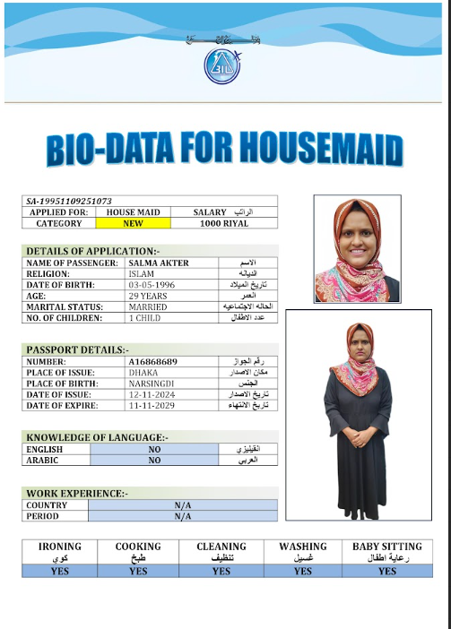 نوع الخدمة نوع الخدمة استقدام تأجير نقل خدمات الجنسية الجنسية الفلبين الهند مصر كينيا اثيوبيا بروندي بنغلاديش أوغندا أوغندا معروفة باكستان الفلبين معروفة اندونيسيا المهنة عاملة منزلية سائق خاص عاملة عناية زوجين ( عامله منزليه وسائق ) الديانة مسلم غير مسلم الخبرة سبق العمل لم يسبق العمل العمر العمر 15 16 17 18 19 20 21 22 23 24 25 26 27 28 29 30 31 32 33 34 35 36 37 38 39 40 41 42 43 44 45 46 47 48 49 50 51 52 53 54 55 56 57 58 59 60 الحالة العائلية الحالة العائلية اعزب متزوج مطلق ارمل اللغة اللغة العربية العربية العربية بنجالي نبالي فلبيني امهرية سواحلي عربي + لغتها الاساسية اندونيسي اوغندي بروندي الوزن الوزن 40 41 42 43 44 45 46 47 48 49 50 51 52 53 54 55 56 57 58 59 60 61 62 63 64 65 66 67 68 69 70 71 72 73 74 75 76 77 78 79 80 81 82 83 84 85 86 87 88 89 90 91 92 93 94 95 96 97 98 99 100 الطول الطول 100 101 102 103 104 105 106 107 108 109 110 111 112 113 114 115 116 117 118 119 120 121 122 123 124 125 126 127 128 129 130 131 132 133 134 135 136 137 138 139 140 141 142 143 144 145 146 147 148 149 150 151 152 153 154 155 156 157 158 159 160 161 162 163 164 165 166 167 168 169 170 171 172 173 174 175 176 177 178 179 180 181 182 183 184 185 186 187 188 189 190 الطلبات الطلبات التنظيف الغسيل الكوي الطبيخ العربي عناية الأطفال عناية كبار السن عناية الرضيع تعليم الأطفال التنظيف - الغسيل - الكوي التنظيف - الغسيل - الكوي- رغبة في تعلم الطبخ التنظيف - الغسيل - الكوي- رغبة في العناية بالاطفال بحث مسح بحث متقدم SAHIDA بنغلاديش العمر 32 الخبرة لم يسبق العمل الديانة مسلم رقم الملف A19076900 حجز العاملة SAJADA بنغلاديش العمر 38 الخبرة سبق العمل الديانة مسلم رقم الملف EL0906365 حجز العاملة FARIDA BEGUM بنغلاديش العمر 40 الخبرة لم يسبق العمل الديانة مسلم رقم الملف A06306048 حجز العاملة FARIDA AKTER بنغلاديش العمر 32 الخبرة لم يسبق العمل الديانة مسلم رقم الملف A19197889 حجز العاملة SALMA AKTER بنغلاديش العمر 29 الخبرة لم يسبق العمل الديانة مسلم رقم الملف A16868689 حجز العاملة SERINA AKTER بنغلاديش العمر 32 الخبرة لم يسبق العمل الديانة مسلم رقم الملف A16682428 حجز العاملة SHEFALI BEGUM بنغلاديش العمر 43 الخبرة لم يسبق العمل الديانة مسلم رقم الملف A15473749 حجز العاملة SHILPI BEGUM بنغلاديش العمر 39 الخبرة سبق العمل الديانة مسلم رقم الملف A17963440 حجز العاملة SUPIA BEGUM بنغلاديش العمر 43 الخبرة سبق العمل الديانة مسلم رقم الملف A03106018 حجز العاملة TASMIN AKTER بنغلاديش العمر 37 الخبرة لم يسبق العمل الديانة مسلم رقم الملف A08509102 حجز العاملة 1 2 3 4 5 6 7 8