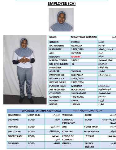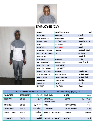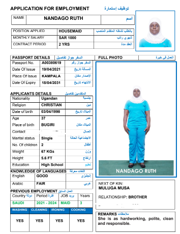 نوع الخدمة نوع الخدمة استقدام تأجير نقل خدمات الجنسية الجنسية الفلبين الهند مصر كينيا اثيوبيا بروندي بنغلاديش أوغندا أوغندا معروفة باكستان الفلبين معروفة اندونيسيا المهنة عاملة منزلية سائق خاص عاملة عناية زوجين ( عامله منزليه وسائق ) الديانة مسلم غير مسلم الخبرة سبق العمل لم يسبق العمل العمر العمر 15 16 17 18 19 20 21 22 23 24 25 26 27 28 29 30 31 32 33 34 35 36 37 38 39 40 41 42 43 44 45 46 47 48 49 50 51 52 53 54 55 56 57 58 59 60 الحالة العائلية الحالة العائلية اعزب متزوج مطلق ارمل اللغة اللغة العربية العربية العربية بنجالي نبالي فلبيني امهرية سواحلي عربي + لغتها الاساسية اندونيسي اوغندي بروندي الوزن الوزن 40 41 42 43 44 45 46 47 48 49 50 51 52 53 54 55 56 57 58 59 60 61 62 63 64 65 66 67 68 69 70 71 72 73 74 75 76 77 78 79 80 81 82 83 84 85 86 87 88 89 90 91 92 93 94 95 96 97 98 99 100 الطول الطول 100 101 102 103 104 105 106 107 108 109 110 111 112 113 114 115 116 117 118 119 120 121 122 123 124 125 126 127 128 129 130 131 132 133 134 135 136 137 138 139 140 141 142 143 144 145 146 147 148 149 150 151 152 153 154 155 156 157 158 159 160 161 162 163 164 165 166 167 168 169 170 171 172 173 174 175 176 177 178 179 180 181 182 183 184 185 186 187 188 189 190 الطلبات الطلبات التنظيف الغسيل الكوي الطبيخ العربي عناية الأطفال عناية كبار السن عناية الرضيع تعليم الأطفال التنظيف - الغسيل - الكوي التنظيف - الغسيل - الكوي- رغبة في تعلم الطبخ التنظيف - الغسيل - الكوي- رغبة في العناية بالاطفال بحث مسح بحث متقدم SANYU BETTY أوغندا العمر 29 الخبرة لم يسبق العمل الديانة غير مسلم رقم الملف B00390742 حجز العاملة NAKAYUZA SHARON أوغندا العمر 27 الخبرة لم يسبق العمل الديانة غير مسلم رقم الملف B00749200 حجز العاملة KABUGHO LAMULATI أوغندا العمر 35 الخبرة لم يسبق العمل الديانة مسلم رقم الملف B00764419 حجز العاملة KATOOKO BIIBA أوغندا العمر 25 الخبرة لم يسبق العمل الديانة مسلم رقم الملف A00825412 حجز العاملة TUGANTIRWE SURAINAH أوغندا العمر 36 الخبرة لم يسبق العمل الديانة مسلم رقم الملف B00371747 حجز العاملة NANGOBI AISHA أوغندا العمر 32 الخبرة لم يسبق العمل الديانة مسلم رقم الملف B00041553 حجز العاملة NANDAGO RUTH أوغندا العمر 37 الخبرة لم يسبق العمل الديانة غير مسلم رقم الملف A00380619 حجز العاملة SAANO FLORENCE أوغندا العمر 33 الخبرة لم يسبق العمل الديانة غير مسلم رقم الملف A00792478 حجز العاملة NASSIWA SALAAMA أوغندا العمر 28 الخبرة لم يسبق العمل الديانة غير مسلم رقم الملف A00866648 حجز العاملة NAMBUYA RITAH أوغندا العمر 26 الخبرة لم يسبق العمل الديانة غير مسلم رقم الملف B00669981 حجز العاملة 1 2 3 4