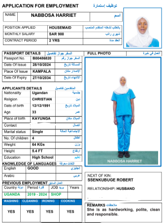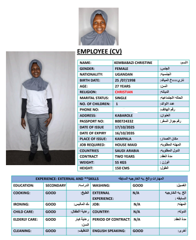 نوع الخدمة نوع الخدمة استقدام تأجير نقل خدمات الجنسية الجنسية الفلبين الهند مصر كينيا اثيوبيا بروندي بنغلاديش أوغندا أوغندا معروفة باكستان الفلبين معروفة اندونيسيا المهنة عاملة منزلية سائق خاص عاملة عناية زوجين ( عامله منزليه وسائق ) الديانة مسلم غير مسلم الخبرة سبق العمل لم يسبق العمل العمر العمر 15 16 17 18 19 20 21 22 23 24 25 26 27 28 29 30 31 32 33 34 35 36 37 38 39 40 41 42 43 44 45 46 47 48 49 50 51 52 53 54 55 56 57 58 59 60 الحالة العائلية الحالة العائلية اعزب متزوج مطلق ارمل اللغة اللغة العربية العربية العربية بنجالي نبالي فلبيني امهرية سواحلي عربي + لغتها الاساسية اندونيسي اوغندي بروندي الوزن الوزن 40 41 42 43 44 45 46 47 48 49 50 51 52 53 54 55 56 57 58 59 60 61 62 63 64 65 66 67 68 69 70 71 72 73 74 75 76 77 78 79 80 81 82 83 84 85 86 87 88 89 90 91 92 93 94 95 96 97 98 99 100 الطول الطول 100 101 102 103 104 105 106 107 108 109 110 111 112 113 114 115 116 117 118 119 120 121 122 123 124 125 126 127 128 129 130 131 132 133 134 135 136 137 138 139 140 141 142 143 144 145 146 147 148 149 150 151 152 153 154 155 156 157 158 159 160 161 162 163 164 165 166 167 168 169 170 171 172 173 174 175 176 177 178 179 180 181 182 183 184 185 186 187 188 189 190 الطلبات الطلبات التنظيف الغسيل الكوي الطبيخ العربي عناية الأطفال عناية كبار السن عناية الرضيع تعليم الأطفال التنظيف - الغسيل - الكوي التنظيف - الغسيل - الكوي- رغبة في تعلم الطبخ التنظيف - الغسيل - الكوي- رغبة في العناية بالاطفال بحث مسح بحث متقدم NAFUNGO JANE أوغندا العمر 38 الخبرة لم يسبق العمل الديانة غير مسلم رقم الملف B00620115 حجز العاملة NABBOSA HARRIET أوغندا العمر 34 الخبرة لم يسبق العمل الديانة غير مسلم رقم الملف B00486820 حجز العاملة NABAWAGGA EDITH أوغندا العمر 25 الخبرة لم يسبق العمل الديانة غير مسلم رقم الملف A00636149 حجز العاملة KYARISIIMA RUTH أوغندا العمر 28 الخبرة لم يسبق العمل الديانة غير مسلم رقم الملف A00623213 حجز العاملة APAI RACHEAL أوغندا العمر 37 الخبرة لم يسبق العمل الديانة غير مسلم رقم الملف A00373504 حجز العاملة ACHAMU FLORENCE أوغندا العمر 27 الخبرة لم يسبق العمل الديانة غير مسلم رقم الملف A00272033 حجز العاملة KEMBABAZI CHRISTINE أوغندا العمر 27 الخبرة لم يسبق العمل الديانة غير مسلم رقم الملف B00724332 حجز العاملة NYAWERE PEACE أوغندا العمر 25 الخبرة لم يسبق العمل الديانة غير مسلم رقم الملف B00458518 حجز العاملة KYARIMPA SYLIVIA أوغندا العمر 39 الخبرة لم يسبق العمل الديانة غير مسلم رقم الملف B00592544 حجز العاملة NIWAHREZA GRACE أوغندا العمر 24 الخبرة لم يسبق العمل الديانة غير مسلم رقم الملف B00684856 حجز العاملة 1 2 3 4 5 6 7