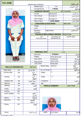 نوع الخدمة نوع الخدمة استقدام تأجير نقل خدمات الجنسية الجنسية الفلبين الهند مصر كينيا اثيوبيا بروندي بنغلاديش أوغندا أوغندا معروفة باكستان الفلبين معروفة اندونيسيا المهنة عاملة منزلية سائق خاص عاملة عناية زوجين ( عامله منزليه وسائق ) الديانة مسلم غير مسلم الخبرة سبق العمل لم يسبق العمل العمر العمر 15 16 17 18 19 20 21 22 23 24 25 26 27 28 29 30 31 32 33 34 35 36 37 38 39 40 41 42 43 44 45 46 47 48 49 50 51 52 53 54 55 56 57 58 59 60 الحالة العائلية الحالة العائلية اعزب متزوج مطلق ارمل اللغة اللغة العربية العربية العربية بنجالي نبالي فلبيني امهرية سواحلي عربي + لغتها الاساسية اندونيسي اوغندي بروندي الوزن الوزن 40 41 42 43 44 45 46 47 48 49 50 51 52 53 54 55 56 57 58 59 60 61 62 63 64 65 66 67 68 69 70 71 72 73 74 75 76 77 78 79 80 81 82 83 84 85 86 87 88 89 90 91 92 93 94 95 96 97 98 99 100 الطول الطول 100 101 102 103 104 105 106 107 108 109 110 111 112 113 114 115 116 117 118 119 120 121 122 123 124 125 126 127 128 129 130 131 132 133 134 135 136 137 138 139 140 141 142 143 144 145 146 147 148 149 150 151 152 153 154 155 156 157 158 159 160 161 162 163 164 165 166 167 168 169 170 171 172 173 174 175 176 177 178 179 180 181 182 183 184 185 186 187 188 189 190 الطلبات الطلبات التنظيف الغسيل الكوي الطبيخ العربي عناية الأطفال عناية كبار السن عناية الرضيع تعليم الأطفال التنظيف - الغسيل - الكوي التنظيف - الغسيل - الكوي- رغبة في تعلم الطبخ التنظيف - الغسيل - الكوي- رغبة في العناية بالاطفال بحث مسح بحث متقدم REHOBOT TEGESA TEMESGEN اثيوبيا العمر 26 الخبرة لم يسبق العمل الديانة غير مسلم رقم الملف EQ2061803 حجز العاملة MESI ABATE ASHA اثيوبيا العمر 24 الخبرة لم يسبق العمل الديانة غير مسلم رقم الملف EQ2323841 حجز العاملة MESKEREM EJIGU CHALI اثيوبيا العمر 22 الخبرة لم يسبق العمل الديانة غير مسلم رقم الملف EQ1167934 حجز العاملة MESAY MOLA MOLESA اثيوبيا العمر 21 الخبرة لم يسبق العمل الديانة غير مسلم رقم الملف EP7287919 حجز العاملة MEKDES SUGAMO ARFICHO اثيوبيا العمر 21 الخبرة لم يسبق العمل الديانة غير مسلم رقم الملف EP9296824 حجز العاملة KASECH WOLDE TAMIRE اثيوبيا العمر 24 الخبرة لم يسبق العمل الديانة غير مسلم رقم الملف EQ2342318 حجز العاملة AREGASH MOLA MOLISO اثيوبيا العمر 25 الخبرة لم يسبق العمل الديانة غير مسلم رقم الملف EP8998376 حجز العاملة MARESHET SISAY ALI اثيوبيا العمر 25 الخبرة لم يسبق العمل الديانة مسلم رقم الملف EQ2626498 حجز العاملة BONTU CHEMEDA ABERA اثيوبيا العمر 25 الخبرة لم يسبق العمل الديانة غير مسلم رقم الملف EQ2400930 حجز العاملة AYISHA SHIKUR KINDE اثيوبيا العمر 26 الخبرة لم يسبق العمل الديانة مسلم رقم الملف EQ1764751 حجز العاملة 12 13 14 15 16 17 18 19 20