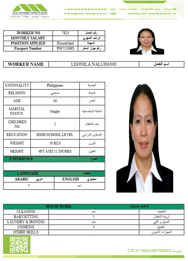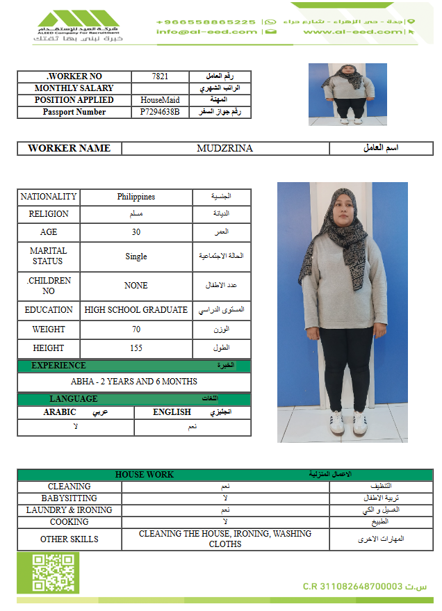 نوع الخدمة نوع الخدمة استقدام تأجير نقل خدمات الجنسية الجنسية الفلبين الهند مصر كينيا اثيوبيا بروندي بنغلاديش أوغندا أوغندا معروفة باكستان الفلبين معروفة اندونيسيا المهنة عاملة منزلية سائق خاص عاملة عناية زوجين ( عامله منزليه وسائق ) الديانة مسلم غير مسلم الخبرة سبق العمل لم يسبق العمل العمر العمر 15 16 17 18 19 20 21 22 23 24 25 26 27 28 29 30 31 32 33 34 35 36 37 38 39 40 41 42 43 44 45 46 47 48 49 50 51 52 53 54 55 56 57 58 59 60 الحالة العائلية الحالة العائلية اعزب متزوج مطلق ارمل اللغة اللغة العربية العربية العربية بنجالي نبالي فلبيني امهرية سواحلي عربي + لغتها الاساسية اندونيسي اوغندي بروندي الوزن الوزن 40 41 42 43 44 45 46 47 48 49 50 51 52 53 54 55 56 57 58 59 60 61 62 63 64 65 66 67 68 69 70 71 72 73 74 75 76 77 78 79 80 81 82 83 84 85 86 87 88 89 90 91 92 93 94 95 96 97 98 99 100 الطول الطول 100 101 102 103 104 105 106 107 108 109 110 111 112 113 114 115 116 117 118 119 120 121 122 123 124 125 126 127 128 129 130 131 132 133 134 135 136 137 138 139 140 141 142 143 144 145 146 147 148 149 150 151 152 153 154 155 156 157 158 159 160 161 162 163 164 165 166 167 168 169 170 171 172 173 174 175 176 177 178 179 180 181 182 183 184 185 186 187 188 189 190 الطلبات الطلبات التنظيف الغسيل الكوي الطبيخ العربي عناية الأطفال عناية كبار السن عناية الرضيع تعليم الأطفال التنظيف - الغسيل - الكوي التنظيف - الغسيل - الكوي- رغبة في تعلم الطبخ التنظيف - الغسيل - الكوي- رغبة في العناية بالاطفال بحث مسح بحث متقدم GOBENE WAKEYO JARSO اثيوبيا العمر 25 الخبرة لم يسبق العمل الديانة مسلم رقم الملف EQ2330933 حجز العاملة BETELHEM DAWIT MOJA اثيوبيا العمر 23 الخبرة لم يسبق العمل الديانة غير مسلم رقم الملف EQ1261745 حجز العاملة AYANTU SINBIRU NAMU اثيوبيا العمر 26 الخبرة لم يسبق العمل الديانة غير مسلم رقم الملف EQ1763623 حجز العاملة JEANETTE MENDEZ الفلبين العمر 44 الخبرة لم يسبق العمل الديانة غير مسلم رقم الملف P0933145D حجز العاملة JENNIFER ARCEO الفلبين العمر 28 الخبرة سبق العمل الديانة غير مسلم رقم الملف P6138170C حجز العاملة NENETHA الفلبين العمر 43 الخبرة لم يسبق العمل الديانة غير مسلم رقم الملف P0896076D حجز العاملة LEONILA NALUPANO الفلبين العمر 40 الخبرة لم يسبق العمل الديانة غير مسلم رقم الملف P0871396D حجز العاملة MUDZRINA الفلبين العمر 30 الخبرة سبق العمل الديانة مسلم رقم الملف P7294638B حجز العاملة BEKELU TOLA اثيوبيا العمر 21 الخبرة لم يسبق العمل الديانة غير مسلم رقم الملف EQ1057136 حجز العاملة TELILE DIRIBA DUGUSA اثيوبيا العمر 24 الخبرة لم يسبق العمل الديانة غير مسلم رقم الملف EQ1493879 حجز العاملة 1 2 3 4 5 6