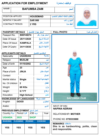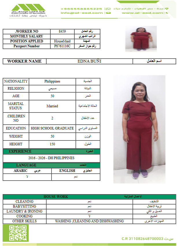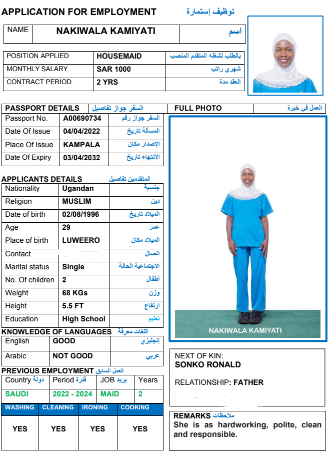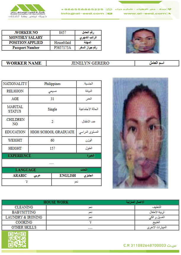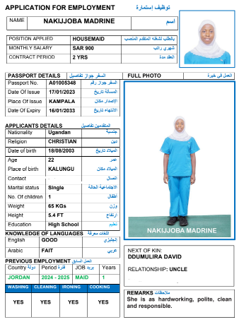 نوع الخدمة نوع الخدمة استقدام تأجير نقل خدمات الجنسية الجنسية الفلبين الهند مصر كينيا اثيوبيا بروندي بنغلاديش أوغندا أوغندا معروفة باكستان الفلبين معروفة اندونيسيا المهنة عاملة منزلية سائق خاص عاملة عناية زوجين ( عامله منزليه وسائق ) الديانة مسلم غير مسلم الخبرة سبق العمل لم يسبق العمل العمر العمر 15 16 17 18 19 20 21 22 23 24 25 26 27 28 29 30 31 32 33 34 35 36 37 38 39 40 41 42 43 44 45 46 47 48 49 50 51 52 53 54 55 56 57 58 59 60 الحالة العائلية الحالة العائلية اعزب متزوج مطلق ارمل اللغة اللغة العربية العربية العربية بنجالي نبالي فلبيني امهرية سواحلي عربي + لغتها الاساسية اندونيسي اوغندي بروندي الوزن الوزن 40 41 42 43 44 45 46 47 48 49 50 51 52 53 54 55 56 57 58 59 60 61 62 63 64 65 66 67 68 69 70 71 72 73 74 75 76 77 78 79 80 81 82 83 84 85 86 87 88 89 90 91 92 93 94 95 96 97 98 99 100 الطول الطول 100 101 102 103 104 105 106 107 108 109 110 111 112 113 114 115 116 117 118 119 120 121 122 123 124 125 126 127 128 129 130 131 132 133 134 135 136 137 138 139 140 141 142 143 144 145 146 147 148 149 150 151 152 153 154 155 156 157 158 159 160 161 162 163 164 165 166 167 168 169 170 171 172 173 174 175 176 177 178 179 180 181 182 183 184 185 186 187 188 189 190 الطلبات الطلبات التنظيف الغسيل الكوي الطبيخ العربي عناية الأطفال عناية كبار السن عناية الرضيع تعليم الأطفال التنظيف - الغسيل - الكوي التنظيف - الغسيل - الكوي- رغبة في تعلم الطبخ التنظيف - الغسيل - الكوي- رغبة في العناية بالاطفال بحث مسح بحث متقدم NANSAMBA JENIPHER أوغندا العمر 36 الخبرة لم يسبق العمل الديانة غير مسلم رقم الملف A00902246 حجز العاملة NAKIWALA KAMIYATI أوغندا العمر 28 الخبرة لم يسبق العمل الديانة مسلم رقم الملف A00690734 حجز العاملة NAKIJJOBA MADRINE أوغندا العمر 22 الخبرة لم يسبق العمل الديانة غير مسلم رقم الملف A01005348 حجز العاملة CHEPKWEMOI SARAH أوغندا العمر 27 الخبرة لم يسبق العمل الديانة غير مسلم رقم الملف B00493905 حجز العاملة BAFUMBA ZAM أوغندا العمر 23 الخبرة لم يسبق العمل الديانة مسلم رقم الملف B00749274 حجز العاملة EDNA BUÑI الفلبين العمر 50 الخبرة لم يسبق العمل الديانة غير مسلم رقم الملف P8761116C حجز العاملة فيديو تعريفي MARCELINA GINES الفلبين العمر 49 الخبرة سبق العمل الديانة غير مسلم رقم الملف P9083376C حجز العاملة فيديو تعريفي JENELYN GERERO الفلبين العمر 31 الخبرة لم يسبق العمل الديانة غير مسلم رقم الملف P5657175A حجز العاملة KYAWAYENDA IRENE أوغندا العمر 32 الخبرة لم يسبق العمل الديانة غير مسلم رقم الملف B00067433 حجز العاملة BAKUNDANA ZAITUN أوغندا العمر 25 الخبرة لم يسبق العمل الديانة مسلم رقم الملف B00794465 حجز العاملة 1 2 3 4 5 6