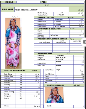 نوع الخدمة نوع الخدمة استقدام تأجير نقل خدمات الجنسية الجنسية الفلبين الهند مصر كينيا اثيوبيا بروندي بنغلاديش أوغندا أوغندا معروفة باكستان الفلبين معروفة اندونيسيا المهنة عاملة منزلية سائق خاص عاملة عناية زوجين ( عامله منزليه وسائق ) الديانة مسلم غير مسلم الخبرة سبق العمل لم يسبق العمل العمر العمر 15 16 17 18 19 20 21 22 23 24 25 26 27 28 29 30 31 32 33 34 35 36 37 38 39 40 41 42 43 44 45 46 47 48 49 50 51 52 53 54 55 56 57 58 59 60 الحالة العائلية الحالة العائلية اعزب متزوج مطلق ارمل اللغة اللغة العربية العربية العربية بنجالي نبالي فلبيني امهرية سواحلي عربي + لغتها الاساسية اندونيسي اوغندي بروندي الوزن الوزن 40 41 42 43 44 45 46 47 48 49 50 51 52 53 54 55 56 57 58 59 60 61 62 63 64 65 66 67 68 69 70 71 72 73 74 75 76 77 78 79 80 81 82 83 84 85 86 87 88 89 90 91 92 93 94 95 96 97 98 99 100 الطول الطول 100 101 102 103 104 105 106 107 108 109 110 111 112 113 114 115 116 117 118 119 120 121 122 123 124 125 126 127 128 129 130 131 132 133 134 135 136 137 138 139 140 141 142 143 144 145 146 147 148 149 150 151 152 153 154 155 156 157 158 159 160 161 162 163 164 165 166 167 168 169 170 171 172 173 174 175 176 177 178 179 180 181 182 183 184 185 186 187 188 189 190 الطلبات الطلبات التنظيف الغسيل الكوي الطبيخ العربي عناية الأطفال عناية كبار السن عناية الرضيع تعليم الأطفال التنظيف - الغسيل - الكوي التنظيف - الغسيل - الكوي- رغبة في تعلم الطبخ التنظيف - الغسيل - الكوي- رغبة في العناية بالاطفال بحث مسح بحث متقدم Tesfanesh dae dawuro اثيوبيا العمر 25 الخبرة لم يسبق العمل الديانة غير مسلم رقم الملف EQ1557691 حجز العاملة TIGIST GETACHOW ASFAW اثيوبيا العمر 22 الخبرة لم يسبق العمل الديانة غير مسلم رقم الملف EQ1960651 حجز العاملة TIGIST KENAW TADESE اثيوبيا العمر 25 الخبرة لم يسبق العمل الديانة غير مسلم رقم الملف EQ1659870 حجز العاملة TIGIST MELESE ALAMREW العمر 31 الخبرة لم يسبق العمل الديانة غير مسلم رقم الملف EP8841943 حجز العاملة TINSAYE TESHOME KASA اثيوبيا العمر 32 الخبرة لم يسبق العمل الديانة غير مسلم رقم الملف EP9346029 حجز العاملة MARU MUZE HASSEN اثيوبيا العمر 26 الخبرة لم يسبق العمل الديانة مسلم رقم الملف EQ1926156 حجز العاملة TSAHAYE TESSEMA SUGEBO اثيوبيا العمر 25 الخبرة لم يسبق العمل الديانة غير مسلم رقم الملف EQ2243638 حجز العاملة TSEGANESH SEMON MENTA اثيوبيا العمر 35 الخبرة لم يسبق العمل الديانة غير مسلم رقم الملف EP9256071 حجز العاملة WELANSA BIRU GUDETA اثيوبيا العمر 24 الخبرة لم يسبق العمل الديانة غير مسلم رقم الملف EP8379690 حجز العاملة WESENE JIDA ALEMU اثيوبيا العمر 27 الخبرة لم يسبق العمل الديانة غير مسلم رقم الملف EP8875265 حجز العاملة 25 26 27 28 29 30 31 32 33