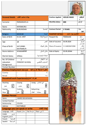 نوع الخدمة نوع الخدمة استقدام تأجير نقل خدمات الجنسية الجنسية الفلبين الهند مصر كينيا اثيوبيا بروندي بنغلاديش أوغندا أوغندا معروفة باكستان الفلبين معروفة اندونيسيا المهنة عاملة منزلية سائق خاص عاملة عناية زوجين ( عامله منزليه وسائق ) الديانة مسلم غير مسلم الخبرة سبق العمل لم يسبق العمل العمر العمر 15 16 17 18 19 20 21 22 23 24 25 26 27 28 29 30 31 32 33 34 35 36 37 38 39 40 41 42 43 44 45 46 47 48 49 50 51 52 53 54 55 56 57 58 59 60 الحالة العائلية الحالة العائلية اعزب متزوج مطلق ارمل اللغة اللغة العربية العربية العربية بنجالي نبالي فلبيني امهرية سواحلي عربي + لغتها الاساسية اندونيسي اوغندي بروندي الوزن الوزن 40 41 42 43 44 45 46 47 48 49 50 51 52 53 54 55 56 57 58 59 60 61 62 63 64 65 66 67 68 69 70 71 72 73 74 75 76 77 78 79 80 81 82 83 84 85 86 87 88 89 90 91 92 93 94 95 96 97 98 99 100 الطول الطول 100 101 102 103 104 105 106 107 108 109 110 111 112 113 114 115 116 117 118 119 120 121 122 123 124 125 126 127 128 129 130 131 132 133 134 135 136 137 138 139 140 141 142 143 144 145 146 147 148 149 150 151 152 153 154 155 156 157 158 159 160 161 162 163 164 165 166 167 168 169 170 171 172 173 174 175 176 177 178 179 180 181 182 183 184 185 186 187 188 189 190 الطلبات الطلبات التنظيف الغسيل الكوي الطبيخ العربي عناية الأطفال عناية كبار السن عناية الرضيع تعليم الأطفال التنظيف - الغسيل - الكوي التنظيف - الغسيل - الكوي- رغبة في تعلم الطبخ التنظيف - الغسيل - الكوي- رغبة في العناية بالاطفال بحث مسح بحث متقدم ANITHE NISHIMWE بروندي العمر 25 الخبرة لم يسبق العمل الديانة غير مسلم رقم الملف P00223249 حجز العاملة EMMANUELLA NIYONKURU العمر 28 الخبرة لم يسبق العمل الديانة مسلم رقم الملف P00092305 حجز العاملة MARC NDIHOKUBWAYO بروندي العمر 35 الخبرة لم يسبق العمل الديانة غير مسلم رقم الملف P00103255 حجز العاملة AUDREILLE NDUWIMANA بروندي العمر 25 الخبرة لم يسبق العمل الديانة مسلم رقم الملف P00090622 حجز العاملة NIYOYUNGA AGNES بروندي العمر 27 الخبرة لم يسبق العمل الديانة مسلم رقم الملف P00082904 حجز العاملة TUYISENGE EMELYNE بروندي العمر 27 الخبرة لم يسبق العمل الديانة مسلم رقم الملف P00127417 حجز العاملة NALUBEGA JOANITA أوغندا العمر 37 الخبرة لم يسبق العمل الديانة غير مسلم رقم الملف A00387981 حجز العاملة ASIIMWE LOYCE أوغندا العمر 22 الخبرة لم يسبق العمل الديانة غير مسلم رقم الملف B00664514 حجز العاملة KHBUYA WINNIE أوغندا العمر 22 الخبرة لم يسبق العمل الديانة غير مسلم رقم الملف B00661291 حجز العاملة NAMATOVU HAJARA أوغندا العمر 15 الخبرة لم يسبق العمل الديانة مسلم رقم الملف A00948594 حجز العاملة 35 36 37 38 39 40 41 42 43