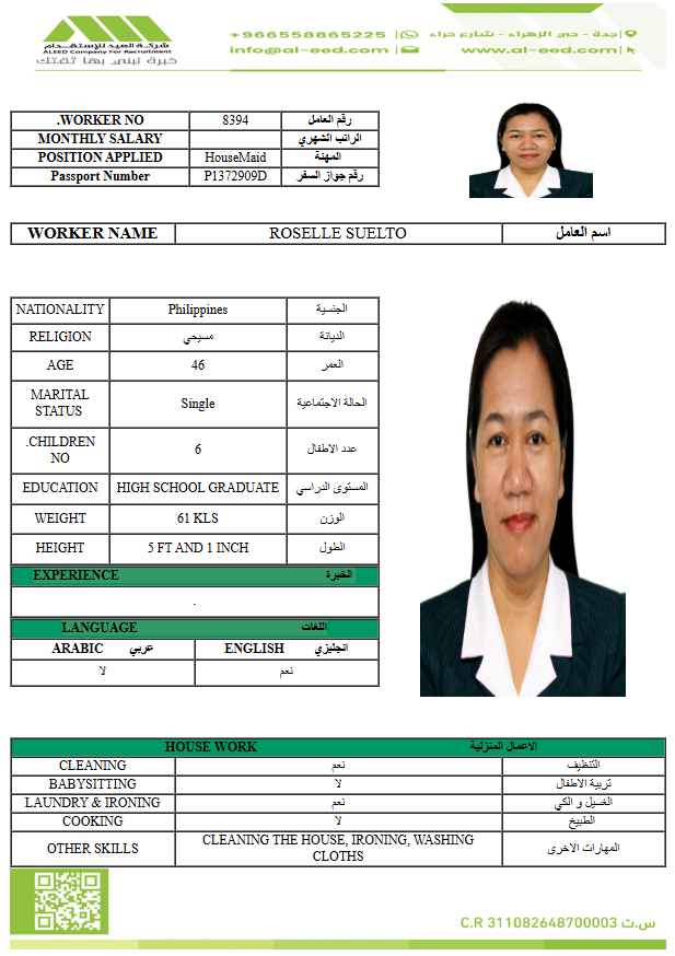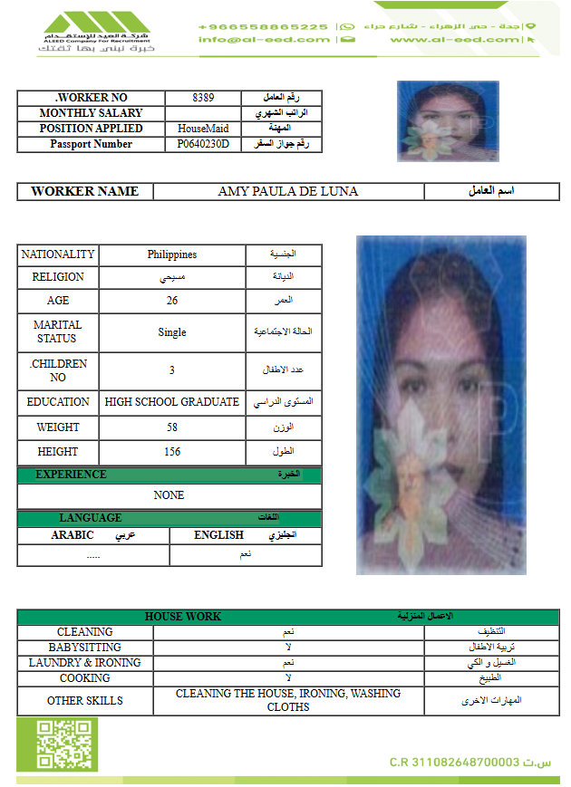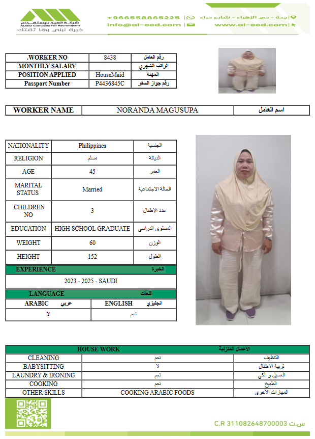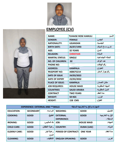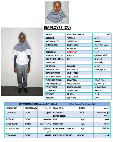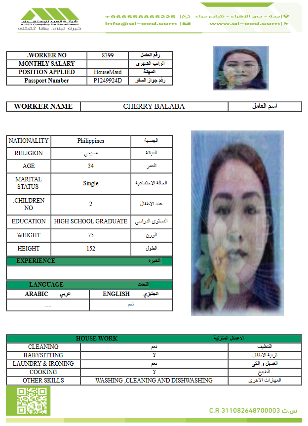 نوع الخدمة نوع الخدمة استقدام تأجير نقل خدمات الجنسية الجنسية الفلبين الهند مصر كينيا اثيوبيا بروندي بنغلاديش أوغندا أوغندا معروفة باكستان الفلبين معروفة اندونيسيا المهنة عاملة منزلية سائق خاص عاملة عناية زوجين ( عامله منزليه وسائق ) الديانة مسلم غير مسلم الخبرة سبق العمل لم يسبق العمل العمر العمر 15 16 17 18 19 20 21 22 23 24 25 26 27 28 29 30 31 32 33 34 35 36 37 38 39 40 41 42 43 44 45 46 47 48 49 50 51 52 53 54 55 56 57 58 59 60 الحالة العائلية الحالة العائلية اعزب متزوج مطلق ارمل اللغة اللغة العربية العربية العربية بنجالي نبالي فلبيني امهرية سواحلي عربي + لغتها الاساسية اندونيسي اوغندي بروندي الوزن الوزن 40 41 42 43 44 45 46 47 48 49 50 51 52 53 54 55 56 57 58 59 60 61 62 63 64 65 66 67 68 69 70 71 72 73 74 75 76 77 78 79 80 81 82 83 84 85 86 87 88 89 90 91 92 93 94 95 96 97 98 99 100 الطول الطول 100 101 102 103 104 105 106 107 108 109 110 111 112 113 114 115 116 117 118 119 120 121 122 123 124 125 126 127 128 129 130 131 132 133 134 135 136 137 138 139 140 141 142 143 144 145 146 147 148 149 150 151 152 153 154 155 156 157 158 159 160 161 162 163 164 165 166 167 168 169 170 171 172 173 174 175 176 177 178 179 180 181 182 183 184 185 186 187 188 189 190 الطلبات الطلبات التنظيف الغسيل الكوي الطبيخ العربي عناية الأطفال عناية كبار السن عناية الرضيع تعليم الأطفال التنظيف - الغسيل - الكوي التنظيف - الغسيل - الكوي- رغبة في تعلم الطبخ التنظيف - الغسيل - الكوي- رغبة في العناية بالاطفال بحث مسح بحث متقدم NORANDA MAGUSUPA الفلبين العمر 45 الخبرة سبق العمل الديانة مسلم رقم الملف P4436845C حجز العاملة CHERRY BALABA الفلبين العمر 34 الخبرة لم يسبق العمل الديانة غير مسلم رقم الملف P1249924D حجز العاملة NYEMERA JALIA أوغندا العمر 25 الخبرة لم يسبق العمل الديانة مسلم رقم الملف B00788837 حجز العاملة NAJJUKO IREN أوغندا العمر 39 الخبرة لم يسبق العمل الديانة غير مسلم رقم الملف B00578551 حجز العاملة ALUKA BETTY أوغندا العمر 33 الخبرة لم يسبق العمل الديانة غير مسلم رقم الملف B00688372 حجز العاملة AMY PAULA DE LUNA الفلبين العمر 26 الخبرة لم يسبق العمل الديانة غير مسلم رقم الملف P0640230D حجز العاملة ROSELLE SUELTO الفلبين العمر 46 الخبرة لم يسبق العمل الديانة غير مسلم رقم الملف P1372909D حجز العاملة TUHAISE ROSE KAMULI أوغندا العمر 32 الخبرة لم يسبق العمل الديانة غير مسلم رقم الملف A00675214 حجز العاملة NAKIWALA PROSCOVIA أوغندا العمر 39 الخبرة لم يسبق العمل الديانة غير مسلم رقم الملف A00126585 حجز العاملة NAIKOBA ESTHER أوغندا العمر 33 الخبرة لم يسبق العمل الديانة غير مسلم رقم الملف B00777013 حجز العاملة 1 2 3 4 5 6 7 8