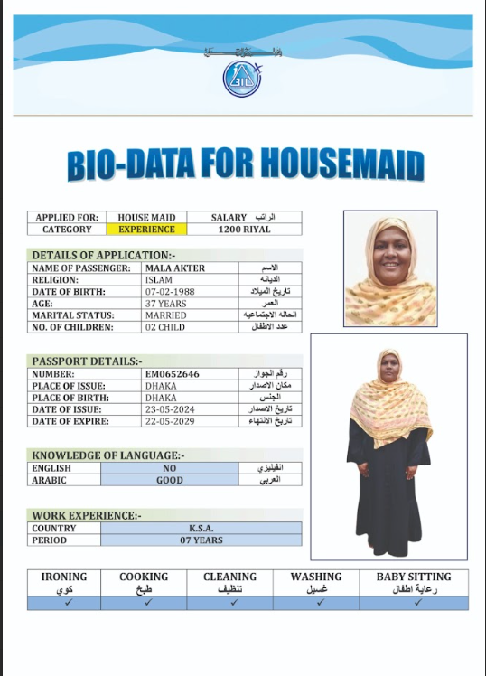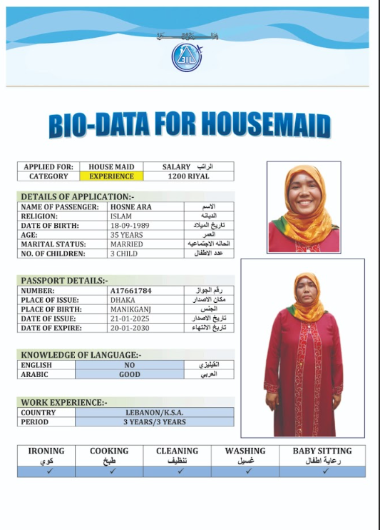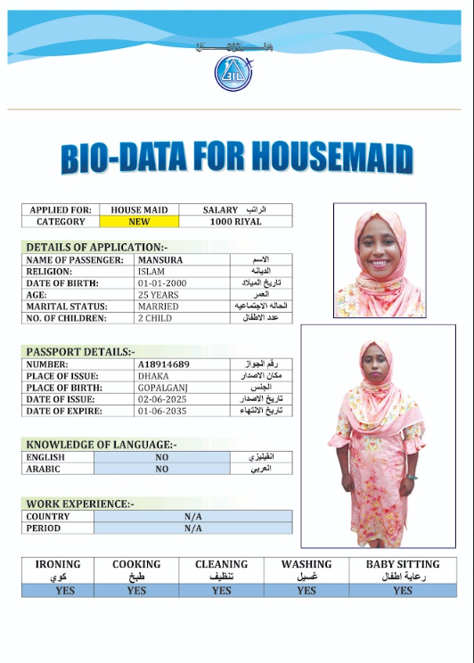 Service Type Service Type Recruitment Rent Transfer Services Nationality Nationality Philippines India Egypt Kenya Ethiopia Burundi Bangladesh Uganda Uganda MAROFFA Pakistan Philippines Indonesia Career Housemaid Family driver Care GIVER Couple (DRIVER AND DH ) Religion Muslim Non-Muslim Choose Experience Previous Work Never Worked Age Age 15 16 17 18 19 20 21 22 23 24 25 26 27 28 29 30 31 32 33 34 35 36 37 38 39 40 41 42 43 44 45 46 47 48 49 50 51 52 53 54 55 56 57 58 59 60 Family Status Family Status Single Married Divorced Widowed Language Language Arabic Arabic Arabic Bengali Nepalese Filipino Amharic Swahili Arabic + its primary language Indonesian Ugandan Burundi Weight Weight 40 41 42 43 44 45 46 47 48 49 50 51 52 53 54 55 56 57 58 59 60 61 62 63 64 65 66 67 68 69 70 71 72 73 74 75 76 77 78 79 80 81 82 83 84 85 86 87 88 89 90 91 92 93 94 95 96 97 98 99 100 Height Height 100 101 102 103 104 105 106 107 108 109 110 111 112 113 114 115 116 117 118 119 120 121 122 123 124 125 126 127 128 129 130 131 132 133 134 135 136 137 138 139 140 141 142 143 144 145 146 147 148 149 150 151 152 153 154 155 156 157 158 159 160 161 162 163 164 165 166 167 168 169 170 171 172 173 174 175 176 177 178 179 180 181 182 183 184 185 186 187 188 189 190 Orders Orders Cleaning Laundry Ironing Arab Cooking Child Care Child Appearance Care Infant Care Child Education Cleaning - Washing - Ironing Cleaning - Washing - Ironing - Desire to learn cooking Cleaning - Washing - Ironing - Desire to take care of children Search Clear Advanced Search MANSURA بنغلاديش Age 25 Experince Never Worked Relegion Muslim File Number A18914689 Reserve the worker MALA AKTER بنغلاديش Age 37 Experince Never Worked Relegion Muslim File Number EM0652646 Reserve the worker KULSUM BEGUM بنغلاديش Age 34 Experince Never Worked Relegion Muslim File Number A13666534 Reserve the worker HOSNE ARA بنغلاديش Age 35 Experince Never Worked Relegion Muslim File Number A17661784 Reserve the worker HASNA HENA بنغلاديش Age 35 Experince Never Worked Relegion Muslim File Number A03980442 Reserve the worker AYESHA AKTER بنغلاديش Age 33 Experince Never Worked Relegion Muslim File Number EL0319999 Reserve the worker ALICE NDUWIMANA بروندي Age 36 Experince Never Worked Relegion Muslim File Number P00132965 Reserve the worker AMBIA BEGUM بنغلاديش Age 36 Experince Never Worked Relegion Muslim File Number A04064737 Reserve the worker KETHIA NDIKUMANA بروندي Age 25 Experince Never Worked Relegion Non-Muslim File Number OP0319617 Reserve the worker ALINE NDAYISENGA بروندي Age 29 Experince Never Worked Relegion Muslim File Number P00133398 Reserve the worker 44 45 46 47 48 49 50 51 52