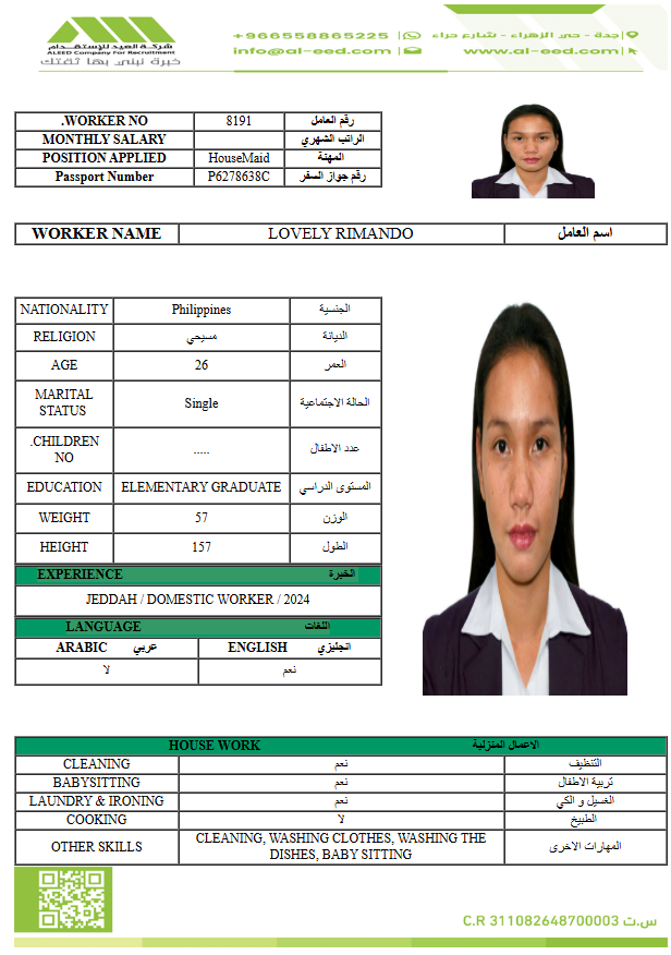 نوع الخدمة نوع الخدمة استقدام تأجير نقل خدمات الجنسية الجنسية الفلبين الهند مصر كينيا اثيوبيا بروندي بنغلاديش أوغندا أوغندا معروفة باكستان الفلبين معروفة اندونيسيا المهنة عاملة منزلية سائق خاص عاملة عناية زوجين ( عامله منزليه وسائق ) الديانة مسلم غير مسلم الخبرة سبق العمل لم يسبق العمل العمر العمر 15 16 17 18 19 20 21 22 23 24 25 26 27 28 29 30 31 32 33 34 35 36 37 38 39 40 41 42 43 44 45 46 47 48 49 50 51 52 53 54 55 56 57 58 59 60 الحالة العائلية الحالة العائلية اعزب متزوج مطلق ارمل اللغة اللغة العربية العربية العربية بنجالي نبالي فلبيني امهرية سواحلي عربي + لغتها الاساسية اندونيسي اوغندي بروندي الوزن الوزن 40 41 42 43 44 45 46 47 48 49 50 51 52 53 54 55 56 57 58 59 60 61 62 63 64 65 66 67 68 69 70 71 72 73 74 75 76 77 78 79 80 81 82 83 84 85 86 87 88 89 90 91 92 93 94 95 96 97 98 99 100 الطول الطول 100 101 102 103 104 105 106 107 108 109 110 111 112 113 114 115 116 117 118 119 120 121 122 123 124 125 126 127 128 129 130 131 132 133 134 135 136 137 138 139 140 141 142 143 144 145 146 147 148 149 150 151 152 153 154 155 156 157 158 159 160 161 162 163 164 165 166 167 168 169 170 171 172 173 174 175 176 177 178 179 180 181 182 183 184 185 186 187 188 189 190 الطلبات الطلبات التنظيف الغسيل الكوي الطبيخ العربي عناية الأطفال عناية كبار السن عناية الرضيع تعليم الأطفال التنظيف - الغسيل - الكوي التنظيف - الغسيل - الكوي- رغبة في تعلم الطبخ التنظيف - الغسيل - الكوي- رغبة في العناية بالاطفال بحث مسح بحث متقدم HUSNARA بنغلاديش العمر 35 الخبرة لم يسبق العمل الديانة مسلم رقم الملف A16679914 حجز العاملة FATEMA BEGUM بنغلاديش العمر 36 الخبرة لم يسبق العمل الديانة مسلم رقم الملف A17638721 حجز العاملة ASMA BEGUM بنغلاديش العمر 35 الخبرة لم يسبق العمل الديانة مسلم رقم الملف A08497151 حجز العاملة NINSIIMA MAVICE أوغندا العمر 34 الخبرة لم يسبق العمل الديانة غير مسلم رقم الملف B00567170 حجز العاملة LOVELY BUMAGAT الفلبين العمر 26 الخبرة سبق العمل الديانة غير مسلم رقم الملف P6278638C حجز العاملة TURYASIIMA MARION JOY أوغندا العمر 26 الخبرة لم يسبق العمل الديانة غير مسلم رقم الملف A00672461 حجز العاملة NAMULONDO ALIMA أوغندا العمر 33 الخبرة لم يسبق العمل الديانة غير مسلم رقم الملف B00448095 حجز العاملة NAMUKWAYA JUDITH أوغندا العمر 30 الخبرة لم يسبق العمل الديانة غير مسلم رقم الملف B00393811 حجز العاملة NAMUKASA BETTY أوغندا العمر 30 الخبرة لم يسبق العمل الديانة غير مسلم رقم الملف B00328936 حجز العاملة NAMUGIZI ALICE أوغندا العمر 27 الخبرة لم يسبق العمل الديانة غير مسلم رقم الملف A00710428 حجز العاملة 52 53 54 55 56 57 58 59 60