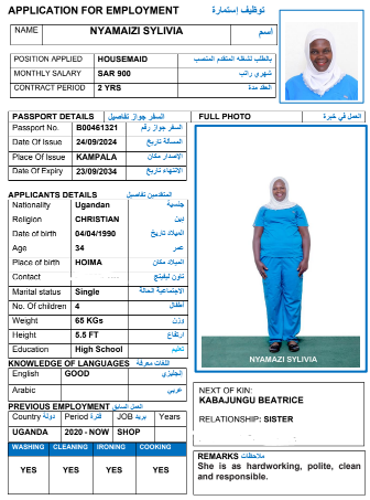 نوع الخدمة نوع الخدمة استقدام تأجير نقل خدمات الجنسية الجنسية الفلبين الهند مصر كينيا اثيوبيا بروندي بنغلاديش أوغندا أوغندا معروفة باكستان الفلبين معروفة اندونيسيا المهنة عاملة منزلية سائق خاص عاملة عناية زوجين ( عامله منزليه وسائق ) الديانة مسلم غير مسلم الخبرة سبق العمل لم يسبق العمل العمر العمر 15 16 17 18 19 20 21 22 23 24 25 26 27 28 29 30 31 32 33 34 35 36 37 38 39 40 41 42 43 44 45 46 47 48 49 50 51 52 53 54 55 56 57 58 59 60 الحالة العائلية الحالة العائلية اعزب متزوج مطلق ارمل اللغة اللغة العربية العربية العربية بنجالي نبالي فلبيني امهرية سواحلي عربي + لغتها الاساسية اندونيسي اوغندي بروندي الوزن الوزن 40 41 42 43 44 45 46 47 48 49 50 51 52 53 54 55 56 57 58 59 60 61 62 63 64 65 66 67 68 69 70 71 72 73 74 75 76 77 78 79 80 81 82 83 84 85 86 87 88 89 90 91 92 93 94 95 96 97 98 99 100 الطول الطول 100 101 102 103 104 105 106 107 108 109 110 111 112 113 114 115 116 117 118 119 120 121 122 123 124 125 126 127 128 129 130 131 132 133 134 135 136 137 138 139 140 141 142 143 144 145 146 147 148 149 150 151 152 153 154 155 156 157 158 159 160 161 162 163 164 165 166 167 168 169 170 171 172 173 174 175 176 177 178 179 180 181 182 183 184 185 186 187 188 189 190 الطلبات الطلبات التنظيف الغسيل الكوي الطبيخ العربي عناية الأطفال عناية كبار السن عناية الرضيع تعليم الأطفال التنظيف - الغسيل - الكوي التنظيف - الغسيل - الكوي- رغبة في تعلم الطبخ التنظيف - الغسيل - الكوي- رغبة في العناية بالاطفال بحث مسح بحث متقدم FABIAN ZAWADI JAMES كينيا العمر 29 الخبرة لم يسبق العمل الديانة غير مسلم رقم الملف AK485275 حجز العاملة NATOBO SARAH أوغندا العمر 25 الخبرة لم يسبق العمل الديانة غير مسلم رقم الملف B00532804 حجز العاملة NAMBOZO ZAUJA أوغندا العمر 32 الخبرة لم يسبق العمل الديانة مسلم رقم الملف B00466289 حجز العاملة NAMUGAYA MERCY أوغندا العمر 23 الخبرة لم يسبق العمل الديانة غير مسلم رقم الملف B00270358 حجز العاملة NAKIBUKA BEATRICE أوغندا العمر 26 الخبرة لم يسبق العمل الديانة غير مسلم رقم الملف B00304461 حجز العاملة NYAMAIZI SYLIVIA أوغندا العمر 34 الخبرة لم يسبق العمل الديانة غير مسلم رقم الملف B00461321 حجز العاملة AKECTH JANE BORIS أوغندا العمر 37 الخبرة لم يسبق العمل الديانة غير مسلم رقم الملف B00331446 حجز العاملة BALEKE JANE أوغندا العمر 30 الخبرة لم يسبق العمل الديانة غير مسلم رقم الملف B00290982 حجز العاملة NATUKUNDA PROSSY أوغندا العمر 26 الخبرة لم يسبق العمل الديانة غير مسلم رقم الملف B00453265 حجز العاملة NAMWANJE BABIRYE BETTY أوغندا العمر 30 الخبرة لم يسبق العمل الديانة غير مسلم رقم الملف B00386122 حجز العاملة 54 55 56 57 58 59 60 61