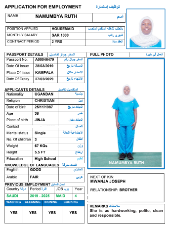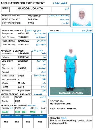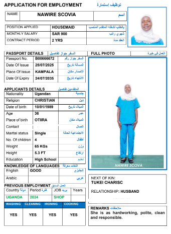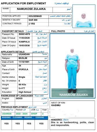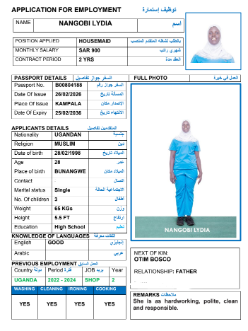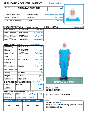 نوع الخدمة نوع الخدمة استقدام تأجير نقل خدمات الجنسية الجنسية الفلبين الهند مصر كينيا اثيوبيا بروندي بنغلاديش أوغندا أوغندا معروفة باكستان الفلبين معروفة اندونيسيا المهنة عاملة منزلية سائق خاص عاملة عناية زوجين ( عامله منزليه وسائق ) الديانة مسلم غير مسلم الخبرة سبق العمل لم يسبق العمل العمر العمر 15 16 17 18 19 20 21 22 23 24 25 26 27 28 29 30 31 32 33 34 35 36 37 38 39 40 41 42 43 44 45 46 47 48 49 50 51 52 53 54 55 56 57 58 59 60 الحالة العائلية الحالة العائلية اعزب متزوج مطلق ارمل اللغة اللغة العربية العربية العربية بنجالي نبالي فلبيني امهرية سواحلي عربي + لغتها الاساسية اندونيسي اوغندي بروندي الوزن الوزن 40 41 42 43 44 45 46 47 48 49 50 51 52 53 54 55 56 57 58 59 60 61 62 63 64 65 66 67 68 69 70 71 72 73 74 75 76 77 78 79 80 81 82 83 84 85 86 87 88 89 90 91 92 93 94 95 96 97 98 99 100 الطول الطول 100 101 102 103 104 105 106 107 108 109 110 111 112 113 114 115 116 117 118 119 120 121 122 123 124 125 126 127 128 129 130 131 132 133 134 135 136 137 138 139 140 141 142 143 144 145 146 147 148 149 150 151 152 153 154 155 156 157 158 159 160 161 162 163 164 165 166 167 168 169 170 171 172 173 174 175 176 177 178 179 180 181 182 183 184 185 186 187 188 189 190 الطلبات الطلبات التنظيف الغسيل الكوي الطبيخ العربي عناية الأطفال عناية كبار السن عناية الرضيع تعليم الأطفال التنظيف - الغسيل - الكوي التنظيف - الغسيل - الكوي- رغبة في تعلم الطبخ التنظيف - الغسيل - الكوي- رغبة في العناية بالاطفال بحث مسح بحث متقدم NANGOBI MOREEN أوغندا العمر 25 الخبرة لم يسبق العمل الديانة غير مسلم رقم الملف B00820840 حجز العاملة NANGOBI JOANITA أوغندا العمر 25 الخبرة لم يسبق العمل الديانة غير مسلم رقم الملف A00451565 حجز العاملة NAMUKOSE ZULAIKA أوغندا العمر 34 الخبرة لم يسبق العمل الديانة مسلم رقم الملف B00814978 حجز العاملة NAMUKOSE ZABINAH أوغندا العمر 36 الخبرة لم يسبق العمل الديانة مسلم رقم الملف A00406730 حجز العاملة NAMMIIRO SHAKIRAH أوغندا العمر 24 الخبرة لم يسبق العمل الديانة مسلم رقم الملف B00821131 حجز العاملة NABATANZI GRACE أوغندا العمر 25 الخبرة لم يسبق العمل الديانة غير مسلم رقم الملف B00823526 حجز العاملة NYADOI BARBRAH أوغندا العمر 27 الخبرة لم يسبق العمل الديانة غير مسلم رقم الملف B00780533 حجز العاملة NAWIRE SCOVIA أوغندا العمر 36 الخبرة لم يسبق العمل الديانة غير مسلم رقم الملف B00666672 حجز العاملة NANGOBI LYDIA أوغندا العمر 28 الخبرة لم يسبق العمل الديانة غير مسلم رقم الملف B00804188 حجز العاملة NAMUMBYA RUTH أوغندا العمر 38 الخبرة لم يسبق العمل الديانة غير مسلم رقم الملف A00046479 حجز العاملة 1 2 3 4