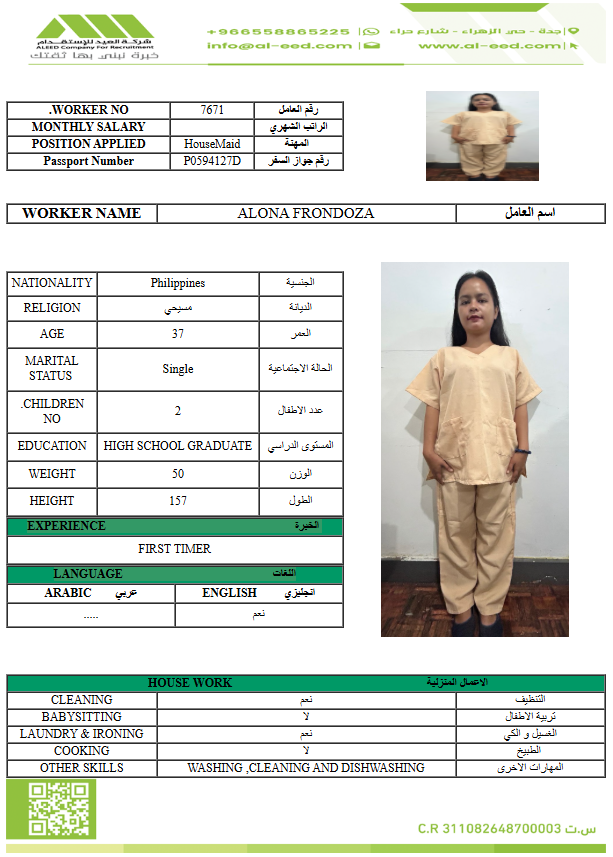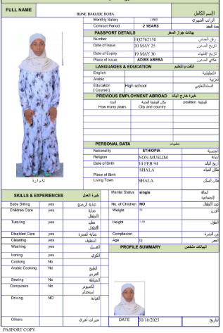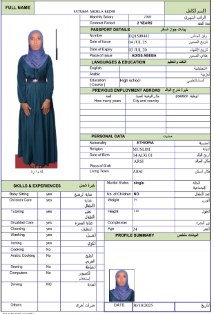 نوع الخدمة نوع الخدمة استقدام تأجير نقل خدمات الجنسية الجنسية الفلبين الهند مصر كينيا اثيوبيا بروندي بنغلاديش أوغندا أوغندا معروفة باكستان الفلبين معروفة اندونيسيا المهنة عاملة منزلية سائق خاص عاملة عناية زوجين ( عامله منزليه وسائق ) الديانة مسلم غير مسلم الخبرة سبق العمل لم يسبق العمل العمر العمر 15 16 17 18 19 20 21 22 23 24 25 26 27 28 29 30 31 32 33 34 35 36 37 38 39 40 41 42 43 44 45 46 47 48 49 50 51 52 53 54 55 56 57 58 59 60 الحالة العائلية الحالة العائلية اعزب متزوج مطلق ارمل اللغة اللغة العربية العربية العربية بنجالي نبالي فلبيني امهرية سواحلي عربي + لغتها الاساسية اندونيسي اوغندي بروندي الوزن الوزن 40 41 42 43 44 45 46 47 48 49 50 51 52 53 54 55 56 57 58 59 60 61 62 63 64 65 66 67 68 69 70 71 72 73 74 75 76 77 78 79 80 81 82 83 84 85 86 87 88 89 90 91 92 93 94 95 96 97 98 99 100 الطول الطول 100 101 102 103 104 105 106 107 108 109 110 111 112 113 114 115 116 117 118 119 120 121 122 123 124 125 126 127 128 129 130 131 132 133 134 135 136 137 138 139 140 141 142 143 144 145 146 147 148 149 150 151 152 153 154 155 156 157 158 159 160 161 162 163 164 165 166 167 168 169 170 171 172 173 174 175 176 177 178 179 180 181 182 183 184 185 186 187 188 189 190 الطلبات الطلبات التنظيف الغسيل الكوي الطبيخ العربي عناية الأطفال عناية كبار السن عناية الرضيع تعليم الأطفال التنظيف - الغسيل - الكوي التنظيف - الغسيل - الكوي- رغبة في تعلم الطبخ التنظيف - الغسيل - الكوي- رغبة في العناية بالاطفال بحث مسح بحث متقدم FATUMA ABDELA KEDIR اثيوبيا العمر 24 الخبرة لم يسبق العمل الديانة مسلم رقم الملف EQ1509441 حجز العاملة ERAHMET TESFAYE MEKOYE اثيوبيا العمر 25 الخبرة لم يسبق العمل الديانة مسلم رقم الملف EQ2034639 حجز العاملة CHALTU JEMAL KASIM اثيوبيا العمر 25 الخبرة لم يسبق العمل الديانة مسلم رقم الملف EQ1118617 حجز العاملة BUNE BAKUDE ROBA اثيوبيا العمر 31 الخبرة لم يسبق العمل الديانة غير مسلم رقم الملف EQ2762150 حجز العاملة BIRKE MARU BOKU اثيوبيا العمر 34 الخبرة لم يسبق العمل الديانة غير مسلم رقم الملف EP8571256 حجز العاملة AMINAT ENDRIS KEMAL اثيوبيا العمر 21 الخبرة لم يسبق العمل الديانة مسلم رقم الملف EP9098116 حجز العاملة ALONA FRONDOZA الفلبين العمر 37 الخبرة لم يسبق العمل الديانة غير مسلم رقم الملف P0594127D حجز العاملة DIVINAH KERUBO MOGAKA كينيا العمر 29 الخبرة لم يسبق العمل الديانة غير مسلم رقم الملف AK1031082 حجز العاملة KANZE CHARO KALAMA كينيا العمر 29 الخبرة سبق العمل الديانة غير مسلم رقم الملف BK308058 حجز العاملة KEMBABAZI CHRISTINE أوغندا العمر 27 الخبرة لم يسبق العمل الديانة غير مسلم رقم الملف B00724332 حجز العاملة 9 10 11 12 13 14 15 16 17