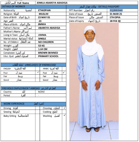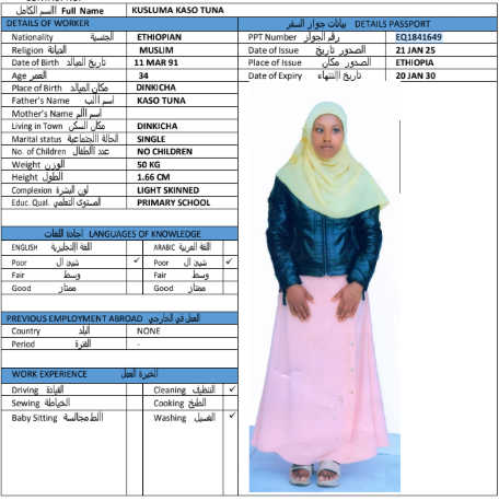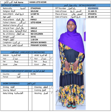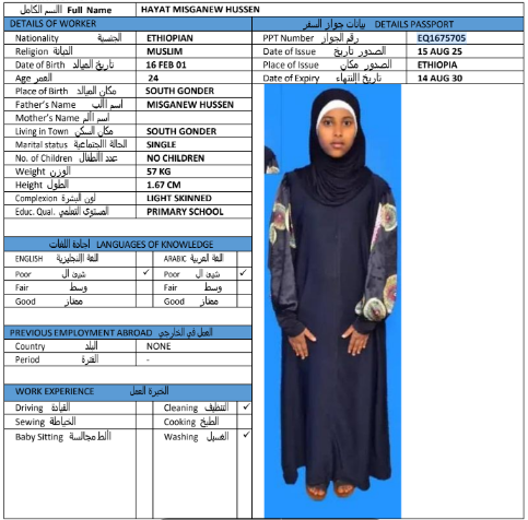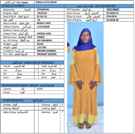 نوع الخدمة نوع الخدمة استقدام تأجير نقل خدمات الجنسية الجنسية الفلبين الهند مصر كينيا اثيوبيا بروندي بنغلاديش أوغندا أوغندا معروفة باكستان الفلبين معروفة اندونيسيا المهنة عاملة منزلية سائق خاص عاملة عناية زوجين ( عامله منزليه وسائق ) الديانة مسلم غير مسلم الخبرة سبق العمل لم يسبق العمل العمر العمر 15 16 17 18 19 20 21 22 23 24 25 26 27 28 29 30 31 32 33 34 35 36 37 38 39 40 41 42 43 44 45 46 47 48 49 50 51 52 53 54 55 56 57 58 59 60 الحالة العائلية الحالة العائلية اعزب متزوج مطلق ارمل اللغة اللغة العربية العربية العربية بنجالي نبالي فلبيني امهرية سواحلي عربي + لغتها الاساسية اندونيسي اوغندي بروندي الوزن الوزن 40 41 42 43 44 45 46 47 48 49 50 51 52 53 54 55 56 57 58 59 60 61 62 63 64 65 66 67 68 69 70 71 72 73 74 75 76 77 78 79 80 81 82 83 84 85 86 87 88 89 90 91 92 93 94 95 96 97 98 99 100 الطول الطول 100 101 102 103 104 105 106 107 108 109 110 111 112 113 114 115 116 117 118 119 120 121 122 123 124 125 126 127 128 129 130 131 132 133 134 135 136 137 138 139 140 141 142 143 144 145 146 147 148 149 150 151 152 153 154 155 156 157 158 159 160 161 162 163 164 165 166 167 168 169 170 171 172 173 174 175 176 177 178 179 180 181 182 183 184 185 186 187 188 189 190 الطلبات الطلبات التنظيف الغسيل الكوي الطبيخ العربي عناية الأطفال عناية كبار السن عناية الرضيع تعليم الأطفال التنظيف - الغسيل - الكوي التنظيف - الغسيل - الكوي- رغبة في تعلم الطبخ التنظيف - الغسيل - الكوي- رغبة في العناية بالاطفال بحث مسح بحث متقدم MEDINA MOHAMMED DUNA اثيوبيا العمر 32 الخبرة لم يسبق العمل الديانة مسلم رقم الملف EQ1038699 حجز العاملة MABRUKA ABADER ABAMILKI اثيوبيا العمر 23 الخبرة لم يسبق العمل الديانة مسلم رقم الملف EP9049082 حجز العاملة LEMLEM ALE DEJEN اثيوبيا العمر 23 الخبرة لم يسبق العمل الديانة غير مسلم رقم الملف EP8123668 حجز العاملة KUSLUMA KASO TUNA اثيوبيا العمر 34 الخبرة لم يسبق العمل الديانة مسلم رقم الملف EQ1841649 حجز العاملة JEMILA ABAREYA ABADIGA اثيوبيا العمر 23 الخبرة لم يسبق العمل الديانة مسلم رقم الملف EQ2083560 حجز العاملة JEMILA LETO KEDIR اثيوبيا العمر 23 الخبرة لم يسبق العمل الديانة مسلم رقم الملف EQ2148804 حجز العاملة HAYAT MISGANEW HUSSEN اثيوبيا العمر 24 الخبرة لم يسبق العمل الديانة مسلم رقم الملف EQ1675705 حجز العاملة HAYAT TURE MAMA اثيوبيا العمر 24 الخبرة لم يسبق العمل الديانة مسلم رقم الملف EP8995670 حجز العاملة HAWA LETO KEDIR اثيوبيا العمر 34 الخبرة لم يسبق العمل الديانة مسلم رقم الملف EQ1926235 حجز العاملة HAKIMA KASIM HAMIDO اثيوبيا العمر 25 الخبرة لم يسبق العمل الديانة مسلم رقم الملف EP8326070 حجز العاملة 18 19 20 21 22 23 24 25 26