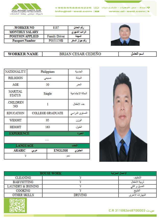 نوع الخدمة نوع الخدمة استقدام تأجير نقل خدمات الجنسية الجنسية الفلبين الهند مصر كينيا اثيوبيا بروندي بنغلاديش أوغندا أوغندا معروفة باكستان الفلبين معروفة اندونيسيا المهنة عاملة منزلية سائق خاص عاملة عناية زوجين ( عامله منزليه وسائق ) الديانة مسلم غير مسلم الخبرة سبق العمل لم يسبق العمل العمر العمر 15 16 17 18 19 20 21 22 23 24 25 26 27 28 29 30 31 32 33 34 35 36 37 38 39 40 41 42 43 44 45 46 47 48 49 50 51 52 53 54 55 56 57 58 59 60 الحالة العائلية الحالة العائلية اعزب متزوج مطلق ارمل اللغة اللغة العربية العربية العربية بنجالي نبالي فلبيني امهرية سواحلي عربي + لغتها الاساسية اندونيسي اوغندي بروندي الوزن الوزن 40 41 42 43 44 45 46 47 48 49 50 51 52 53 54 55 56 57 58 59 60 61 62 63 64 65 66 67 68 69 70 71 72 73 74 75 76 77 78 79 80 81 82 83 84 85 86 87 88 89 90 91 92 93 94 95 96 97 98 99 100 الطول الطول 100 101 102 103 104 105 106 107 108 109 110 111 112 113 114 115 116 117 118 119 120 121 122 123 124 125 126 127 128 129 130 131 132 133 134 135 136 137 138 139 140 141 142 143 144 145 146 147 148 149 150 151 152 153 154 155 156 157 158 159 160 161 162 163 164 165 166 167 168 169 170 171 172 173 174 175 176 177 178 179 180 181 182 183 184 185 186 187 188 189 190 الطلبات الطلبات التنظيف الغسيل الكوي الطبيخ العربي عناية الأطفال عناية كبار السن عناية الرضيع تعليم الأطفال التنظيف - الغسيل - الكوي التنظيف - الغسيل - الكوي- رغبة في تعلم الطبخ التنظيف - الغسيل - الكوي- رغبة في العناية بالاطفال بحث مسح بحث متقدم MUARIF HADJI SAID الفلبين العمر 27 الخبرة لم يسبق العمل الديانة مسلم رقم الملف P1833529B حجز العاملة KAMARUDIN LANGALAN الفلبين العمر 40 الخبرة لم يسبق العمل الديانة مسلم رقم الملف P3459085C حجز العاملة BRIAN CESAR CEDEÑO الفلبين العمر 30 الخبرة لم يسبق العمل الديانة غير مسلم رقم الملف P0051159B حجز العاملة SEMIRA KEDIR YIMER اثيوبيا العمر 23 الخبرة لم يسبق العمل الديانة مسلم رقم الملف EQ2614069 حجز العاملة SEMIRA HULO BEDASO اثيوبيا العمر 24 الخبرة لم يسبق العمل الديانة مسلم رقم الملف EQ2207059 حجز العاملة REHIMA SEID MOHAMMED اثيوبيا العمر 24 الخبرة لم يسبق العمل الديانة مسلم رقم الملف EQ1301196 حجز العاملة NURIYA CHKISA GAGURO اثيوبيا العمر 28 الخبرة لم يسبق العمل الديانة مسلم رقم الملف EP9120713 حجز العاملة MASHLA SEID MEKONIN اثيوبيا العمر 26 الخبرة لم يسبق العمل الديانة مسلم رقم الملف EQ1093700 حجز العاملة FETIYA AMAN SAYID اثيوبيا العمر 26 الخبرة لم يسبق العمل الديانة مسلم رقم الملف EQ1288386 حجز العاملة HAYAT SIRWANA EBADO اثيوبيا العمر 23 الخبرة لم يسبق العمل الديانة مسلم رقم الملف EQ1566224 حجز العاملة 2 3 4 5 6 7 8 9 10