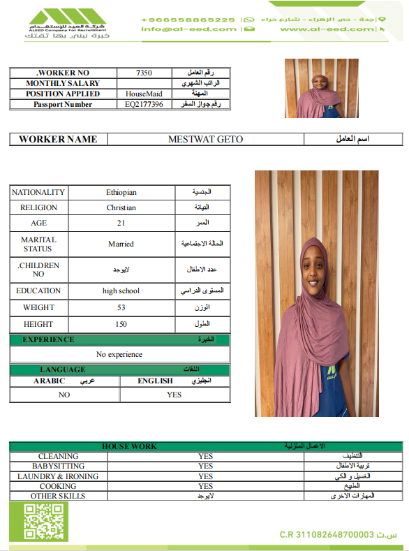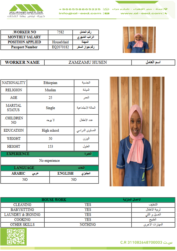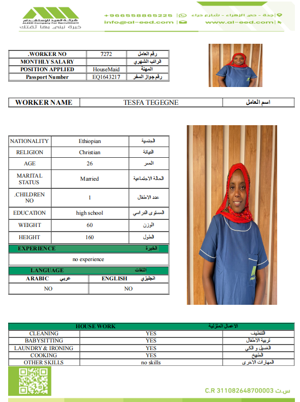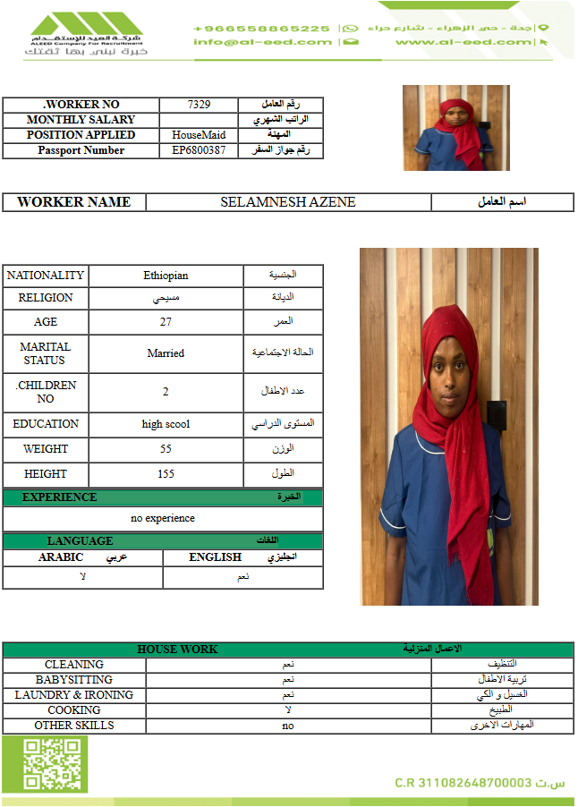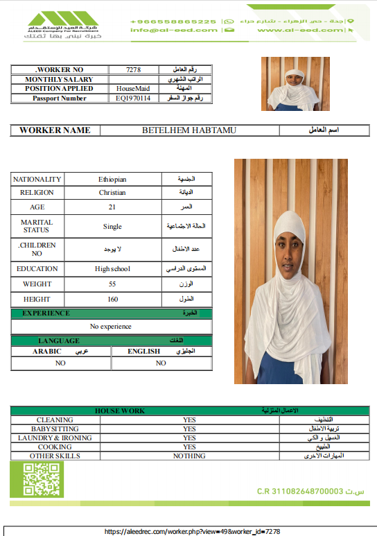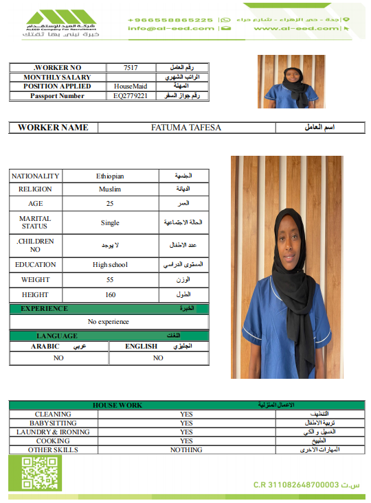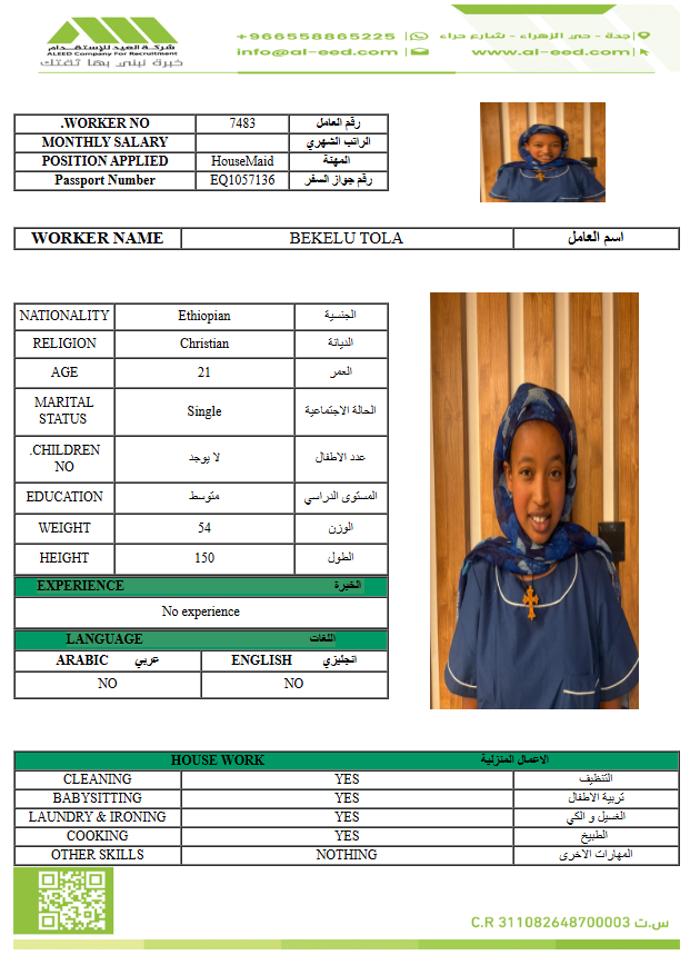 نوع الخدمة نوع الخدمة استقدام تأجير نقل خدمات الجنسية الجنسية الفلبين الهند مصر كينيا اثيوبيا بروندي بنغلاديش أوغندا أوغندا معروفة باكستان الفلبين معروفة اندونيسيا المهنة عاملة منزلية سائق خاص عاملة عناية زوجين ( عامله منزليه وسائق ) الديانة مسلم غير مسلم الخبرة سبق العمل لم يسبق العمل العمر العمر 15 16 17 18 19 20 21 22 23 24 25 26 27 28 29 30 31 32 33 34 35 36 37 38 39 40 41 42 43 44 45 46 47 48 49 50 51 52 53 54 55 56 57 58 59 60 الحالة العائلية الحالة العائلية اعزب متزوج مطلق ارمل اللغة اللغة العربية العربية العربية بنجالي نبالي فلبيني امهرية سواحلي عربي + لغتها الاساسية اندونيسي اوغندي بروندي الوزن الوزن 40 41 42 43 44 45 46 47 48 49 50 51 52 53 54 55 56 57 58 59 60 61 62 63 64 65 66 67 68 69 70 71 72 73 74 75 76 77 78 79 80 81 82 83 84 85 86 87 88 89 90 91 92 93 94 95 96 97 98 99 100 الطول الطول 100 101 102 103 104 105 106 107 108 109 110 111 112 113 114 115 116 117 118 119 120 121 122 123 124 125 126 127 128 129 130 131 132 133 134 135 136 137 138 139 140 141 142 143 144 145 146 147 148 149 150 151 152 153 154 155 156 157 158 159 160 161 162 163 164 165 166 167 168 169 170 171 172 173 174 175 176 177 178 179 180 181 182 183 184 185 186 187 188 189 190 الطلبات الطلبات التنظيف الغسيل الكوي الطبيخ العربي عناية الأطفال عناية كبار السن عناية الرضيع تعليم الأطفال التنظيف - الغسيل - الكوي التنظيف - الغسيل - الكوي- رغبة في تعلم الطبخ التنظيف - الغسيل - الكوي- رغبة في العناية بالاطفال بحث مسح بحث متقدم ZAMZAMU HUSEN اثيوبيا العمر 25 الخبرة لم يسبق العمل الديانة مسلم رقم الملف EQ2070182 حجز العاملة FATUMA TAFESA اثيوبيا العمر 25 الخبرة لم يسبق العمل الديانة مسلم رقم الملف EQ2779221 حجز العاملة BETELHEM HABTAMU اثيوبيا العمر 21 الخبرة لم يسبق العمل الديانة غير مسلم رقم الملف EQ1970114 حجز العاملة TESFA TEGEGNE اثيوبيا العمر 26 الخبرة لم يسبق العمل الديانة غير مسلم رقم الملف EQ1643217 حجز العاملة MESTWAT GETO اثيوبيا العمر 21 الخبرة لم يسبق العمل الديانة غير مسلم رقم الملف EQ2177396 حجز العاملة BEKELU TOLA اثيوبيا العمر 21 الخبرة لم يسبق العمل الديانة غير مسلم رقم الملف EQ1057136 حجز العاملة SELAMNESH AZENE ADEMO اثيوبيا العمر 27 الخبرة لم يسبق العمل الديانة غير مسلم رقم الملف EP6800387 حجز العاملة