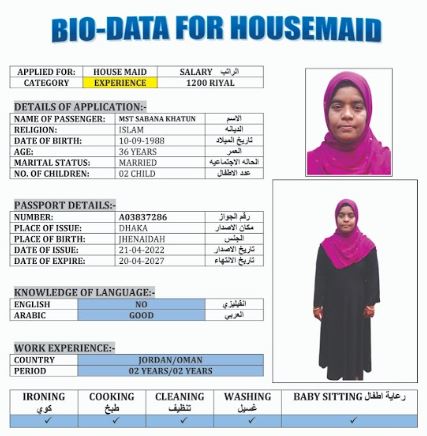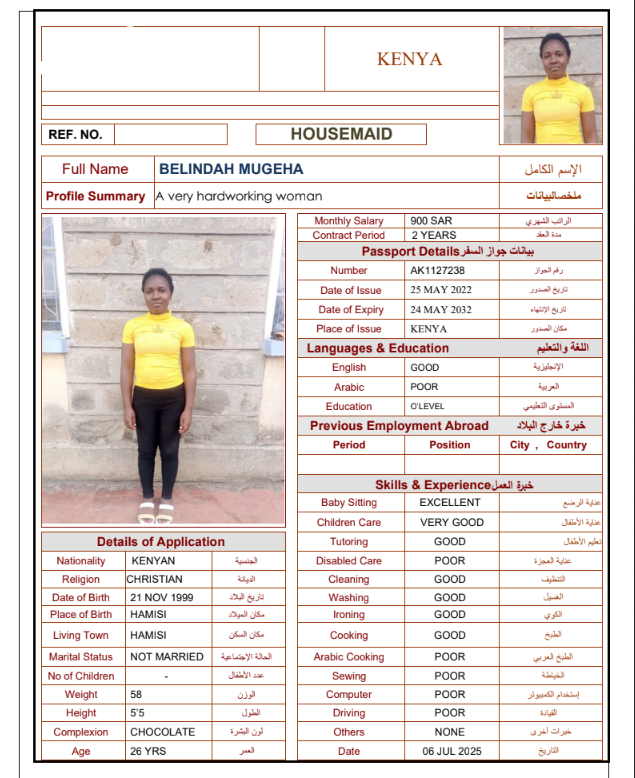 نوع الخدمة نوع الخدمة استقدام تأجير نقل خدمات الجنسية الجنسية الفلبين الهند مصر كينيا اثيوبيا بروندي بنغلاديش أوغندا أوغندا معروفة باكستان الفلبين معروفة اندونيسيا المهنة عاملة منزلية سائق خاص عاملة عناية زوجين ( عامله منزليه وسائق ) الديانة مسلم غير مسلم الخبرة سبق العمل لم يسبق العمل العمر العمر 15 16 17 18 19 20 21 22 23 24 25 26 27 28 29 30 31 32 33 34 35 36 37 38 39 40 41 42 43 44 45 46 47 48 49 50 51 52 53 54 55 56 57 58 59 60 الحالة العائلية الحالة العائلية اعزب متزوج مطلق ارمل اللغة اللغة العربية العربية العربية بنجالي نبالي فلبيني امهرية سواحلي عربي + لغتها الاساسية اندونيسي اوغندي بروندي الوزن الوزن 40 41 42 43 44 45 46 47 48 49 50 51 52 53 54 55 56 57 58 59 60 61 62 63 64 65 66 67 68 69 70 71 72 73 74 75 76 77 78 79 80 81 82 83 84 85 86 87 88 89 90 91 92 93 94 95 96 97 98 99 100 الطول الطول 100 101 102 103 104 105 106 107 108 109 110 111 112 113 114 115 116 117 118 119 120 121 122 123 124 125 126 127 128 129 130 131 132 133 134 135 136 137 138 139 140 141 142 143 144 145 146 147 148 149 150 151 152 153 154 155 156 157 158 159 160 161 162 163 164 165 166 167 168 169 170 171 172 173 174 175 176 177 178 179 180 181 182 183 184 185 186 187 188 189 190 الطلبات الطلبات التنظيف الغسيل الكوي الطبيخ العربي عناية الأطفال عناية كبار السن عناية الرضيع تعليم الأطفال التنظيف - الغسيل - الكوي التنظيف - الغسيل - الكوي- رغبة في تعلم الطبخ التنظيف - الغسيل - الكوي- رغبة في العناية بالاطفال بحث مسح بحث متقدم MST HASINA AKTER بنغلاديش العمر 43 الخبرة سبق العمل الديانة مسلم رقم الملف EN0032210 حجز العاملة BELINDAH MUGEHA كينيا العمر 26 الخبرة لم يسبق العمل الديانة غير مسلم رقم الملف AK1127238 حجز العاملة MST SABANA KHATUN بنغلاديش العمر 36 الخبرة لم يسبق العمل الديانة مسلم رقم الملف A03837286 حجز العاملة