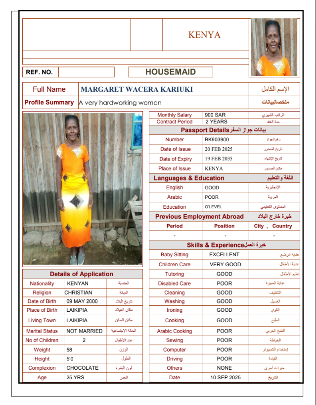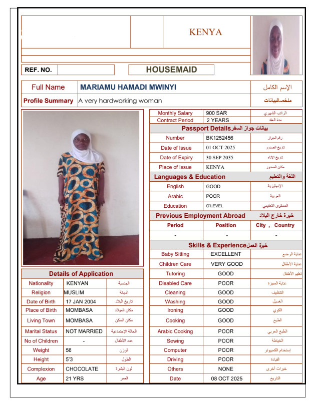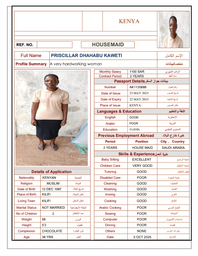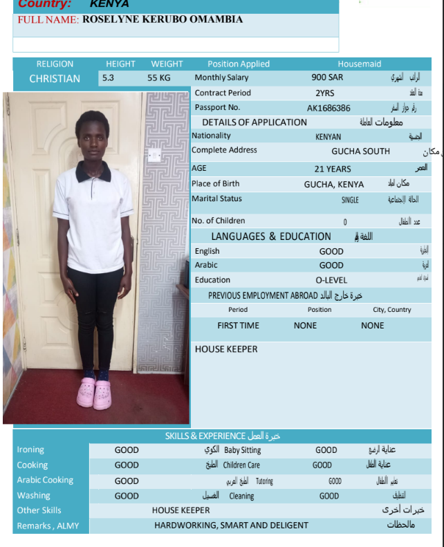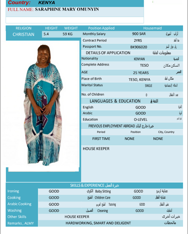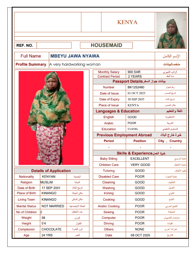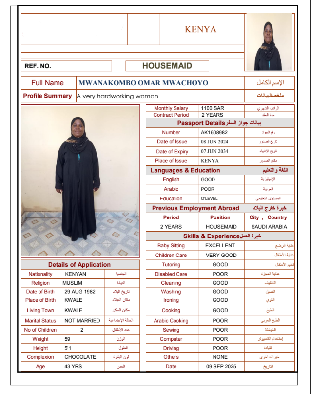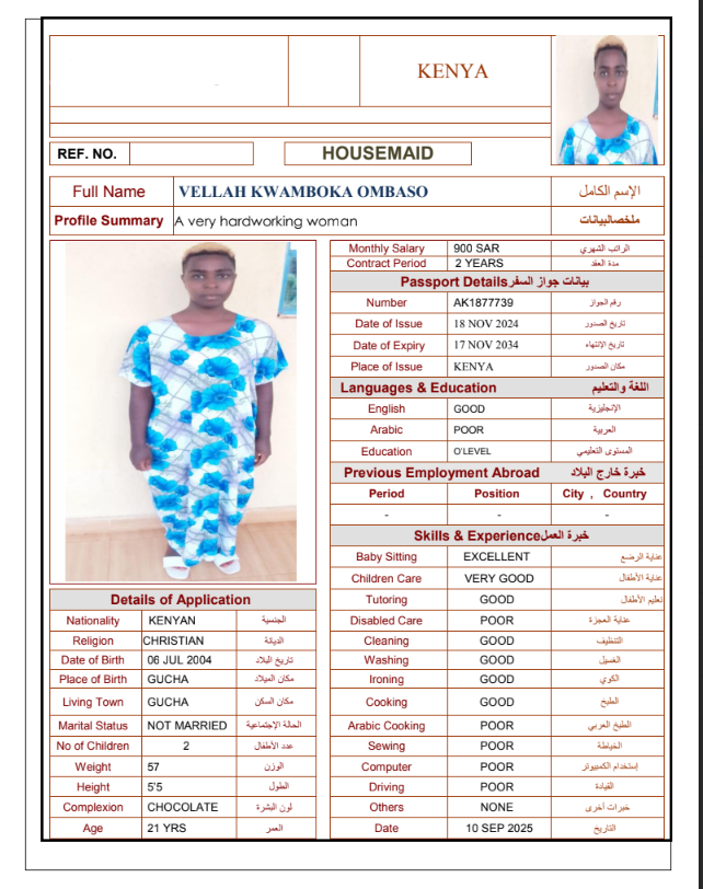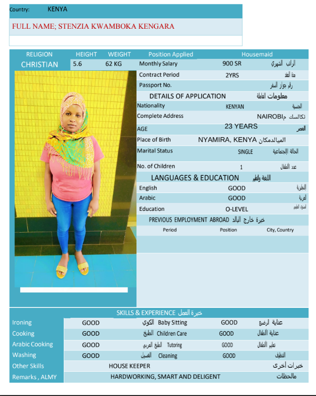 نوع الخدمة نوع الخدمة استقدام تأجير نقل خدمات الجنسية الجنسية الفلبين الهند مصر كينيا اثيوبيا بروندي بنغلاديش أوغندا أوغندا معروفة باكستان الفلبين معروفة اندونيسيا المهنة عاملة منزلية سائق خاص عاملة عناية زوجين ( عامله منزليه وسائق ) الديانة مسلم غير مسلم الخبرة سبق العمل لم يسبق العمل العمر العمر 15 16 17 18 19 20 21 22 23 24 25 26 27 28 29 30 31 32 33 34 35 36 37 38 39 40 41 42 43 44 45 46 47 48 49 50 51 52 53 54 55 56 57 58 59 60 الحالة العائلية الحالة العائلية اعزب متزوج مطلق ارمل اللغة اللغة العربية العربية العربية بنجالي نبالي فلبيني امهرية سواحلي عربي + لغتها الاساسية اندونيسي اوغندي بروندي الوزن الوزن 40 41 42 43 44 45 46 47 48 49 50 51 52 53 54 55 56 57 58 59 60 61 62 63 64 65 66 67 68 69 70 71 72 73 74 75 76 77 78 79 80 81 82 83 84 85 86 87 88 89 90 91 92 93 94 95 96 97 98 99 100 الطول الطول 100 101 102 103 104 105 106 107 108 109 110 111 112 113 114 115 116 117 118 119 120 121 122 123 124 125 126 127 128 129 130 131 132 133 134 135 136 137 138 139 140 141 142 143 144 145 146 147 148 149 150 151 152 153 154 155 156 157 158 159 160 161 162 163 164 165 166 167 168 169 170 171 172 173 174 175 176 177 178 179 180 181 182 183 184 185 186 187 188 189 190 الطلبات الطلبات التنظيف الغسيل الكوي الطبيخ العربي عناية الأطفال عناية كبار السن عناية الرضيع تعليم الأطفال التنظيف - الغسيل - الكوي التنظيف - الغسيل - الكوي- رغبة في تعلم الطبخ التنظيف - الغسيل - الكوي- رغبة في العناية بالاطفال بحث مسح بحث متقدم ROSELYNE KERUBO OMAMBIA كينيا العمر 21 الخبرة لم يسبق العمل الديانة غير مسلم رقم الملف AK1686386 حجز العاملة SARAPHINE MARY OMUNYIN كينيا العمر 25 الخبرة لم يسبق العمل الديانة غير مسلم رقم الملف BK906020 حجز العاملة STENZIA KWAMBOKA KENGARA كينيا العمر 23 الخبرة لم يسبق العمل الديانة غير مسلم رقم الملف AK0928417 حجز العاملة MARGRET WACERA KARIUKI كينيا العمر 25 الخبرة لم يسبق العمل الديانة غير مسلم رقم الملف BK903900 حجز العاملة MARIAMU HAMADI MWINYI كينيا العمر 21 الخبرة لم يسبق العمل الديانة مسلم رقم الملف BK1252456 حجز العاملة MBEYU JAWA NYAWA كينيا العمر 24 الخبرة لم يسبق العمل الديانة مسلم رقم الملف BK1252460 حجز العاملة MWANAKOMBO OMAR MWACHOYO كينيا العمر 43 الخبرة لم يسبق العمل الديانة غير مسلم رقم الملف AK1608982 حجز العاملة PRISCILLAR DHAHABU KAWETI كينيا العمر 38 الخبرة لم يسبق العمل الديانة غير مسلم رقم الملف AK1130888 حجز العاملة VELLAH KWAMBOKA OMBASO كينيا العمر 21 الخبرة لم يسبق العمل الديانة غير مسلم رقم الملف AK1877739 حجز العاملة ZAINAB JUMA SHEE كينيا العمر 37 الخبرة لم يسبق العمل الديانة مسلم رقم الملف BK221001 حجز العاملة 1 2 3 4 5 6 7