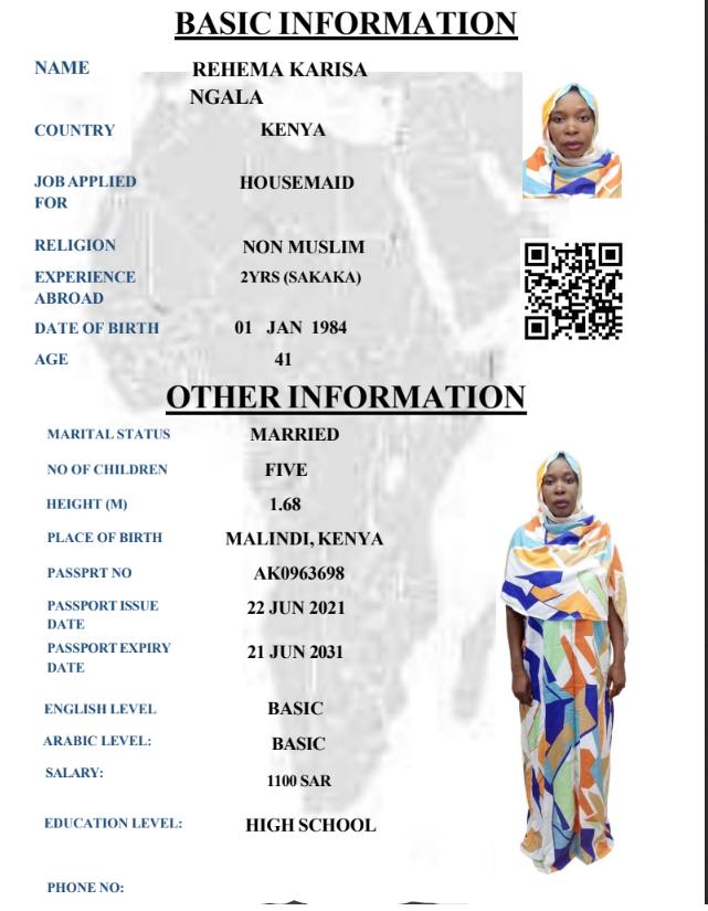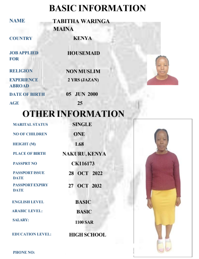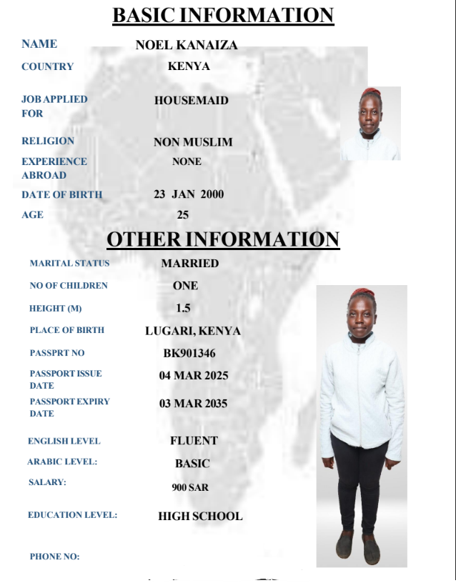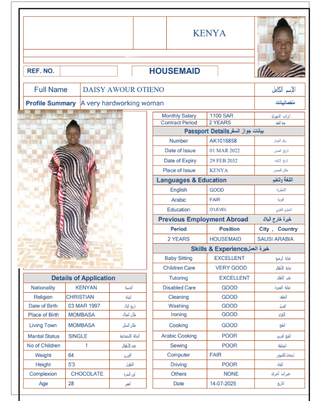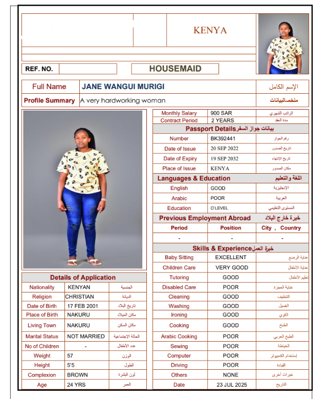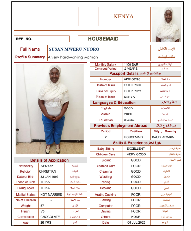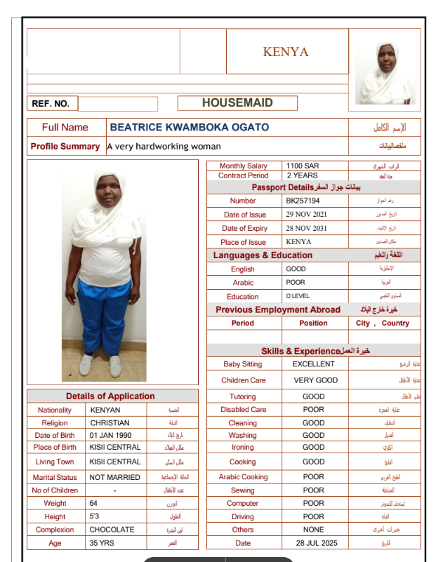 نوع الخدمة نوع الخدمة استقدام تأجير نقل خدمات الجنسية الجنسية الفلبين الهند مصر كينيا اثيوبيا بروندي بنغلاديش أوغندا أوغندا معروفة باكستان الفلبين معروفة اندونيسيا المهنة عاملة منزلية سائق خاص عاملة عناية زوجين ( عامله منزليه وسائق ) الديانة مسلم غير مسلم الخبرة سبق العمل لم يسبق العمل العمر العمر 15 16 17 18 19 20 21 22 23 24 25 26 27 28 29 30 31 32 33 34 35 36 37 38 39 40 41 42 43 44 45 46 47 48 49 50 51 52 53 54 55 56 57 58 59 60 الحالة العائلية الحالة العائلية اعزب متزوج مطلق ارمل اللغة اللغة العربية العربية العربية بنجالي نبالي فلبيني امهرية سواحلي عربي + لغتها الاساسية اندونيسي اوغندي بروندي الوزن الوزن 40 41 42 43 44 45 46 47 48 49 50 51 52 53 54 55 56 57 58 59 60 61 62 63 64 65 66 67 68 69 70 71 72 73 74 75 76 77 78 79 80 81 82 83 84 85 86 87 88 89 90 91 92 93 94 95 96 97 98 99 100 الطول الطول 100 101 102 103 104 105 106 107 108 109 110 111 112 113 114 115 116 117 118 119 120 121 122 123 124 125 126 127 128 129 130 131 132 133 134 135 136 137 138 139 140 141 142 143 144 145 146 147 148 149 150 151 152 153 154 155 156 157 158 159 160 161 162 163 164 165 166 167 168 169 170 171 172 173 174 175 176 177 178 179 180 181 182 183 184 185 186 187 188 189 190 الطلبات الطلبات التنظيف الغسيل الكوي الطبيخ العربي عناية الأطفال عناية كبار السن عناية الرضيع تعليم الأطفال التنظيف - الغسيل - الكوي التنظيف - الغسيل - الكوي- رغبة في تعلم الطبخ التنظيف - الغسيل - الكوي- رغبة في العناية بالاطفال بحث مسح بحث متقدم BEATRICE KWAMBOKA OGATO كينيا العمر 35 الخبرة لم يسبق العمل الديانة غير مسلم رقم الملف BK257194 حجز العاملة TABITHA WARINGA كينيا العمر 25 الخبرة لم يسبق العمل الديانة غير مسلم رقم الملف CK116173 حجز العاملة REHEMA KARISA NGALA كينيا العمر 41 الخبرة لم يسبق العمل الديانة غير مسلم رقم الملف AK0963698 حجز العاملة NOEL KANAIZA كينيا العمر 25 الخبرة لم يسبق العمل الديانة غير مسلم رقم الملف BK901346 حجز العاملة ALICE EZEKIEL كينيا العمر 32 الخبرة لم يسبق العمل الديانة غير مسلم رقم الملف BK297480 حجز العاملة DAISY A WOUR OTIENO كينيا العمر 28 الخبرة لم يسبق العمل الديانة غير مسلم رقم الملف AK1016858 حجز العاملة SUSAN MWERU NYORO كينيا العمر 26 الخبرة لم يسبق العمل الديانة غير مسلم رقم الملف AK0406286 حجز العاملة BELINDAH MUGEHA كينيا العمر 26 الخبرة لم يسبق العمل الديانة غير مسلم رقم الملف AK1127238 حجز العاملة JANE WANGUI MURIGI كينيا العمر 24 الخبرة لم يسبق العمل الديانة غير مسلم رقم الملف BK392441 حجز العاملة ROSELYNE KENGA MWENI كينيا العمر 32 الخبرة لم يسبق العمل الديانة غير مسلم رقم الملف BK255249 حجز العاملة 1 2 3 4 5 6 7