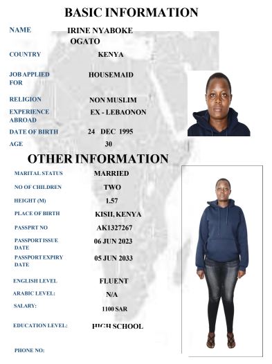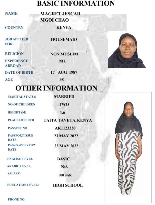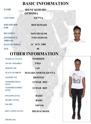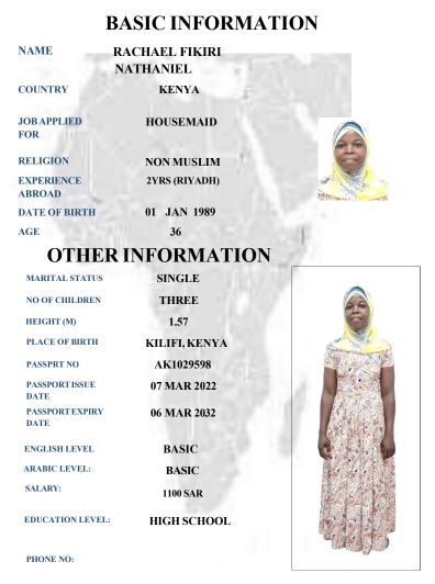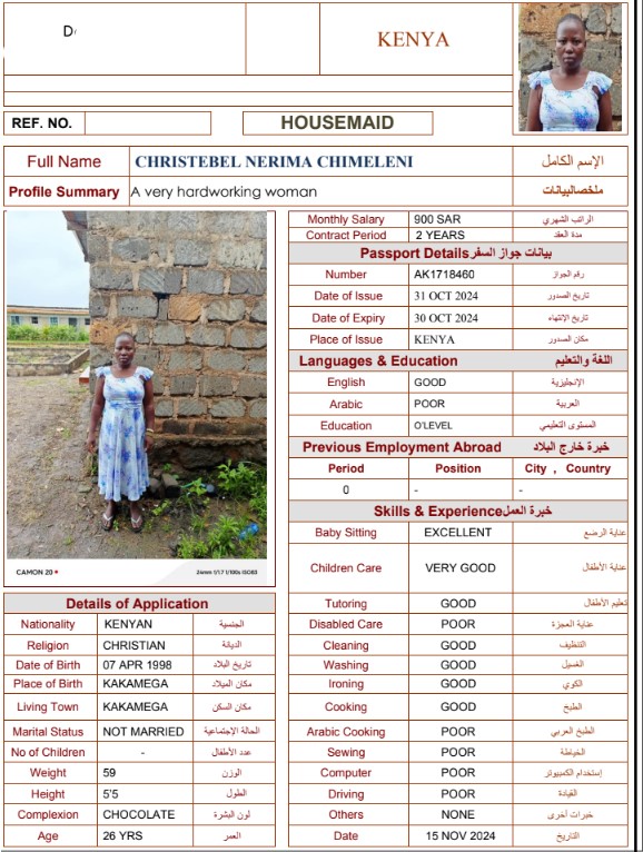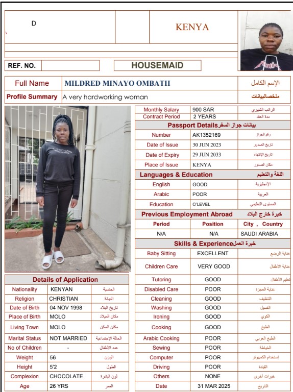 نوع الخدمة نوع الخدمة استقدام تأجير نقل خدمات الجنسية الجنسية الفلبين الهند مصر كينيا اثيوبيا بروندي بنغلاديش أوغندا أوغندا معروفة باكستان الفلبين معروفة اندونيسيا المهنة عاملة منزلية سائق خاص عاملة عناية زوجين ( عامله منزليه وسائق ) الديانة مسلم غير مسلم الخبرة سبق العمل لم يسبق العمل العمر العمر 15 16 17 18 19 20 21 22 23 24 25 26 27 28 29 30 31 32 33 34 35 36 37 38 39 40 41 42 43 44 45 46 47 48 49 50 51 52 53 54 55 56 57 58 59 60 الحالة العائلية الحالة العائلية اعزب متزوج مطلق ارمل اللغة اللغة العربية العربية العربية بنجالي نبالي فلبيني امهرية سواحلي عربي + لغتها الاساسية اندونيسي اوغندي بروندي الوزن الوزن 40 41 42 43 44 45 46 47 48 49 50 51 52 53 54 55 56 57 58 59 60 61 62 63 64 65 66 67 68 69 70 71 72 73 74 75 76 77 78 79 80 81 82 83 84 85 86 87 88 89 90 91 92 93 94 95 96 97 98 99 100 الطول الطول 100 101 102 103 104 105 106 107 108 109 110 111 112 113 114 115 116 117 118 119 120 121 122 123 124 125 126 127 128 129 130 131 132 133 134 135 136 137 138 139 140 141 142 143 144 145 146 147 148 149 150 151 152 153 154 155 156 157 158 159 160 161 162 163 164 165 166 167 168 169 170 171 172 173 174 175 176 177 178 179 180 181 182 183 184 185 186 187 188 189 190 الطلبات الطلبات التنظيف الغسيل الكوي الطبيخ العربي عناية الأطفال عناية كبار السن عناية الرضيع تعليم الأطفال التنظيف - الغسيل - الكوي التنظيف - الغسيل - الكوي- رغبة في تعلم الطبخ التنظيف - الغسيل - الكوي- رغبة في العناية بالاطفال بحث مسح بحث متقدم MAGRET JESCAR MGOI CHAO كينيا العمر 38 الخبرة لم يسبق العمل الديانة غير مسلم رقم الملف AK1123330 حجز العاملة SELESTINA THOYA BAYA كينيا العمر 39 الخبرة لم يسبق العمل الديانة غير مسلم رقم الملف AK1092897 حجز العاملة RACHAEL FIKIRI كينيا العمر 36 الخبرة لم يسبق العمل الديانة غير مسلم رقم الملف AK1029598 حجز العاملة IRINE NYABOKE OGATO كينيا العمر 30 الخبرة لم يسبق العمل الديانة غير مسلم رقم الملف AK1327267 حجز العاملة IRENE KERUBO OTWOMA كينيا العمر 40 الخبرة لم يسبق العمل الديانة غير مسلم رقم الملف BK915243 حجز العاملة MILDRED MINAYO OMBATII كينيا العمر 26 الخبرة لم يسبق العمل الديانة غير مسلم رقم الملف AK1352169 حجز العاملة CHRISTEBEL NERIMA CHIMELENI كينيا العمر 26 الخبرة لم يسبق العمل الديانة غير مسلم رقم الملف AK1718460 حجز العاملة FLORENCE FURAHA NDAA كينيا العمر 38 الخبرة لم يسبق العمل الديانة غير مسلم رقم الملف AK1027642 حجز العاملة EMILY KASICHANA KINGI كينيا العمر 30 الخبرة لم يسبق العمل الديانة غير مسلم رقم الملف BK224093 حجز العاملة FABIAN ZAWADI JAMES كينيا العمر 29 الخبرة لم يسبق العمل الديانة غير مسلم رقم الملف AK485275 حجز العاملة 2 3 4 5 6 7