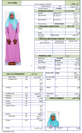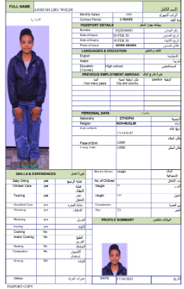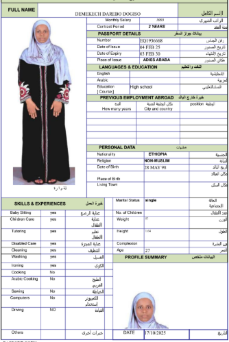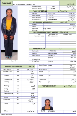 نوع الخدمة نوع الخدمة استقدام تأجير نقل خدمات الجنسية الجنسية الفلبين الهند مصر كينيا اثيوبيا بروندي بنغلاديش أوغندا أوغندا معروفة باكستان الفلبين معروفة اندونيسيا المهنة عاملة منزلية سائق خاص عاملة عناية زوجين ( عامله منزليه وسائق ) الديانة مسلم غير مسلم الخبرة سبق العمل لم يسبق العمل العمر العمر 15 16 17 18 19 20 21 22 23 24 25 26 27 28 29 30 31 32 33 34 35 36 37 38 39 40 41 42 43 44 45 46 47 48 49 50 51 52 53 54 55 56 57 58 59 60 الحالة العائلية الحالة العائلية اعزب متزوج مطلق ارمل اللغة اللغة العربية العربية العربية بنجالي نبالي فلبيني امهرية سواحلي عربي + لغتها الاساسية اندونيسي اوغندي بروندي الوزن الوزن 40 41 42 43 44 45 46 47 48 49 50 51 52 53 54 55 56 57 58 59 60 61 62 63 64 65 66 67 68 69 70 71 72 73 74 75 76 77 78 79 80 81 82 83 84 85 86 87 88 89 90 91 92 93 94 95 96 97 98 99 100 الطول الطول 100 101 102 103 104 105 106 107 108 109 110 111 112 113 114 115 116 117 118 119 120 121 122 123 124 125 126 127 128 129 130 131 132 133 134 135 136 137 138 139 140 141 142 143 144 145 146 147 148 149 150 151 152 153 154 155 156 157 158 159 160 161 162 163 164 165 166 167 168 169 170 171 172 173 174 175 176 177 178 179 180 181 182 183 184 185 186 187 188 189 190 الطلبات الطلبات التنظيف الغسيل الكوي الطبيخ العربي عناية الأطفال عناية كبار السن عناية الرضيع تعليم الأطفال التنظيف - الغسيل - الكوي التنظيف - الغسيل - الكوي- رغبة في تعلم الطبخ التنظيف - الغسيل - الكوي- رغبة في العناية بالاطفال بحث مسح بحث متقدم DERARTU AKALU YOHANNIS اثيوبيا العمر 24 الخبرة لم يسبق العمل الديانة غير مسلم رقم الملف EQ2533594 حجز العاملة DEMEKECH DAREBO DOGISO اثيوبيا العمر 27 الخبرة لم يسبق العمل الديانة غير مسلم رقم الملف EQ1936668 حجز العاملة DAMINE BULO BOBARO اثيوبيا العمر 26 الخبرة لم يسبق العمل الديانة مسلم رقم الملف EP8501761 حجز العاملة ALEM ASEFA DAMTE اثيوبيا العمر 27 الخبرة لم يسبق العمل الديانة غير مسلم رقم الملف EP8449626 حجز العاملة BERTUKAN DENEBO DESTA اثيوبيا العمر 26 الخبرة لم يسبق العمل الديانة مسلم رقم الملف EP8202971 حجز العاملة BELAYNESH LEILEBO KIDORE اثيوبيا العمر 24 الخبرة لم يسبق العمل الديانة غير مسلم رقم الملف EQ2027648 حجز العاملة AZEB FIKIRE SEFO اثيوبيا العمر 25 الخبرة لم يسبق العمل الديانة غير مسلم رقم الملف EP8457955 حجز العاملة SHUMET ASYAAHMED اثيوبيا العمر 25 الخبرة لم يسبق العمل الديانة مسلم رقم الملف 9369979EP حجز العاملة AJEBUSH LIRU WOLDE اثيوبيا العمر 23 الخبرة لم يسبق العمل الديانة غير مسلم رقم الملف EQ2048091 حجز العاملة RESHIDA ADEM ABAGIJO اثيوبيا العمر 27 الخبرة لم يسبق العمل الديانة مسلم رقم الملف EQ1555047 حجز العاملة 12 13 14 15 16 17 18 19 20