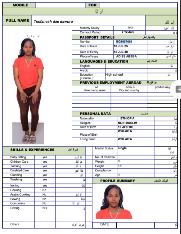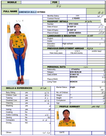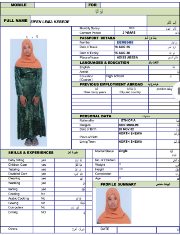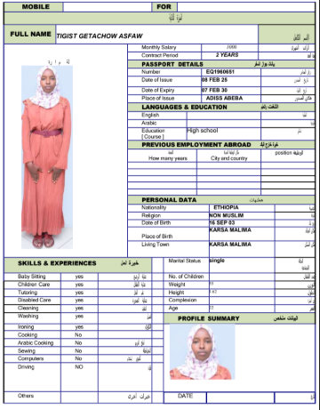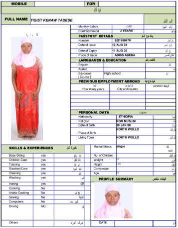 نوع الخدمة نوع الخدمة استقدام تأجير نقل خدمات الجنسية الجنسية الفلبين الهند مصر كينيا اثيوبيا بروندي بنغلاديش أوغندا أوغندا معروفة باكستان الفلبين معروفة اندونيسيا المهنة عاملة منزلية سائق خاص عاملة عناية زوجين ( عامله منزليه وسائق ) الديانة مسلم غير مسلم الخبرة سبق العمل لم يسبق العمل العمر العمر 15 16 17 18 19 20 21 22 23 24 25 26 27 28 29 30 31 32 33 34 35 36 37 38 39 40 41 42 43 44 45 46 47 48 49 50 51 52 53 54 55 56 57 58 59 60 الحالة العائلية الحالة العائلية اعزب متزوج مطلق ارمل اللغة اللغة العربية العربية العربية بنجالي نبالي فلبيني امهرية سواحلي عربي + لغتها الاساسية اندونيسي اوغندي بروندي الوزن الوزن 40 41 42 43 44 45 46 47 48 49 50 51 52 53 54 55 56 57 58 59 60 61 62 63 64 65 66 67 68 69 70 71 72 73 74 75 76 77 78 79 80 81 82 83 84 85 86 87 88 89 90 91 92 93 94 95 96 97 98 99 100 الطول الطول 100 101 102 103 104 105 106 107 108 109 110 111 112 113 114 115 116 117 118 119 120 121 122 123 124 125 126 127 128 129 130 131 132 133 134 135 136 137 138 139 140 141 142 143 144 145 146 147 148 149 150 151 152 153 154 155 156 157 158 159 160 161 162 163 164 165 166 167 168 169 170 171 172 173 174 175 176 177 178 179 180 181 182 183 184 185 186 187 188 189 190 الطلبات الطلبات التنظيف الغسيل الكوي الطبيخ العربي عناية الأطفال عناية كبار السن عناية الرضيع تعليم الأطفال التنظيف - الغسيل - الكوي التنظيف - الغسيل - الكوي- رغبة في تعلم الطبخ التنظيف - الغسيل - الكوي- رغبة في العناية بالاطفال بحث مسح بحث متقدم MEDINA ADEM ENDRIS اثيوبيا العمر 23 الخبرة لم يسبق العمل الديانة مسلم رقم الملف EQ1374928 حجز العاملة SIFEN LEMA KEBEDE اثيوبيا العمر 23 الخبرة لم يسبق العمل الديانة غير مسلم رقم الملف EQ1685482 حجز العاملة SIMENESH BULO KITEBA اثيوبيا العمر 23 الخبرة لم يسبق العمل الديانة غير مسلم رقم الملف EP8118806 حجز العاملة SUDI AREGA SEID اثيوبيا العمر 24 الخبرة لم يسبق العمل الديانة مسلم رقم الملف EP8952041 حجز العاملة SUDI KEDIR ABAFITA اثيوبيا العمر 24 الخبرة لم يسبق العمل الديانة مسلم رقم الملف EP8551097 حجز العاملة Tesfanesh dae dawuro اثيوبيا العمر 25 الخبرة لم يسبق العمل الديانة مسلم رقم الملف EP9327048 حجز العاملة Tesfanesh dae dawuro اثيوبيا العمر 25 الخبرة لم يسبق العمل الديانة غير مسلم رقم الملف EQ1557691 حجز العاملة TIGIST GETACHOW ASFAW اثيوبيا العمر 22 الخبرة لم يسبق العمل الديانة غير مسلم رقم الملف EQ1960651 حجز العاملة TIGIST KENAW TADESE اثيوبيا العمر 25 الخبرة لم يسبق العمل الديانة غير مسلم رقم الملف EQ1659870 حجز العاملة TINSAYE TESHOME KASA اثيوبيا العمر 32 الخبرة لم يسبق العمل الديانة غير مسلم رقم الملف EP9346029 حجز العاملة 18 19 20 21 22 23 24 25 26