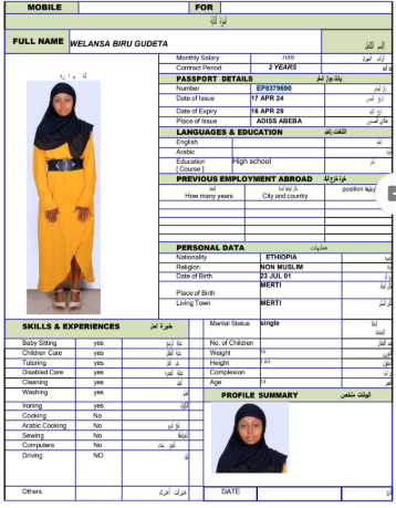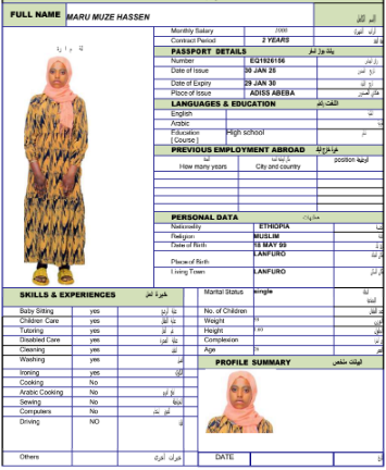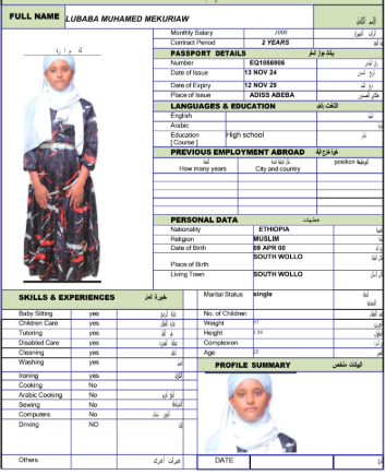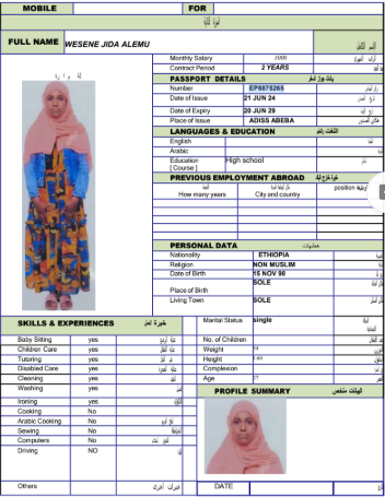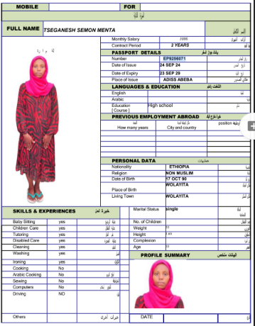 نوع الخدمة نوع الخدمة استقدام تأجير نقل خدمات الجنسية الجنسية الفلبين الهند مصر كينيا اثيوبيا بروندي بنغلاديش أوغندا أوغندا معروفة باكستان الفلبين معروفة اندونيسيا المهنة عاملة منزلية سائق خاص عاملة عناية زوجين ( عامله منزليه وسائق ) الديانة مسلم غير مسلم الخبرة سبق العمل لم يسبق العمل العمر العمر 15 16 17 18 19 20 21 22 23 24 25 26 27 28 29 30 31 32 33 34 35 36 37 38 39 40 41 42 43 44 45 46 47 48 49 50 51 52 53 54 55 56 57 58 59 60 الحالة العائلية الحالة العائلية اعزب متزوج مطلق ارمل اللغة اللغة العربية العربية العربية بنجالي نبالي فلبيني امهرية سواحلي عربي + لغتها الاساسية اندونيسي اوغندي بروندي الوزن الوزن 40 41 42 43 44 45 46 47 48 49 50 51 52 53 54 55 56 57 58 59 60 61 62 63 64 65 66 67 68 69 70 71 72 73 74 75 76 77 78 79 80 81 82 83 84 85 86 87 88 89 90 91 92 93 94 95 96 97 98 99 100 الطول الطول 100 101 102 103 104 105 106 107 108 109 110 111 112 113 114 115 116 117 118 119 120 121 122 123 124 125 126 127 128 129 130 131 132 133 134 135 136 137 138 139 140 141 142 143 144 145 146 147 148 149 150 151 152 153 154 155 156 157 158 159 160 161 162 163 164 165 166 167 168 169 170 171 172 173 174 175 176 177 178 179 180 181 182 183 184 185 186 187 188 189 190 الطلبات الطلبات التنظيف الغسيل الكوي الطبيخ العربي عناية الأطفال عناية كبار السن عناية الرضيع تعليم الأطفال التنظيف - الغسيل - الكوي التنظيف - الغسيل - الكوي- رغبة في تعلم الطبخ التنظيف - الغسيل - الكوي- رغبة في العناية بالاطفال بحث مسح بحث متقدم MARU MUZE HASSEN اثيوبيا العمر 26 الخبرة لم يسبق العمل الديانة مسلم رقم الملف EQ1926156 حجز العاملة TSAHAYE TESSEMA SUGEBO اثيوبيا العمر 25 الخبرة لم يسبق العمل الديانة غير مسلم رقم الملف EQ2243638 حجز العاملة TSEGANESH SEMON MENTA اثيوبيا العمر 35 الخبرة لم يسبق العمل الديانة غير مسلم رقم الملف EP9256071 حجز العاملة WELANSA BIRU GUDETA اثيوبيا العمر 24 الخبرة لم يسبق العمل الديانة غير مسلم رقم الملف EP8379690 حجز العاملة WESENE JIDA ALEMU اثيوبيا العمر 27 الخبرة لم يسبق العمل الديانة غير مسلم رقم الملف EP8875265 حجز العاملة ZARA ABDELA ABADIMA اثيوبيا العمر 26 الخبرة لم يسبق العمل الديانة مسلم رقم الملف EQ1774951 حجز العاملة ZULFA NASIR SEID اثيوبيا العمر 27 الخبرة لم يسبق العمل الديانة مسلم رقم الملف 2065959EQ حجز العاملة MARIYE ADEM HASEN اثيوبيا العمر 25 الخبرة لم يسبق العمل الديانة مسلم رقم الملف EQ2873612 حجز العاملة LUBABA MUHAMED MEKURIAW اثيوبيا العمر 25 الخبرة لم يسبق العمل الديانة مسلم رقم الملف EQ1056906 حجز العاملة LEYILA NURTATA AHMEDIN اثيوبيا العمر 38 الخبرة لم يسبق العمل الديانة مسلم رقم الملف EQ1690710 حجز العاملة 19 20 21 22 23 24 25 26 27