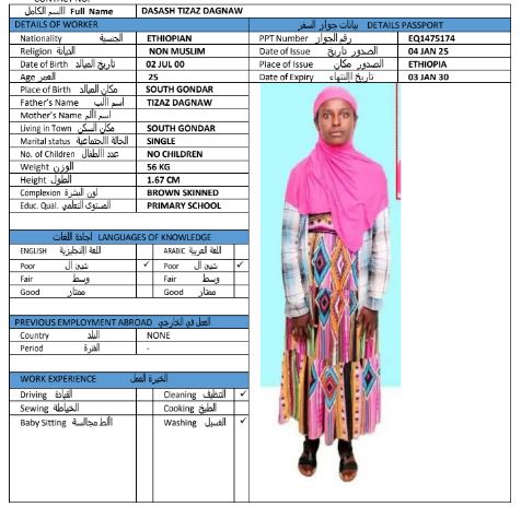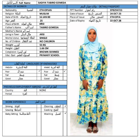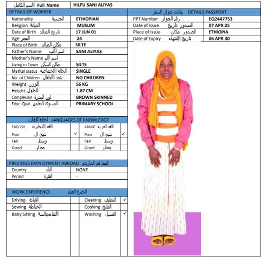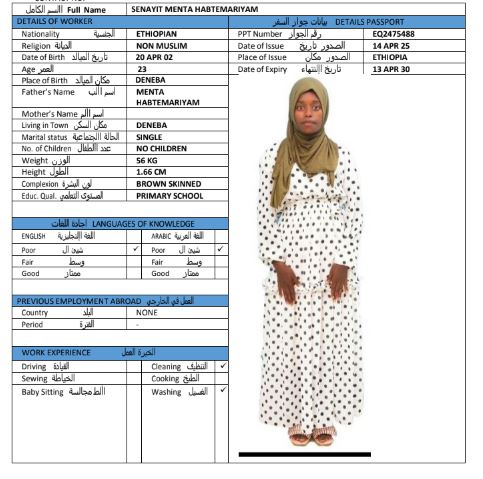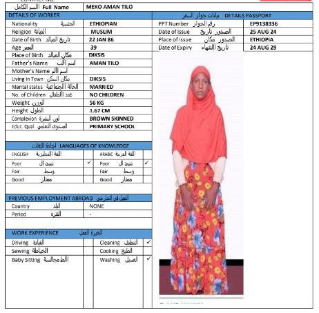 نوع الخدمة نوع الخدمة استقدام تأجير نقل خدمات الجنسية الجنسية الفلبين الهند مصر كينيا اثيوبيا بروندي بنغلاديش أوغندا أوغندا معروفة باكستان الفلبين معروفة اندونيسيا المهنة عاملة منزلية سائق خاص عاملة عناية زوجين ( عامله منزليه وسائق ) الديانة مسلم غير مسلم الخبرة سبق العمل لم يسبق العمل العمر العمر 15 16 17 18 19 20 21 22 23 24 25 26 27 28 29 30 31 32 33 34 35 36 37 38 39 40 41 42 43 44 45 46 47 48 49 50 51 52 53 54 55 56 57 58 59 60 الحالة العائلية الحالة العائلية اعزب متزوج مطلق ارمل اللغة اللغة العربية العربية العربية بنجالي نبالي فلبيني امهرية سواحلي عربي + لغتها الاساسية اندونيسي اوغندي بروندي الوزن الوزن 40 41 42 43 44 45 46 47 48 49 50 51 52 53 54 55 56 57 58 59 60 61 62 63 64 65 66 67 68 69 70 71 72 73 74 75 76 77 78 79 80 81 82 83 84 85 86 87 88 89 90 91 92 93 94 95 96 97 98 99 100 الطول الطول 100 101 102 103 104 105 106 107 108 109 110 111 112 113 114 115 116 117 118 119 120 121 122 123 124 125 126 127 128 129 130 131 132 133 134 135 136 137 138 139 140 141 142 143 144 145 146 147 148 149 150 151 152 153 154 155 156 157 158 159 160 161 162 163 164 165 166 167 168 169 170 171 172 173 174 175 176 177 178 179 180 181 182 183 184 185 186 187 188 189 190 الطلبات الطلبات التنظيف الغسيل الكوي الطبيخ العربي عناية الأطفال عناية كبار السن عناية الرضيع تعليم الأطفال التنظيف - الغسيل - الكوي التنظيف - الغسيل - الكوي- رغبة في تعلم الطبخ التنظيف - الغسيل - الكوي- رغبة في العناية بالاطفال بحث مسح بحث متقدم SENAYIT MENTA HABTEMARIYAM اثيوبيا العمر 23 الخبرة لم يسبق العمل الديانة غير مسلم رقم الملف EQ2475488 حجز العاملة SEMIRA FIRA ABADURA اثيوبيا العمر 22 الخبرة لم يسبق العمل الديانة مسلم رقم الملف EQ1400196 حجز العاملة SADIYA TABIRO GEMEDA اثيوبيا العمر 25 الخبرة لم يسبق العمل الديانة مسلم رقم الملف EP8294723 حجز العاملة MESERET TAMIRAT BACHA اثيوبيا العمر 28 الخبرة لم يسبق العمل الديانة غير مسلم رقم الملف EP8913182 حجز العاملة MEKO AMAN TILO اثيوبيا العمر 39 الخبرة لم يسبق العمل الديانة مسلم رقم الملف EP9138336 حجز العاملة HILFU SANI ALIYAS اثيوبيا العمر 24 الخبرة لم يسبق العمل الديانة مسلم رقم الملف EQ2447753 حجز العاملة FEDILA AHMED SHIREF اثيوبيا العمر 21 الخبرة لم يسبق العمل الديانة مسلم رقم الملف EP9132677 حجز العاملة FATUMA RESHAD ADEM اثيوبيا العمر 27 الخبرة لم يسبق العمل الديانة مسلم رقم الملف EQ2546148 حجز العاملة DASASH TIZAZ DAGNAW اثيوبيا العمر 25 الخبرة لم يسبق العمل الديانة غير مسلم رقم الملف EQ1475174 حجز العاملة BETENESH ABDULETIF MUHAMED اثيوبيا العمر 22 الخبرة لم يسبق العمل الديانة مسلم رقم الملف EP8024044 حجز العاملة 26 27 28 29 30 31 32