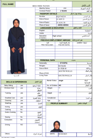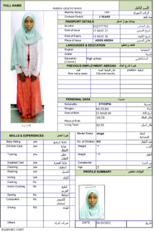 نوع الخدمة نوع الخدمة استقدام تأجير نقل خدمات الجنسية الجنسية الفلبين الهند مصر كينيا اثيوبيا بروندي بنغلاديش أوغندا أوغندا معروفة باكستان الفلبين معروفة اندونيسيا المهنة عاملة منزلية سائق خاص عاملة عناية زوجين ( عامله منزليه وسائق ) الديانة مسلم غير مسلم الخبرة سبق العمل لم يسبق العمل العمر العمر 15 16 17 18 19 20 21 22 23 24 25 26 27 28 29 30 31 32 33 34 35 36 37 38 39 40 41 42 43 44 45 46 47 48 49 50 51 52 53 54 55 56 57 58 59 60 الحالة العائلية الحالة العائلية اعزب متزوج مطلق ارمل اللغة اللغة العربية العربية العربية بنجالي نبالي فلبيني امهرية سواحلي عربي + لغتها الاساسية اندونيسي اوغندي بروندي الوزن الوزن 40 41 42 43 44 45 46 47 48 49 50 51 52 53 54 55 56 57 58 59 60 61 62 63 64 65 66 67 68 69 70 71 72 73 74 75 76 77 78 79 80 81 82 83 84 85 86 87 88 89 90 91 92 93 94 95 96 97 98 99 100 الطول الطول 100 101 102 103 104 105 106 107 108 109 110 111 112 113 114 115 116 117 118 119 120 121 122 123 124 125 126 127 128 129 130 131 132 133 134 135 136 137 138 139 140 141 142 143 144 145 146 147 148 149 150 151 152 153 154 155 156 157 158 159 160 161 162 163 164 165 166 167 168 169 170 171 172 173 174 175 176 177 178 179 180 181 182 183 184 185 186 187 188 189 190 الطلبات الطلبات التنظيف الغسيل الكوي الطبيخ العربي عناية الأطفال عناية كبار السن عناية الرضيع تعليم الأطفال التنظيف - الغسيل - الكوي التنظيف - الغسيل - الكوي- رغبة في تعلم الطبخ التنظيف - الغسيل - الكوي- رغبة في العناية بالاطفال بحث مسح بحث متقدم ALI ZEHARAAHMED اثيوبيا العمر 25 الخبرة لم يسبق العمل الديانة مسلم رقم الملف EQ2572112 حجز العاملة SOFIYA ZEYINU OUMER اثيوبيا العمر 29 الخبرة لم يسبق العمل الديانة مسلم رقم الملف EQ2567339 حجز العاملة SITINA HUSSEN AHEMED اثيوبيا العمر 23 الخبرة لم يسبق العمل الديانة مسلم رقم الملف EQ2070275 حجز العاملة SEMIRA BIRHAN MEKASHI اثيوبيا العمر 24 الخبرة لم يسبق العمل الديانة مسلم رقم الملف EQ2034642 حجز العاملة REISA AHMED ESMAEL اثيوبيا العمر 30 الخبرة لم يسبق العمل الديانة مسلم رقم الملف EP6450467 حجز العاملة RADIYA HUSEN GURA اثيوبيا العمر 25 الخبرة لم يسبق العمل الديانة مسلم رقم الملف EQ2263304 حجز العاملة MUHAMMED RADIYAAHMED اثيوبيا العمر 22 الخبرة لم يسبق العمل الديانة مسلم رقم الملف EP8854852 حجز العاملة NURIYA GELETO SHIFA اثيوبيا العمر 25 الخبرة لم يسبق العمل الديانة مسلم رقم الملف EQ2577702 حجز العاملة NESIBA SULE IBRO اثيوبيا العمر 25 الخبرة لم يسبق العمل الديانة مسلم رقم الملف EQ2865620 حجز العاملة MEKA NIWSE TILAHUN اثيوبيا العمر 25 الخبرة لم يسبق العمل الديانة مسلم رقم الملف EQ1744219 حجز العاملة 4 5 6 7 8 9 10 11 12