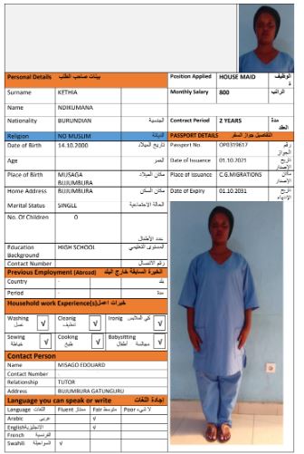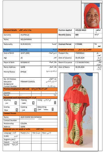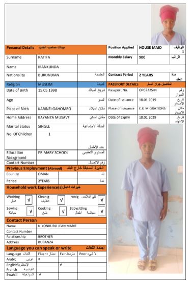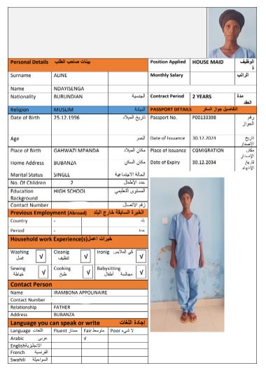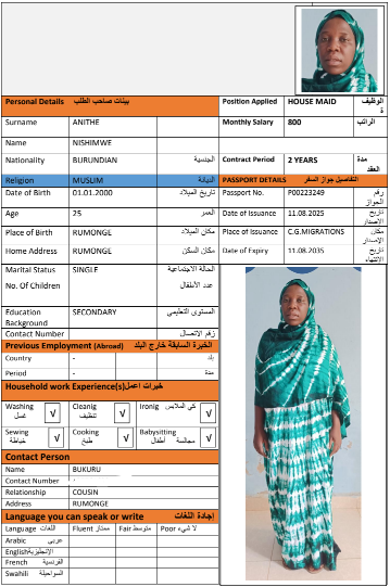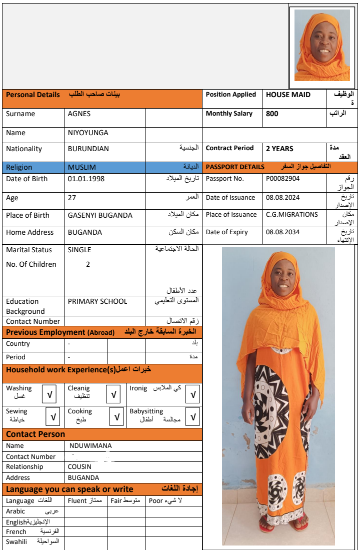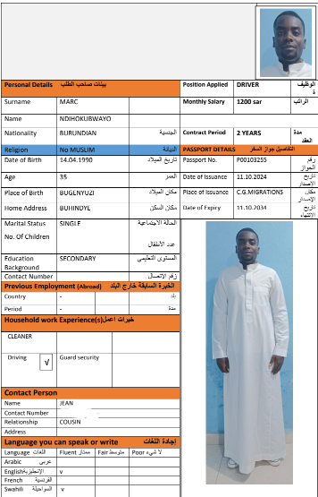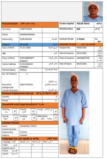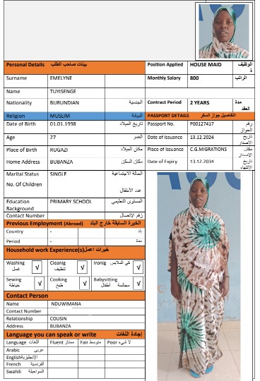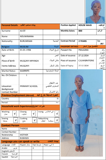نوع الخدمة نوع الخدمة استقدام تأجير نقل خدمات الجنسية الجنسية الفلبين الهند مصر كينيا اثيوبيا بروندي بنغلاديش أوغندا أوغندا معروفة باكستان الفلبين معروفة اندونيسيا المهنة عاملة منزلية سائق خاص عاملة عناية زوجين ( عامله منزليه وسائق ) الديانة مسلم غير مسلم الخبرة سبق العمل لم يسبق العمل العمر العمر 15 16 17 18 19 20 21 22 23 24 25 26 27 28 29 30 31 32 33 34 35 36 37 38 39 40 41 42 43 44 45 46 47 48 49 50 51 52 53 54 55 56 57 58 59 60 الحالة العائلية الحالة العائلية اعزب متزوج مطلق ارمل اللغة اللغة العربية العربية العربية بنجالي نبالي فلبيني امهرية سواحلي عربي + لغتها الاساسية اندونيسي اوغندي بروندي الوزن الوزن 40 41 42 43 44 45 46 47 48 49 50 51 52 53 54 55 56 57 58 59 60 61 62 63 64 65 66 67 68 69 70 71 72 73 74 75 76 77 78 79 80 81 82 83 84 85 86 87 88 89 90 91 92 93 94 95 96 97 98 99 100 الطول الطول 100 101 102 103 104 105 106 107 108 109 110 111 112 113 114 115 116 117 118 119 120 121 122 123 124 125 126 127 128 129 130 131 132 133 134 135 136 137 138 139 140 141 142 143 144 145 146 147 148 149 150 151 152 153 154 155 156 157 158 159 160 161 162 163 164 165 166 167 168 169 170 171 172 173 174 175 176 177 178 179 180 181 182 183 184 185 186 187 188 189 190 الطلبات الطلبات التنظيف الغسيل الكوي الطبيخ العربي عناية الأطفال عناية كبار السن عناية الرضيع تعليم الأطفال التنظيف - الغسيل - الكوي التنظيف - الغسيل - الكوي- رغبة في تعلم الطبخ التنظيف - الغسيل - الكوي- رغبة في العناية بالاطفال بحث مسح بحث متقدم ANITHE NISHIMWE بروندي العمر 25 الخبرة لم يسبق العمل الديانة غير مسلم رقم الملف P00223249 حجز العاملة MARC NDIHOKUBWAYO بروندي العمر 35 الخبرة لم يسبق العمل الديانة غير مسلم رقم الملف P00103255 حجز العاملة AUDREILLE NDUWIMANA بروندي العمر 25 الخبرة لم يسبق العمل الديانة مسلم رقم الملف P00090622 حجز العاملة NIYOYUNGA AGNES بروندي العمر 27 الخبرة لم يسبق العمل الديانة مسلم رقم الملف P00082904 حجز العاملة TUYISENGE EMELYNE بروندي العمر 27 الخبرة لم يسبق العمل الديانة مسلم رقم الملف P00127417 حجز العاملة ALICE NDUWIMANA بروندي العمر 36 الخبرة لم يسبق العمل الديانة مسلم رقم الملف P00132965 حجز العاملة KETHIA NDIKUMANA بروندي العمر 25 الخبرة لم يسبق العمل الديانة غير مسلم رقم الملف OP0319617 حجز العاملة ALINE NDAYISENGA بروندي العمر 29 الخبرة لم يسبق العمل الديانة مسلم رقم الملف P00133398 حجز العاملة CHRETIENNE NAMBAJIMANA بروندي العمر 21 الخبرة لم يسبق العمل الديانة مسلم رقم الملف P00057584 حجز العاملة RATIFA IRANKUNDA بروندي العمر 27 الخبرة لم يسبق العمل الديانة مسلم رقم الملف OP0222544 حجز العاملة 1 2 3