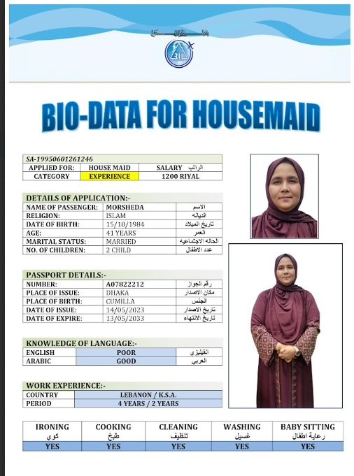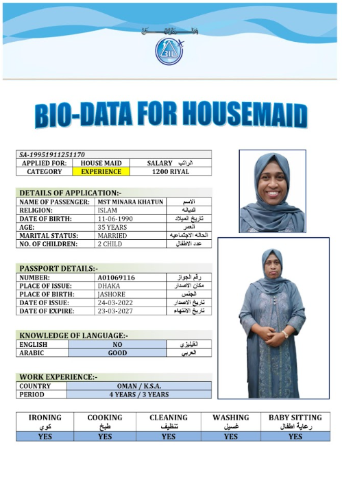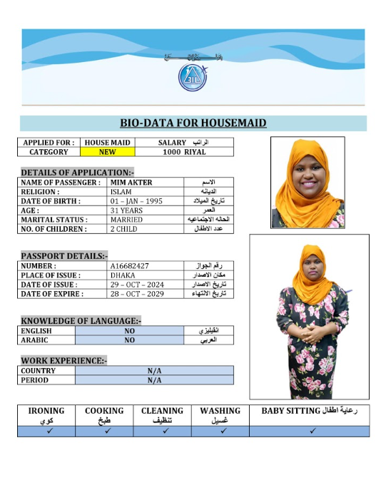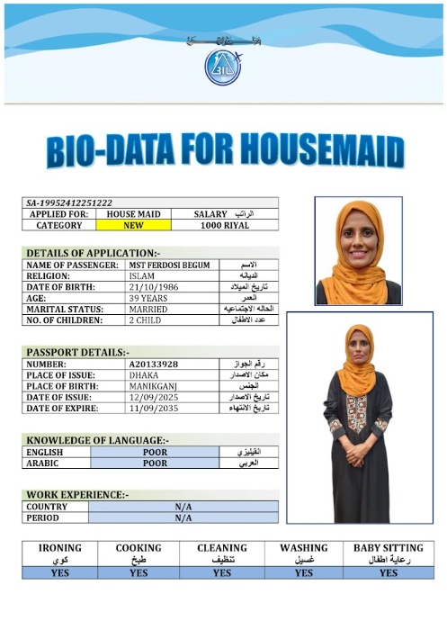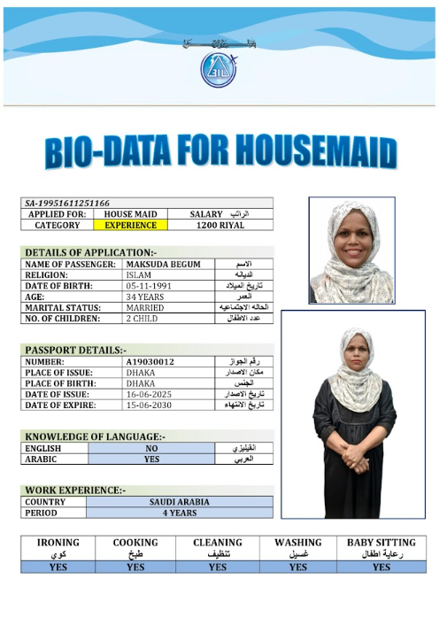 نوع الخدمة نوع الخدمة استقدام تأجير نقل خدمات الجنسية الجنسية الفلبين الهند مصر كينيا اثيوبيا بروندي بنغلاديش أوغندا أوغندا معروفة باكستان الفلبين معروفة اندونيسيا المهنة عاملة منزلية سائق خاص عاملة عناية زوجين ( عامله منزليه وسائق ) الديانة مسلم غير مسلم الخبرة سبق العمل لم يسبق العمل العمر العمر 15 16 17 18 19 20 21 22 23 24 25 26 27 28 29 30 31 32 33 34 35 36 37 38 39 40 41 42 43 44 45 46 47 48 49 50 51 52 53 54 55 56 57 58 59 60 الحالة العائلية الحالة العائلية اعزب متزوج مطلق ارمل اللغة اللغة العربية العربية العربية بنجالي نبالي فلبيني امهرية سواحلي عربي + لغتها الاساسية اندونيسي اوغندي بروندي الوزن الوزن 40 41 42 43 44 45 46 47 48 49 50 51 52 53 54 55 56 57 58 59 60 61 62 63 64 65 66 67 68 69 70 71 72 73 74 75 76 77 78 79 80 81 82 83 84 85 86 87 88 89 90 91 92 93 94 95 96 97 98 99 100 الطول الطول 100 101 102 103 104 105 106 107 108 109 110 111 112 113 114 115 116 117 118 119 120 121 122 123 124 125 126 127 128 129 130 131 132 133 134 135 136 137 138 139 140 141 142 143 144 145 146 147 148 149 150 151 152 153 154 155 156 157 158 159 160 161 162 163 164 165 166 167 168 169 170 171 172 173 174 175 176 177 178 179 180 181 182 183 184 185 186 187 188 189 190 الطلبات الطلبات التنظيف الغسيل الكوي الطبيخ العربي عناية الأطفال عناية كبار السن عناية الرضيع تعليم الأطفال التنظيف - الغسيل - الكوي التنظيف - الغسيل - الكوي- رغبة في تعلم الطبخ التنظيف - الغسيل - الكوي- رغبة في العناية بالاطفال بحث مسح بحث متقدم MORSHEDA بنغلاديش العمر 41 الخبرة سبق العمل الديانة مسلم رقم الملف A07822212 حجز العاملة MOMANA AKTER بنغلاديش العمر 37 الخبرة لم يسبق العمل الديانة مسلم رقم الملف A18894628 حجز العاملة MIM AKTER بنغلاديش العمر 31 الخبرة لم يسبق العمل الديانة مسلم رقم الملف A16682427 حجز العاملة MAKSUDA BEGUM بنغلاديش العمر 34 الخبرة سبق العمل الديانة مسلم رقم الملف A19030012 حجز العاملة MST DOLI AKTER بنغلاديش العمر 36 الخبرة لم يسبق العمل الديانة مسلم رقم الملف A06620994 حجز العاملة MST FERDOSI BEGUM بنغلاديش العمر 39 الخبرة لم يسبق العمل الديانة مسلم رقم الملف A20133928 حجز العاملة MST MINARA KHATUN بنغلاديش العمر 35 الخبرة سبق العمل الديانة مسلم رقم الملف A01069116 حجز العاملة MST MURSHIDA BEGUM بنغلاديش العمر 40 الخبرة لم يسبق العمل الديانة مسلم رقم الملف A20204408 حجز العاملة MST NAZMUNNAHAR KHATUN بنغلاديش العمر 29 الخبرة لم يسبق العمل الديانة مسلم رقم الملف A20571856 حجز العاملة LILIMA RANI بنغلاديش العمر 39 الخبرة سبق العمل الديانة مسلم رقم الملف A12224408 حجز العاملة 1 2 3 4
