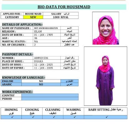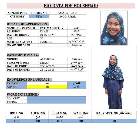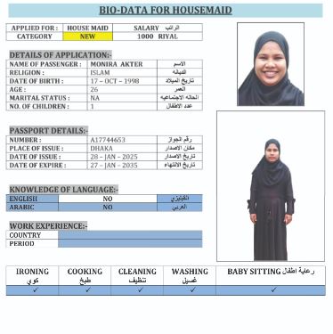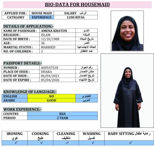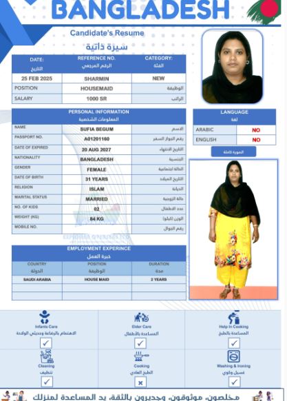 نوع الخدمة نوع الخدمة استقدام تأجير نقل خدمات الجنسية الجنسية الفلبين الهند مصر كينيا اثيوبيا بروندي بنغلاديش أوغندا أوغندا معروفة باكستان الفلبين معروفة اندونيسيا المهنة عاملة منزلية سائق خاص عاملة عناية زوجين ( عامله منزليه وسائق ) الديانة مسلم غير مسلم الخبرة سبق العمل لم يسبق العمل العمر العمر 15 16 17 18 19 20 21 22 23 24 25 26 27 28 29 30 31 32 33 34 35 36 37 38 39 40 41 42 43 44 45 46 47 48 49 50 51 52 53 54 55 56 57 58 59 60 الحالة العائلية الحالة العائلية اعزب متزوج مطلق ارمل اللغة اللغة العربية العربية العربية بنجالي نبالي فلبيني امهرية سواحلي عربي + لغتها الاساسية اندونيسي اوغندي بروندي الوزن الوزن 40 41 42 43 44 45 46 47 48 49 50 51 52 53 54 55 56 57 58 59 60 61 62 63 64 65 66 67 68 69 70 71 72 73 74 75 76 77 78 79 80 81 82 83 84 85 86 87 88 89 90 91 92 93 94 95 96 97 98 99 100 الطول الطول 100 101 102 103 104 105 106 107 108 109 110 111 112 113 114 115 116 117 118 119 120 121 122 123 124 125 126 127 128 129 130 131 132 133 134 135 136 137 138 139 140 141 142 143 144 145 146 147 148 149 150 151 152 153 154 155 156 157 158 159 160 161 162 163 164 165 166 167 168 169 170 171 172 173 174 175 176 177 178 179 180 181 182 183 184 185 186 187 188 189 190 الطلبات الطلبات التنظيف الغسيل الكوي الطبيخ العربي عناية الأطفال عناية كبار السن عناية الرضيع تعليم الأطفال التنظيف - الغسيل - الكوي التنظيف - الغسيل - الكوي- رغبة في تعلم الطبخ التنظيف - الغسيل - الكوي- رغبة في العناية بالاطفال بحث مسح بحث متقدم MST ANOWARA KHATUN بنغلاديش العمر 36 الخبرة لم يسبق العمل الديانة مسلم رقم الملف A08921536 حجز العاملة MONIRA AKTER بنغلاديش العمر 26 الخبرة لم يسبق العمل الديانة مسلم رقم الملف A17744653 حجز العاملة FATEMA KHATUN بنغلاديش العمر 30 الخبرة لم يسبق العمل الديانة مسلم رقم الملف A13340642 حجز العاملة AMENA KHATUN بنغلاديش العمر 36 الخبرة لم يسبق العمل الديانة مسلم رقم الملف A00547518 حجز العاملة SUFIA BEGUM بنغلاديش العمر 31 الخبرة لم يسبق العمل الديانة مسلم رقم الملف A01201160 حجز العاملة MONIRA BEGUM بنغلاديش العمر 36 الخبرة لم يسبق العمل الديانة مسلم رقم الملف A17531251 حجز العاملة MST SHIMA AKTHER بنغلاديش العمر 35 الخبرة لم يسبق العمل الديانة مسلم رقم الملف A17281889 حجز العاملة AKLEMA AKTER بنغلاديش العمر 37 الخبرة لم يسبق العمل الديانة مسلم رقم الملف A17072612 حجز العاملة ASMA BEGUM بنغلاديش العمر 39 الخبرة لم يسبق العمل الديانة مسلم رقم الملف A16845942 حجز العاملة RINA BEGUM بنغلاديش العمر 39 الخبرة لم يسبق العمل الديانة مسلم رقم الملف A12608496 حجز العاملة 7 8 9 10 11 12