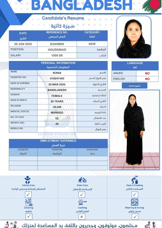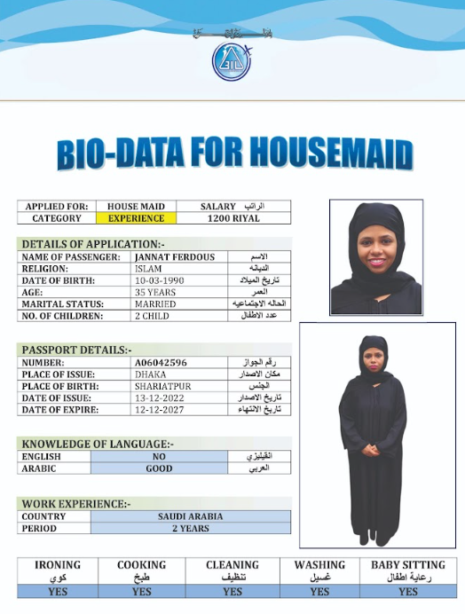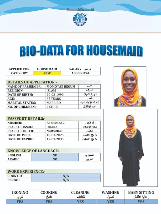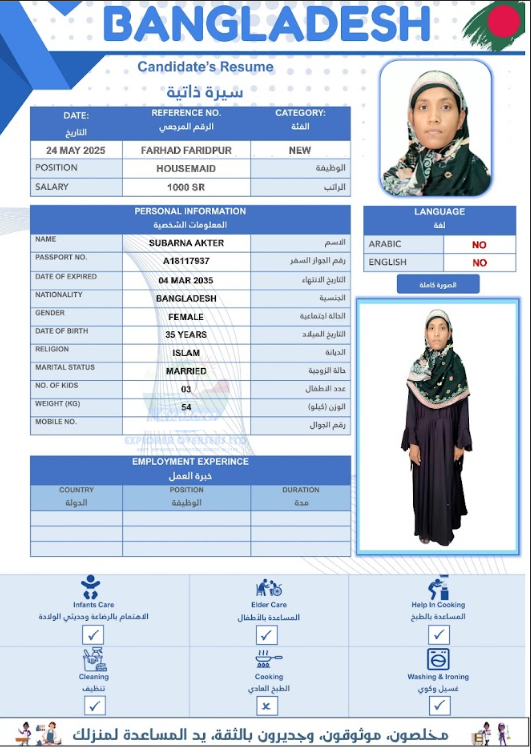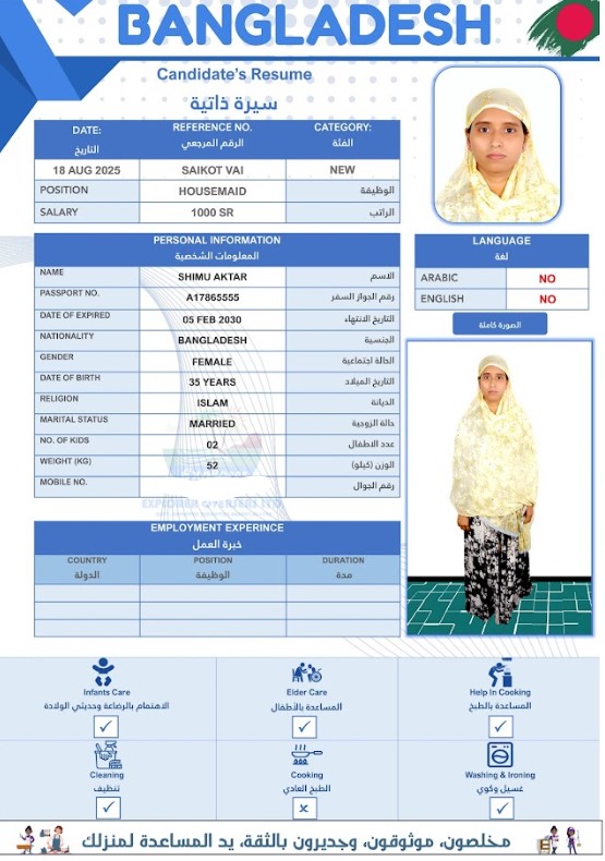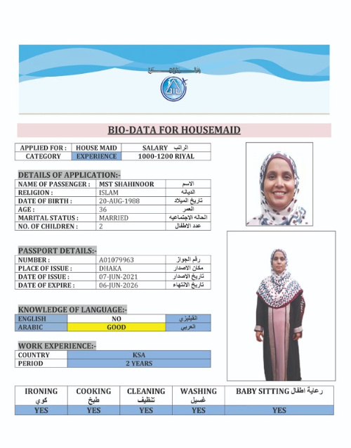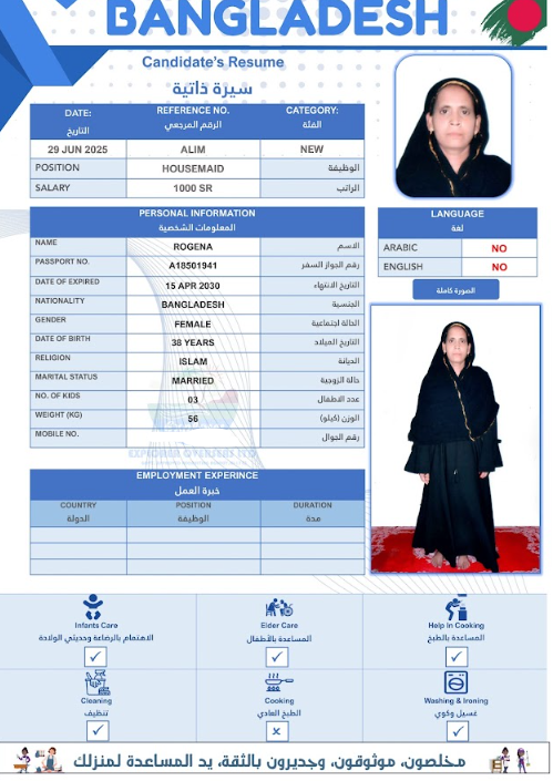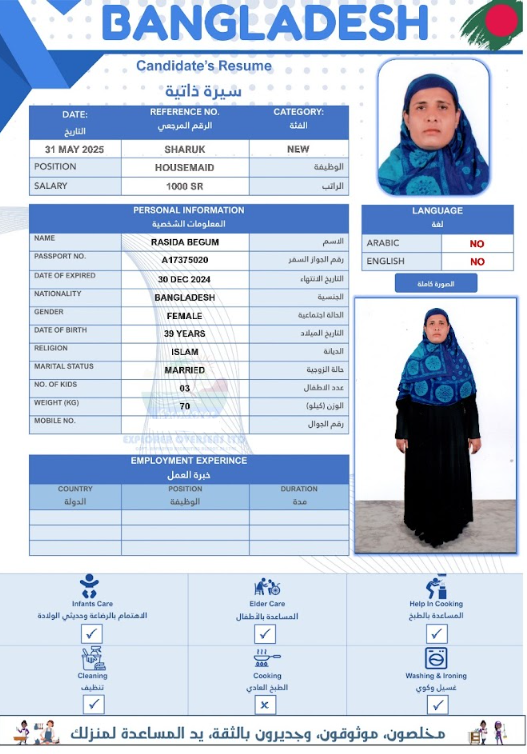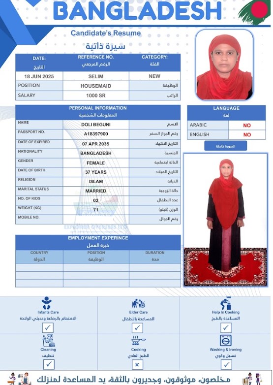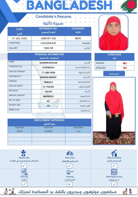 نوع الخدمة نوع الخدمة استقدام تأجير نقل خدمات الجنسية الجنسية الفلبين الهند مصر كينيا اثيوبيا بروندي بنغلاديش أوغندا أوغندا معروفة باكستان الفلبين معروفة اندونيسيا المهنة عاملة منزلية سائق خاص عاملة عناية زوجين ( عامله منزليه وسائق ) الديانة مسلم غير مسلم الخبرة سبق العمل لم يسبق العمل العمر العمر 15 16 17 18 19 20 21 22 23 24 25 26 27 28 29 30 31 32 33 34 35 36 37 38 39 40 41 42 43 44 45 46 47 48 49 50 51 52 53 54 55 56 57 58 59 60 الحالة العائلية الحالة العائلية اعزب متزوج مطلق ارمل اللغة اللغة العربية العربية العربية بنجالي نبالي فلبيني امهرية سواحلي عربي + لغتها الاساسية اندونيسي اوغندي بروندي الوزن الوزن 40 41 42 43 44 45 46 47 48 49 50 51 52 53 54 55 56 57 58 59 60 61 62 63 64 65 66 67 68 69 70 71 72 73 74 75 76 77 78 79 80 81 82 83 84 85 86 87 88 89 90 91 92 93 94 95 96 97 98 99 100 الطول الطول 100 101 102 103 104 105 106 107 108 109 110 111 112 113 114 115 116 117 118 119 120 121 122 123 124 125 126 127 128 129 130 131 132 133 134 135 136 137 138 139 140 141 142 143 144 145 146 147 148 149 150 151 152 153 154 155 156 157 158 159 160 161 162 163 164 165 166 167 168 169 170 171 172 173 174 175 176 177 178 179 180 181 182 183 184 185 186 187 188 189 190 الطلبات الطلبات التنظيف الغسيل الكوي الطبيخ العربي عناية الأطفال عناية كبار السن عناية الرضيع تعليم الأطفال التنظيف - الغسيل - الكوي التنظيف - الغسيل - الكوي- رغبة في تعلم الطبخ التنظيف - الغسيل - الكوي- رغبة في العناية بالاطفال بحث مسح بحث متقدم ROGENA بنغلاديش العمر 38 الخبرة لم يسبق العمل الديانة مسلم رقم الملف A18501941 حجز العاملة DOLI BEGUNI بنغلاديش العمر 37 الخبرة لم يسبق العمل الديانة مسلم رقم الملف A18397900 حجز العاملة sonia بنغلاديش العمر 28 الخبرة لم يسبق العمل الديانة مسلم رقم الملف A18247483 حجز العاملة SHIMU AKTAR بنغلاديش العمر 35 الخبرة لم يسبق العمل الديانة مسلم رقم الملف A17865555 حجز العاملة NASRIN BEGUM بنغلاديش العمر 31 الخبرة لم يسبق العمل الديانة مسلم رقم الملف A19080324 حجز العاملة RASIDA BEGUM بنغلاديش العمر 39 الخبرة لم يسبق العمل الديانة مسلم رقم الملف A17375020 حجز العاملة SUBARNA AKTER بنغلاديش العمر 35 الخبرة لم يسبق العمل الديانة مسلم رقم الملف A18117937 حجز العاملة MST SHAHINOOR بنغلاديش العمر 36 الخبرة لم يسبق العمل الديانة مسلم رقم الملف A01079963 حجز العاملة MOMOTAZ BEGUM بنغلاديش العمر 35 الخبرة لم يسبق العمل الديانة مسلم رقم الملف A18306642 حجز العاملة JANNAT FERDOUS بنغلاديش العمر 35 الخبرة لم يسبق العمل الديانة مسلم رقم الملف A06042596 حجز العاملة 1 2 3 4 5 6