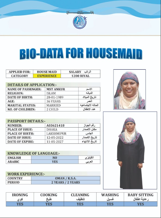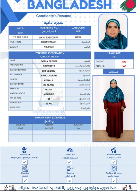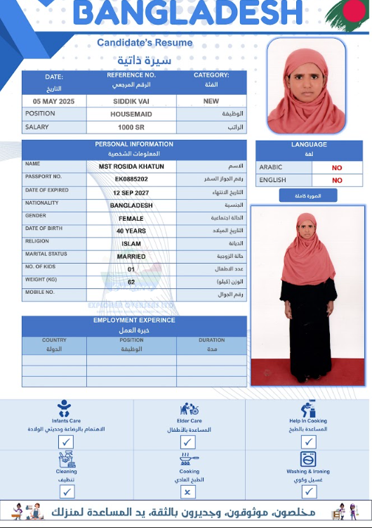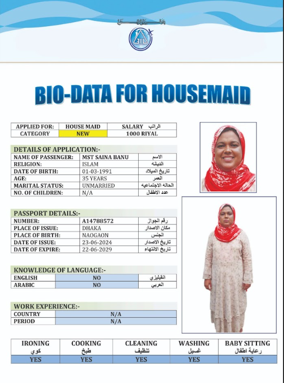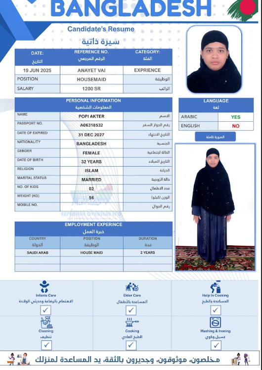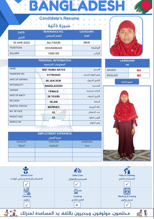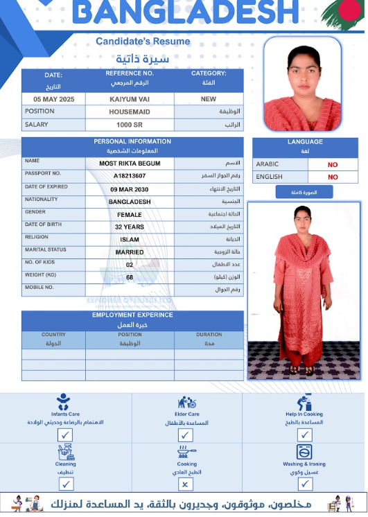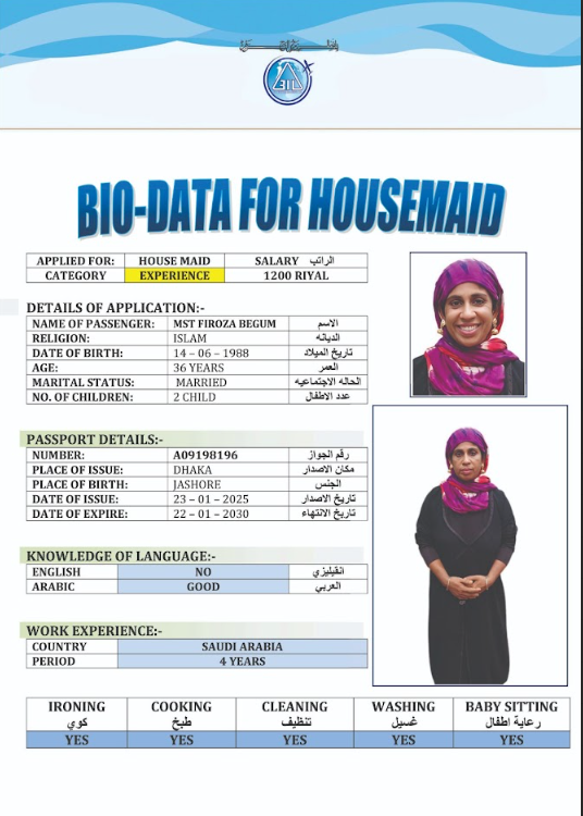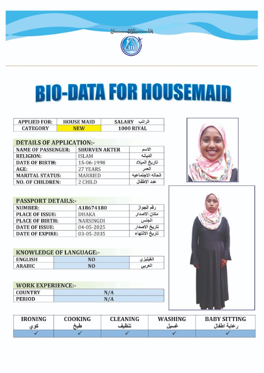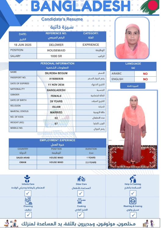 نوع الخدمة نوع الخدمة استقدام تأجير نقل خدمات الجنسية الجنسية الفلبين الهند مصر كينيا اثيوبيا بروندي بنغلاديش أوغندا أوغندا معروفة باكستان الفلبين معروفة اندونيسيا المهنة عاملة منزلية سائق خاص عاملة عناية زوجين ( عامله منزليه وسائق ) الديانة مسلم غير مسلم الخبرة سبق العمل لم يسبق العمل العمر العمر 15 16 17 18 19 20 21 22 23 24 25 26 27 28 29 30 31 32 33 34 35 36 37 38 39 40 41 42 43 44 45 46 47 48 49 50 51 52 53 54 55 56 57 58 59 60 الحالة العائلية الحالة العائلية اعزب متزوج مطلق ارمل اللغة اللغة العربية العربية العربية بنجالي نبالي فلبيني امهرية سواحلي عربي + لغتها الاساسية اندونيسي اوغندي بروندي الوزن الوزن 40 41 42 43 44 45 46 47 48 49 50 51 52 53 54 55 56 57 58 59 60 61 62 63 64 65 66 67 68 69 70 71 72 73 74 75 76 77 78 79 80 81 82 83 84 85 86 87 88 89 90 91 92 93 94 95 96 97 98 99 100 الطول الطول 100 101 102 103 104 105 106 107 108 109 110 111 112 113 114 115 116 117 118 119 120 121 122 123 124 125 126 127 128 129 130 131 132 133 134 135 136 137 138 139 140 141 142 143 144 145 146 147 148 149 150 151 152 153 154 155 156 157 158 159 160 161 162 163 164 165 166 167 168 169 170 171 172 173 174 175 176 177 178 179 180 181 182 183 184 185 186 187 188 189 190 الطلبات الطلبات التنظيف الغسيل الكوي الطبيخ العربي عناية الأطفال عناية كبار السن عناية الرضيع تعليم الأطفال التنظيف - الغسيل - الكوي التنظيف - الغسيل - الكوي- رغبة في تعلم الطبخ التنظيف - الغسيل - الكوي- رغبة في العناية بالاطفال بحث مسح بحث متقدم POPI AKTER بنغلاديش العمر 32 الخبرة لم يسبق العمل الديانة مسلم رقم الملف A06318532 حجز العاملة MOYNA AKTER بنغلاديش العمر 28 الخبرة لم يسبق العمل الديانة مسلم رقم الملف A06013212 حجز العاملة DILROBA BEGUM بنغلاديش العمر 39 الخبرة لم يسبق العمل الديانة مسلم رقم الملف A16860926 حجز العاملة MST RUMA AKTER بنغلاديش العمر 28 الخبرة لم يسبق العمل الديانة مسلم رقم الملف A17503445 حجز العاملة MOST RIKTA BEGUM بنغلاديش العمر 32 الخبرة لم يسبق العمل الديانة مسلم رقم الملف A18213607 حجز العاملة MST ROSIDA KHATUN بنغلاديش العمر 40 الخبرة لم يسبق العمل الديانة مسلم رقم الملف EK0885202 حجز العاملة MST SAINA BANU بنغلاديش العمر 35 الخبرة لم يسبق العمل الديانة مسلم رقم الملف A14788572 حجز العاملة MST FIROZA BEGUM بنغلاديش العمر 36 الخبرة لم يسبق العمل الديانة مسلم رقم الملف A09198196 حجز العاملة MST ANKUR بنغلاديش العمر 36 الخبرة لم يسبق العمل الديانة مسلم رقم الملف A03621418 حجز العاملة SHURVEN AKTER بنغلاديش العمر 27 الخبرة لم يسبق العمل الديانة مسلم رقم الملف A18674180 حجز العاملة 1 2 3 4 5 6 7
