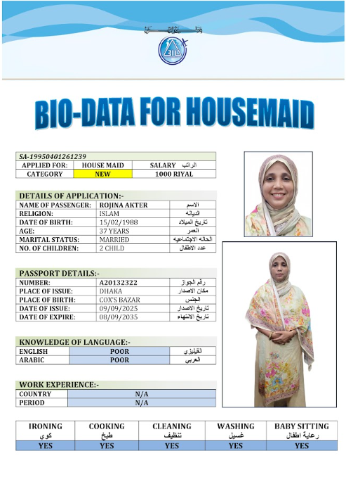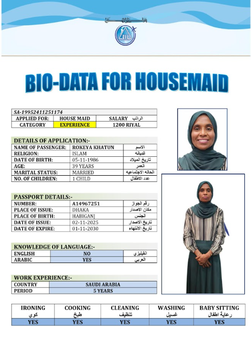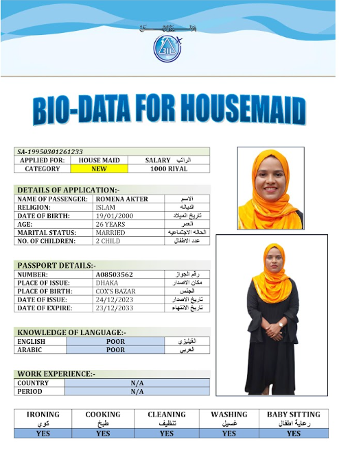 نوع الخدمة نوع الخدمة استقدام تأجير نقل خدمات الجنسية الجنسية الفلبين الهند مصر كينيا اثيوبيا بروندي بنغلاديش أوغندا أوغندا معروفة باكستان الفلبين معروفة اندونيسيا المهنة عاملة منزلية سائق خاص عاملة عناية زوجين ( عامله منزليه وسائق ) الديانة مسلم غير مسلم الخبرة سبق العمل لم يسبق العمل العمر العمر 15 16 17 18 19 20 21 22 23 24 25 26 27 28 29 30 31 32 33 34 35 36 37 38 39 40 41 42 43 44 45 46 47 48 49 50 51 52 53 54 55 56 57 58 59 60 الحالة العائلية الحالة العائلية اعزب متزوج مطلق ارمل اللغة اللغة العربية العربية العربية بنجالي نبالي فلبيني امهرية سواحلي عربي + لغتها الاساسية اندونيسي اوغندي بروندي الوزن الوزن 40 41 42 43 44 45 46 47 48 49 50 51 52 53 54 55 56 57 58 59 60 61 62 63 64 65 66 67 68 69 70 71 72 73 74 75 76 77 78 79 80 81 82 83 84 85 86 87 88 89 90 91 92 93 94 95 96 97 98 99 100 الطول الطول 100 101 102 103 104 105 106 107 108 109 110 111 112 113 114 115 116 117 118 119 120 121 122 123 124 125 126 127 128 129 130 131 132 133 134 135 136 137 138 139 140 141 142 143 144 145 146 147 148 149 150 151 152 153 154 155 156 157 158 159 160 161 162 163 164 165 166 167 168 169 170 171 172 173 174 175 176 177 178 179 180 181 182 183 184 185 186 187 188 189 190 الطلبات الطلبات التنظيف الغسيل الكوي الطبيخ العربي عناية الأطفال عناية كبار السن عناية الرضيع تعليم الأطفال التنظيف - الغسيل - الكوي التنظيف - الغسيل - الكوي- رغبة في تعلم الطبخ التنظيف - الغسيل - الكوي- رغبة في العناية بالاطفال بحث مسح بحث متقدم MST DOLI BEGUM بنغلاديش العمر 28 الخبرة لم يسبق العمل الديانة مسلم رقم الملف A20967050 حجز العاملة KOHINUR BEGUM بنغلاديش العمر 40 الخبرة لم يسبق العمل الديانة مسلم رقم الملف A20377918 حجز العاملة KHORSADA بنغلاديش العمر 43 الخبرة سبق العمل الديانة مسلم رقم الملف EL0406819 حجز العاملة KHALEDA BEGUM بنغلاديش العمر 43 الخبرة سبق العمل الديانة مسلم رقم الملف EK0439572 حجز العاملة JOSNA BEGUM بنغلاديش العمر 32 الخبرة لم يسبق العمل الديانة مسلم رقم الملف A08986258 حجز العاملة FATEMA BEGUM بنغلاديش العمر 35 الخبرة سبق العمل الديانة مسلم رقم الملف A09154998 حجز العاملة PINJIRA KHATUN بنغلاديش العمر 28 الخبرة لم يسبق العمل الديانة مسلم رقم الملف A09399421 حجز العاملة ROJINA AKTER بنغلاديش العمر 37 الخبرة لم يسبق العمل الديانة مسلم رقم الملف A20132322 حجز العاملة ROKEYA KHATUN بنغلاديش العمر 39 الخبرة سبق العمل الديانة مسلم رقم الملف A14967251 حجز العاملة ROMENA AKTER بنغلاديش العمر 26 الخبرة لم يسبق العمل الديانة مسلم رقم الملف A08503562 حجز العاملة 1 2 3 4 5 6 7