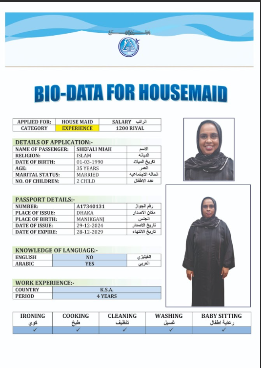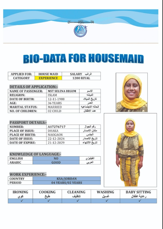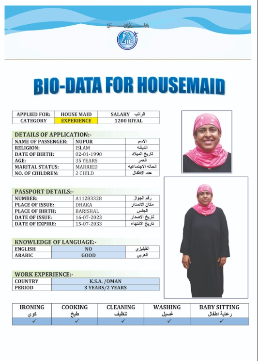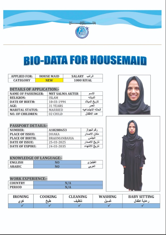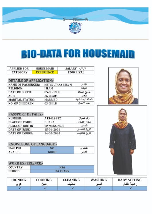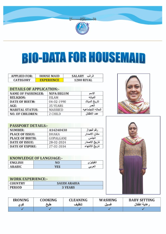 نوع الخدمة نوع الخدمة استقدام تأجير نقل خدمات الجنسية الجنسية الفلبين الهند مصر كينيا اثيوبيا بروندي بنغلاديش أوغندا أوغندا معروفة باكستان الفلبين معروفة اندونيسيا المهنة عاملة منزلية سائق خاص عاملة عناية زوجين ( عامله منزليه وسائق ) الديانة مسلم غير مسلم الخبرة سبق العمل لم يسبق العمل العمر العمر 15 16 17 18 19 20 21 22 23 24 25 26 27 28 29 30 31 32 33 34 35 36 37 38 39 40 41 42 43 44 45 46 47 48 49 50 51 52 53 54 55 56 57 58 59 60 الحالة العائلية الحالة العائلية اعزب متزوج مطلق ارمل اللغة اللغة العربية العربية العربية بنجالي نبالي فلبيني امهرية سواحلي عربي + لغتها الاساسية اندونيسي اوغندي بروندي الوزن الوزن 40 41 42 43 44 45 46 47 48 49 50 51 52 53 54 55 56 57 58 59 60 61 62 63 64 65 66 67 68 69 70 71 72 73 74 75 76 77 78 79 80 81 82 83 84 85 86 87 88 89 90 91 92 93 94 95 96 97 98 99 100 الطول الطول 100 101 102 103 104 105 106 107 108 109 110 111 112 113 114 115 116 117 118 119 120 121 122 123 124 125 126 127 128 129 130 131 132 133 134 135 136 137 138 139 140 141 142 143 144 145 146 147 148 149 150 151 152 153 154 155 156 157 158 159 160 161 162 163 164 165 166 167 168 169 170 171 172 173 174 175 176 177 178 179 180 181 182 183 184 185 186 187 188 189 190 الطلبات الطلبات التنظيف الغسيل الكوي الطبيخ العربي عناية الأطفال عناية كبار السن عناية الرضيع تعليم الأطفال التنظيف - الغسيل - الكوي التنظيف - الغسيل - الكوي- رغبة في تعلم الطبخ التنظيف - الغسيل - الكوي- رغبة في العناية بالاطفال بحث مسح بحث متقدم SHEFALI MIAH بنغلاديش العمر 35 الخبرة لم يسبق العمل الديانة مسلم رقم الملف A17340131 حجز العاملة RUKSANA بنغلاديش العمر 30 الخبرة لم يسبق العمل الديانة مسلم رقم الملف A02254666 حجز العاملة RABEYA BEGUM بنغلاديش العمر 35 الخبرة لم يسبق العمل الديانة مسلم رقم الملف A09034240 حجز العاملة PARVIN BEGUM بنغلاديش العمر 35 الخبرة لم يسبق العمل الديانة مسلم رقم الملف A03813428 حجز العاملة NUPUR بنغلاديش العمر 35 الخبرة لم يسبق العمل الديانة مسلم رقم الملف A11283328 حجز العاملة NIPA BEGUM بنغلاديش العمر 35 الخبرة لم يسبق العمل الديانة مسلم رقم الملف A14240430 حجز العاملة MST TAHIYA AKTHER بنغلاديش العمر 25 الخبرة لم يسبق العمل الديانة مسلم رقم الملف A18945755 حجز العاملة MST SULTANA BEGUM بنغلاديش العمر 36 الخبرة لم يسبق العمل الديانة مسلم رقم الملف A15419932 حجز العاملة MST SELENA BEGUM بنغلاديش العمر 36 الخبرة لم يسبق العمل الديانة مسلم رقم الملف A17276717 حجز العاملة MST SALMA بنغلاديش العمر 31 الخبرة لم يسبق العمل الديانة مسلم رقم الملف A18288653 حجز العاملة 1 2 3 4 5 6 7 8