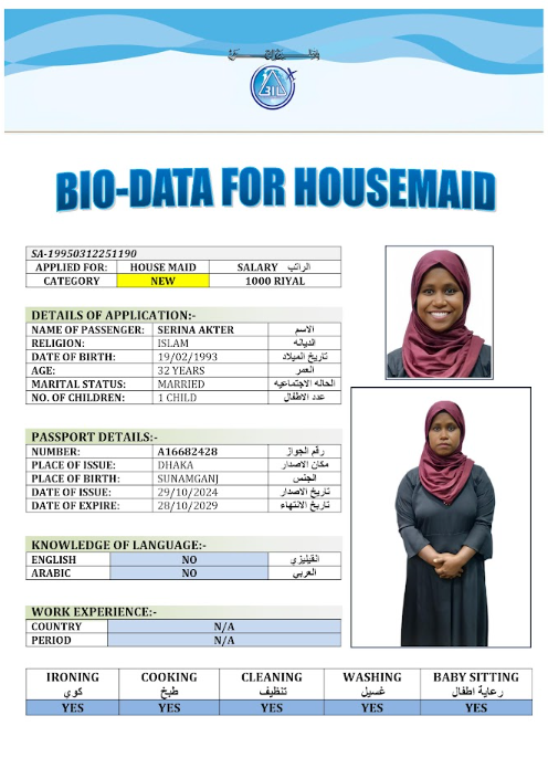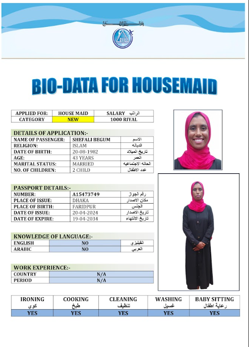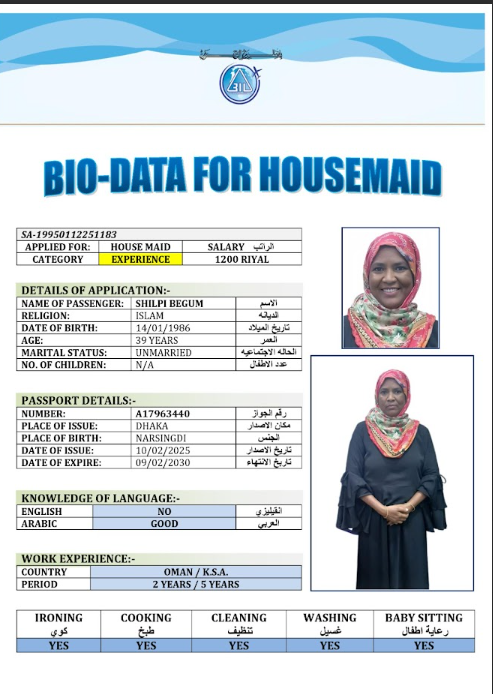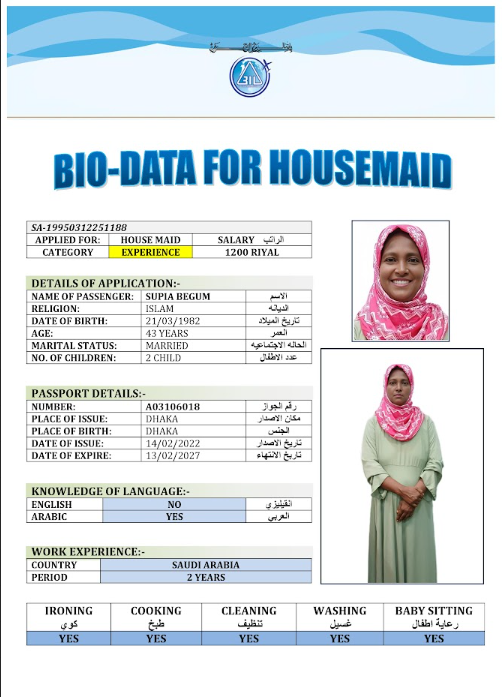 نوع الخدمة نوع الخدمة استقدام تأجير نقل خدمات الجنسية الجنسية الفلبين الهند مصر كينيا اثيوبيا بروندي بنغلاديش أوغندا أوغندا معروفة باكستان الفلبين معروفة اندونيسيا المهنة عاملة منزلية سائق خاص عاملة عناية زوجين ( عامله منزليه وسائق ) الديانة مسلم غير مسلم الخبرة سبق العمل لم يسبق العمل العمر العمر 15 16 17 18 19 20 21 22 23 24 25 26 27 28 29 30 31 32 33 34 35 36 37 38 39 40 41 42 43 44 45 46 47 48 49 50 51 52 53 54 55 56 57 58 59 60 الحالة العائلية الحالة العائلية اعزب متزوج مطلق ارمل اللغة اللغة العربية العربية العربية بنجالي نبالي فلبيني امهرية سواحلي عربي + لغتها الاساسية اندونيسي اوغندي بروندي الوزن الوزن 40 41 42 43 44 45 46 47 48 49 50 51 52 53 54 55 56 57 58 59 60 61 62 63 64 65 66 67 68 69 70 71 72 73 74 75 76 77 78 79 80 81 82 83 84 85 86 87 88 89 90 91 92 93 94 95 96 97 98 99 100 الطول الطول 100 101 102 103 104 105 106 107 108 109 110 111 112 113 114 115 116 117 118 119 120 121 122 123 124 125 126 127 128 129 130 131 132 133 134 135 136 137 138 139 140 141 142 143 144 145 146 147 148 149 150 151 152 153 154 155 156 157 158 159 160 161 162 163 164 165 166 167 168 169 170 171 172 173 174 175 176 177 178 179 180 181 182 183 184 185 186 187 188 189 190 الطلبات الطلبات التنظيف الغسيل الكوي الطبيخ العربي عناية الأطفال عناية كبار السن عناية الرضيع تعليم الأطفال التنظيف - الغسيل - الكوي التنظيف - الغسيل - الكوي- رغبة في تعلم الطبخ التنظيف - الغسيل - الكوي- رغبة في العناية بالاطفال بحث مسح بحث متقدم SAHIDA بنغلاديش العمر 32 الخبرة لم يسبق العمل الديانة مسلم رقم الملف A19076900 حجز العاملة SAJADA بنغلاديش العمر 38 الخبرة سبق العمل الديانة مسلم رقم الملف EL0906365 حجز العاملة FARIDA BEGUM بنغلاديش العمر 40 الخبرة لم يسبق العمل الديانة مسلم رقم الملف A06306048 حجز العاملة FARIDA AKTER بنغلاديش العمر 32 الخبرة لم يسبق العمل الديانة مسلم رقم الملف A19197889 حجز العاملة SALMA AKTER بنغلاديش العمر 29 الخبرة لم يسبق العمل الديانة مسلم رقم الملف A16868689 حجز العاملة SERINA AKTER بنغلاديش العمر 32 الخبرة لم يسبق العمل الديانة مسلم رقم الملف A16682428 حجز العاملة SHEFALI BEGUM بنغلاديش العمر 43 الخبرة لم يسبق العمل الديانة مسلم رقم الملف A15473749 حجز العاملة SHILPI BEGUM بنغلاديش العمر 39 الخبرة سبق العمل الديانة مسلم رقم الملف A17963440 حجز العاملة SUPIA BEGUM بنغلاديش العمر 43 الخبرة سبق العمل الديانة مسلم رقم الملف A03106018 حجز العاملة TASMIN AKTER بنغلاديش العمر 37 الخبرة لم يسبق العمل الديانة مسلم رقم الملف A08509102 حجز العاملة 1 2 3 4 5 6 7 8