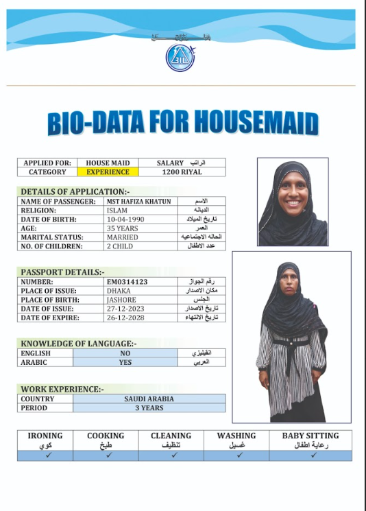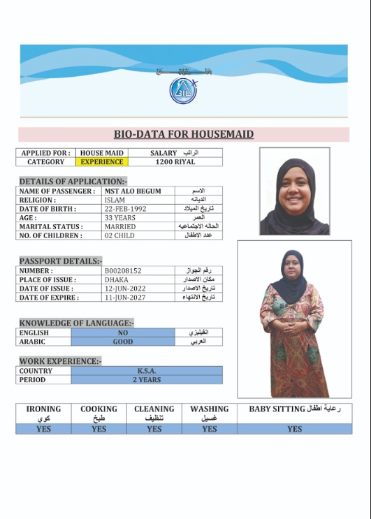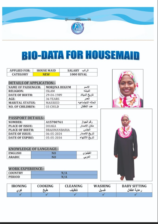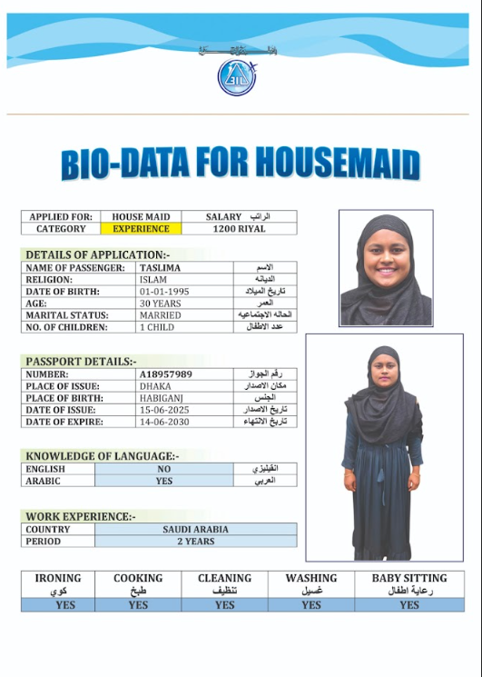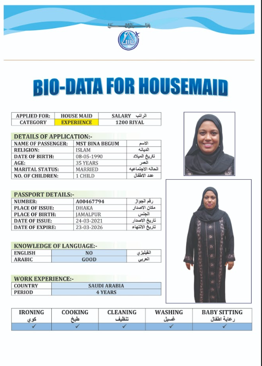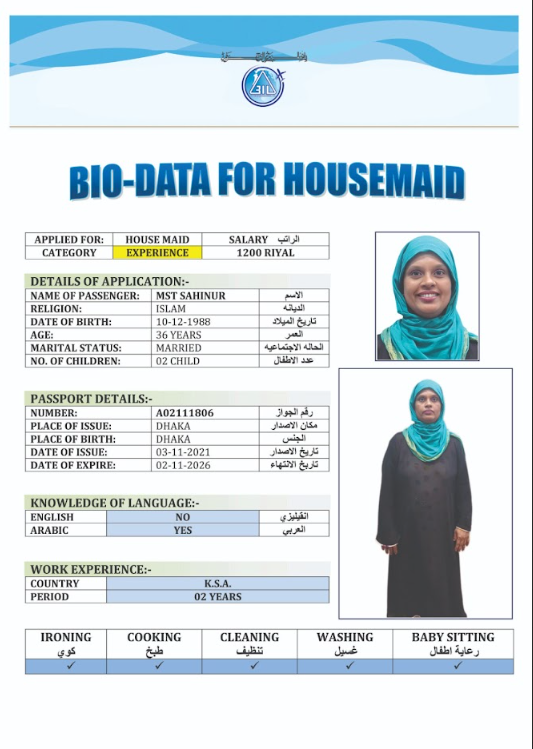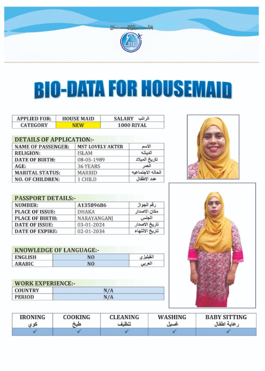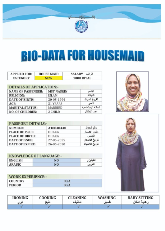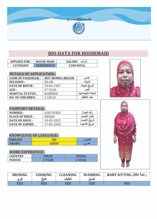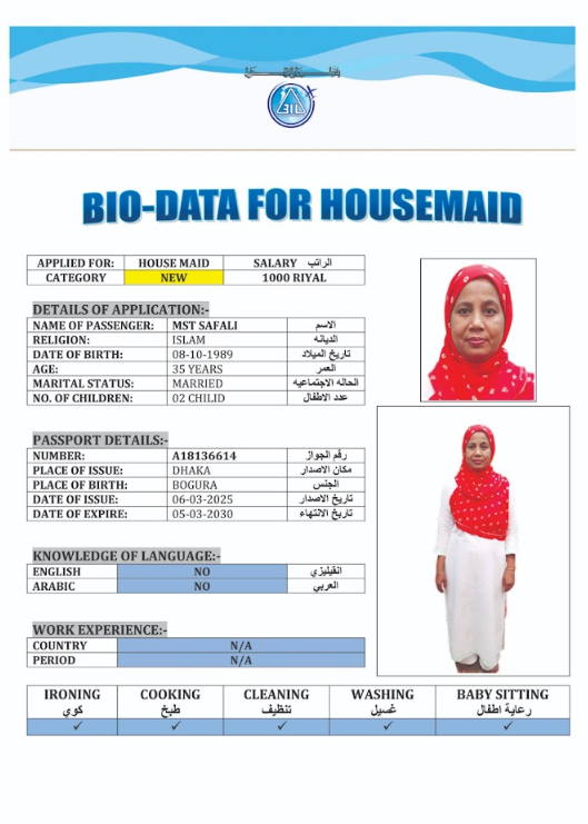 نوع الخدمة نوع الخدمة استقدام تأجير نقل خدمات الجنسية الجنسية الفلبين الهند مصر كينيا اثيوبيا بروندي بنغلاديش أوغندا أوغندا معروفة باكستان الفلبين معروفة اندونيسيا المهنة عاملة منزلية سائق خاص عاملة عناية زوجين ( عامله منزليه وسائق ) الديانة مسلم غير مسلم الخبرة سبق العمل لم يسبق العمل العمر العمر 15 16 17 18 19 20 21 22 23 24 25 26 27 28 29 30 31 32 33 34 35 36 37 38 39 40 41 42 43 44 45 46 47 48 49 50 51 52 53 54 55 56 57 58 59 60 الحالة العائلية الحالة العائلية اعزب متزوج مطلق ارمل اللغة اللغة العربية العربية العربية بنجالي نبالي فلبيني امهرية سواحلي عربي + لغتها الاساسية اندونيسي اوغندي بروندي الوزن الوزن 40 41 42 43 44 45 46 47 48 49 50 51 52 53 54 55 56 57 58 59 60 61 62 63 64 65 66 67 68 69 70 71 72 73 74 75 76 77 78 79 80 81 82 83 84 85 86 87 88 89 90 91 92 93 94 95 96 97 98 99 100 الطول الطول 100 101 102 103 104 105 106 107 108 109 110 111 112 113 114 115 116 117 118 119 120 121 122 123 124 125 126 127 128 129 130 131 132 133 134 135 136 137 138 139 140 141 142 143 144 145 146 147 148 149 150 151 152 153 154 155 156 157 158 159 160 161 162 163 164 165 166 167 168 169 170 171 172 173 174 175 176 177 178 179 180 181 182 183 184 185 186 187 188 189 190 الطلبات الطلبات التنظيف الغسيل الكوي الطبيخ العربي عناية الأطفال عناية كبار السن عناية الرضيع تعليم الأطفال التنظيف - الغسيل - الكوي التنظيف - الغسيل - الكوي- رغبة في تعلم الطبخ التنظيف - الغسيل - الكوي- رغبة في العناية بالاطفال بحث مسح بحث متقدم MST SAHINUR بنغلاديش العمر 36 الخبرة لم يسبق العمل الديانة مسلم رقم الملف A02111806 حجز العاملة TASLIMA بنغلاديش العمر 30 الخبرة لم يسبق العمل الديانة مسلم رقم الملف A18957989 حجز العاملة MST SAFARI بنغلاديش العمر 35 الخبرة لم يسبق العمل الديانة مسلم رقم الملف A18136614 حجز العاملة MST RUMNA BEGUM بنغلاديش العمر 37 الخبرة لم يسبق العمل الديانة مسلم رقم الملف A18739383 حجز العاملة MST NASRIN بنغلاديش العمر 31 الخبرة لم يسبق العمل الديانة مسلم رقم الملف A18838430 حجز العاملة MST LOVERLY AKTER بنغلاديش العمر 36 الخبرة سبق العمل الديانة مسلم رقم الملف A13589686 حجز العاملة MST HAFIZA KHATUN بنغلاديش العمر 35 الخبرة لم يسبق العمل الديانة مسلم رقم الملف EM0314123 حجز العاملة MST BINA BEGUM بنغلاديش العمر 35 الخبرة لم يسبق العمل الديانة مسلم رقم الملف A00467794 حجز العاملة MST ALO BEGUM بنغلاديش العمر 33 الخبرة لم يسبق العمل الديانة مسلم رقم الملف B00208152 حجز العاملة MORJINA BEGUM بنغلاديش العمر 36 الخبرة لم يسبق العمل الديانة مسلم رقم الملف A15700761 حجز العاملة 1 2 3 4 5 6 7 8 9