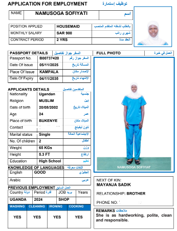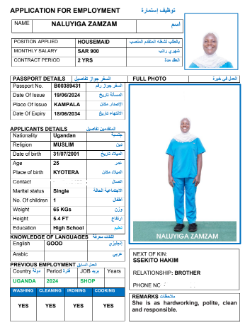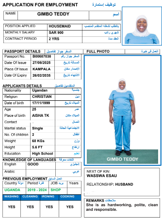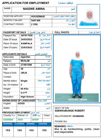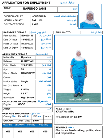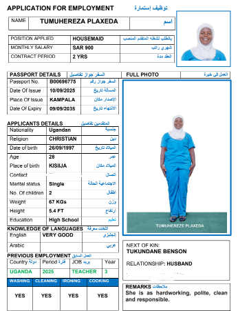 نوع الخدمة نوع الخدمة استقدام تأجير نقل خدمات الجنسية الجنسية الفلبين الهند مصر كينيا اثيوبيا بروندي بنغلاديش أوغندا أوغندا معروفة باكستان الفلبين معروفة اندونيسيا المهنة عاملة منزلية سائق خاص عاملة عناية زوجين ( عامله منزليه وسائق ) الديانة مسلم غير مسلم الخبرة سبق العمل لم يسبق العمل العمر العمر 15 16 17 18 19 20 21 22 23 24 25 26 27 28 29 30 31 32 33 34 35 36 37 38 39 40 41 42 43 44 45 46 47 48 49 50 51 52 53 54 55 56 57 58 59 60 الحالة العائلية الحالة العائلية اعزب متزوج مطلق ارمل اللغة اللغة العربية العربية العربية بنجالي نبالي فلبيني امهرية سواحلي عربي + لغتها الاساسية اندونيسي اوغندي بروندي الوزن الوزن 40 41 42 43 44 45 46 47 48 49 50 51 52 53 54 55 56 57 58 59 60 61 62 63 64 65 66 67 68 69 70 71 72 73 74 75 76 77 78 79 80 81 82 83 84 85 86 87 88 89 90 91 92 93 94 95 96 97 98 99 100 الطول الطول 100 101 102 103 104 105 106 107 108 109 110 111 112 113 114 115 116 117 118 119 120 121 122 123 124 125 126 127 128 129 130 131 132 133 134 135 136 137 138 139 140 141 142 143 144 145 146 147 148 149 150 151 152 153 154 155 156 157 158 159 160 161 162 163 164 165 166 167 168 169 170 171 172 173 174 175 176 177 178 179 180 181 182 183 184 185 186 187 188 189 190 الطلبات الطلبات التنظيف الغسيل الكوي الطبيخ العربي عناية الأطفال عناية كبار السن عناية الرضيع تعليم الأطفال التنظيف - الغسيل - الكوي التنظيف - الغسيل - الكوي- رغبة في تعلم الطبخ التنظيف - الغسيل - الكوي- رغبة في العناية بالاطفال بحث مسح بحث متقدم NAMUSOGA SOFIYATI أوغندا العمر 24 الخبرة لم يسبق العمل الديانة مسلم رقم الملف B00737420 حجز العاملة NALUYIGA ZAMZAM أوغندا العمر 20 الخبرة لم يسبق العمل الديانة مسلم رقم الملف B00389431 حجز العاملة NAIGWE AMINA أوغندا العمر 38 الخبرة لم يسبق العمل الديانة مسلم رقم الملف A01071028 حجز العاملة GIMBO TEDDY أوغندا العمر 25 الخبرة لم يسبق العمل الديانة غير مسلم رقم الملف B00687038 حجز العاملة BISIGWA PATIENCE أوغندا العمر 29 الخبرة لم يسبق العمل الديانة غير مسلم رقم الملف B00681075 حجز العاملة TUMUHEREZA PLAXEDA أوغندا العمر 28 الخبرة لم يسبق العمل الديانة غير مسلم رقم الملف B00696775 حجز العاملة NATURINDA JUSTINA أوغندا العمر 40 الخبرة لم يسبق العمل الديانة غير مسلم رقم الملف B00656050 حجز العاملة NASSALI CHRISTINE أوغندا العمر 31 الخبرة لم يسبق العمل الديانة غير مسلم رقم الملف A00572966 حجز العاملة NAFUNGO JANE أوغندا العمر 38 الخبرة لم يسبق العمل الديانة غير مسلم رقم الملف B00620115 حجز العاملة NABBOSA HARRIET أوغندا العمر 34 الخبرة لم يسبق العمل الديانة غير مسلم رقم الملف B00486820 حجز العاملة 1 2 3 4