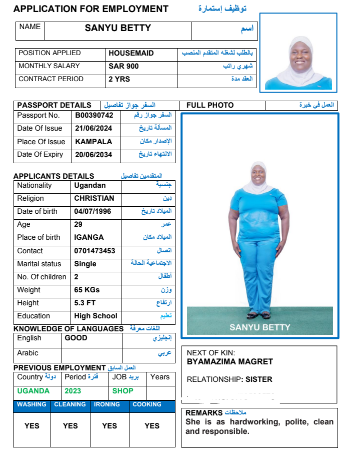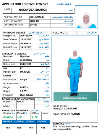 نوع الخدمة نوع الخدمة استقدام تأجير نقل خدمات الجنسية الجنسية الفلبين الهند مصر كينيا اثيوبيا بروندي بنغلاديش أوغندا أوغندا معروفة باكستان الفلبين معروفة اندونيسيا المهنة عاملة منزلية سائق خاص عاملة عناية زوجين ( عامله منزليه وسائق ) الديانة مسلم غير مسلم الخبرة سبق العمل لم يسبق العمل العمر العمر 15 16 17 18 19 20 21 22 23 24 25 26 27 28 29 30 31 32 33 34 35 36 37 38 39 40 41 42 43 44 45 46 47 48 49 50 51 52 53 54 55 56 57 58 59 60 الحالة العائلية الحالة العائلية اعزب متزوج مطلق ارمل اللغة اللغة العربية العربية العربية بنجالي نبالي فلبيني امهرية سواحلي عربي + لغتها الاساسية اندونيسي اوغندي بروندي الوزن الوزن 40 41 42 43 44 45 46 47 48 49 50 51 52 53 54 55 56 57 58 59 60 61 62 63 64 65 66 67 68 69 70 71 72 73 74 75 76 77 78 79 80 81 82 83 84 85 86 87 88 89 90 91 92 93 94 95 96 97 98 99 100 الطول الطول 100 101 102 103 104 105 106 107 108 109 110 111 112 113 114 115 116 117 118 119 120 121 122 123 124 125 126 127 128 129 130 131 132 133 134 135 136 137 138 139 140 141 142 143 144 145 146 147 148 149 150 151 152 153 154 155 156 157 158 159 160 161 162 163 164 165 166 167 168 169 170 171 172 173 174 175 176 177 178 179 180 181 182 183 184 185 186 187 188 189 190 الطلبات الطلبات التنظيف الغسيل الكوي الطبيخ العربي عناية الأطفال عناية كبار السن عناية الرضيع تعليم الأطفال التنظيف - الغسيل - الكوي التنظيف - الغسيل - الكوي- رغبة في تعلم الطبخ التنظيف - الغسيل - الكوي- رغبة في العناية بالاطفال بحث مسح بحث متقدم NAMAYANJA SHANITAH أوغندا العمر 23 الخبرة لم يسبق العمل الديانة مسلم رقم الملف B00762990 حجز العاملة KYARISIIMA RUTH أوغندا العمر 28 الخبرة لم يسبق العمل الديانة غير مسلم رقم الملف A00623213 حجز العاملة AKECTH JANE BORIS أوغندا العمر 38 الخبرة لم يسبق العمل الديانة غير مسلم رقم الملف B00331446 حجز العاملة SANYU BETTY أوغندا العمر 29 الخبرة لم يسبق العمل الديانة غير مسلم رقم الملف B00390742 حجز العاملة NAKAYUZA SHARON أوغندا العمر 27 الخبرة لم يسبق العمل الديانة غير مسلم رقم الملف B00749200 حجز العاملة KATOOKO BIIBA أوغندا العمر 25 الخبرة لم يسبق العمل الديانة مسلم رقم الملف A00825412 حجز العاملة TUGANTIRWE SURAINAH أوغندا العمر 36 الخبرة لم يسبق العمل الديانة مسلم رقم الملف B00371747 حجز العاملة NANGOBI AISHA أوغندا العمر 32 الخبرة لم يسبق العمل الديانة مسلم رقم الملف B00041553 حجز العاملة NANDAGO RUTH أوغندا العمر 37 الخبرة لم يسبق العمل الديانة غير مسلم رقم الملف A00380619 حجز العاملة SAANO FLORENCE أوغندا العمر 33 الخبرة لم يسبق العمل الديانة غير مسلم رقم الملف A00792478 حجز العاملة 1 2 3 4