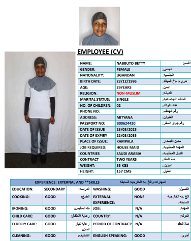 نوع الخدمة نوع الخدمة استقدام تأجير نقل خدمات الجنسية الجنسية الفلبين الهند مصر كينيا اثيوبيا بروندي بنغلاديش أوغندا أوغندا معروفة باكستان الفلبين معروفة اندونيسيا المهنة عاملة منزلية سائق خاص عاملة عناية زوجين ( عامله منزليه وسائق ) الديانة مسلم غير مسلم الخبرة سبق العمل لم يسبق العمل العمر العمر 15 16 17 18 19 20 21 22 23 24 25 26 27 28 29 30 31 32 33 34 35 36 37 38 39 40 41 42 43 44 45 46 47 48 49 50 51 52 53 54 55 56 57 58 59 60 الحالة العائلية الحالة العائلية اعزب متزوج مطلق ارمل اللغة اللغة العربية العربية العربية بنجالي نبالي فلبيني امهرية سواحلي عربي + لغتها الاساسية اندونيسي اوغندي بروندي الوزن الوزن 40 41 42 43 44 45 46 47 48 49 50 51 52 53 54 55 56 57 58 59 60 61 62 63 64 65 66 67 68 69 70 71 72 73 74 75 76 77 78 79 80 81 82 83 84 85 86 87 88 89 90 91 92 93 94 95 96 97 98 99 100 الطول الطول 100 101 102 103 104 105 106 107 108 109 110 111 112 113 114 115 116 117 118 119 120 121 122 123 124 125 126 127 128 129 130 131 132 133 134 135 136 137 138 139 140 141 142 143 144 145 146 147 148 149 150 151 152 153 154 155 156 157 158 159 160 161 162 163 164 165 166 167 168 169 170 171 172 173 174 175 176 177 178 179 180 181 182 183 184 185 186 187 188 189 190 الطلبات الطلبات التنظيف الغسيل الكوي الطبيخ العربي عناية الأطفال عناية كبار السن عناية الرضيع تعليم الأطفال التنظيف - الغسيل - الكوي التنظيف - الغسيل - الكوي- رغبة في تعلم الطبخ التنظيف - الغسيل - الكوي- رغبة في العناية بالاطفال بحث مسح بحث متقدم NASSIWA SALAAMA أوغندا العمر 28 الخبرة لم يسبق العمل الديانة غير مسلم رقم الملف A00866648 حجز العاملة NAMBUYA RITAH أوغندا العمر 26 الخبرة لم يسبق العمل الديانة غير مسلم رقم الملف B00669981 حجز العاملة NAKAMATTE BETTINA أوغندا العمر 28 الخبرة لم يسبق العمل الديانة غير مسلم رقم الملف A00845384 حجز العاملة NABBUTO BETTY أوغندا العمر 29 الخبرة لم يسبق العمل الديانة غير مسلم رقم الملف B00624420 حجز العاملة NAIGWE AMINA أوغندا العمر 38 الخبرة لم يسبق العمل الديانة مسلم رقم الملف A01071028 حجز العاملة NASSALI CHRISTINE أوغندا العمر 31 الخبرة لم يسبق العمل الديانة غير مسلم رقم الملف A00572966 حجز العاملة NAFUNGO JANE أوغندا العمر 38 الخبرة لم يسبق العمل الديانة غير مسلم رقم الملف B00620115 حجز العاملة NABBOSA HARRIET أوغندا العمر 34 الخبرة لم يسبق العمل الديانة غير مسلم رقم الملف B00486820 حجز العاملة NABAWAGGA EDITH أوغندا العمر 25 الخبرة لم يسبق العمل الديانة غير مسلم رقم الملف A00636149 حجز العاملة KYARIMPA SYLIVIA أوغندا العمر 39 الخبرة لم يسبق العمل الديانة غير مسلم رقم الملف B00592544 حجز العاملة 1 2 3 4 5 6