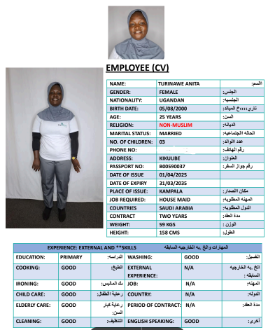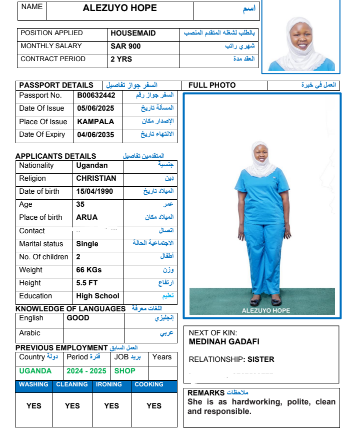 نوع الخدمة نوع الخدمة استقدام تأجير نقل خدمات الجنسية الجنسية الفلبين الهند مصر كينيا اثيوبيا بروندي بنغلاديش أوغندا أوغندا معروفة باكستان الفلبين معروفة اندونيسيا المهنة عاملة منزلية سائق خاص عاملة عناية زوجين ( عامله منزليه وسائق ) الديانة مسلم غير مسلم الخبرة سبق العمل لم يسبق العمل العمر العمر 15 16 17 18 19 20 21 22 23 24 25 26 27 28 29 30 31 32 33 34 35 36 37 38 39 40 41 42 43 44 45 46 47 48 49 50 51 52 53 54 55 56 57 58 59 60 الحالة العائلية الحالة العائلية اعزب متزوج مطلق ارمل اللغة اللغة العربية العربية العربية بنجالي نبالي فلبيني امهرية سواحلي عربي + لغتها الاساسية اندونيسي اوغندي بروندي الوزن الوزن 40 41 42 43 44 45 46 47 48 49 50 51 52 53 54 55 56 57 58 59 60 61 62 63 64 65 66 67 68 69 70 71 72 73 74 75 76 77 78 79 80 81 82 83 84 85 86 87 88 89 90 91 92 93 94 95 96 97 98 99 100 الطول الطول 100 101 102 103 104 105 106 107 108 109 110 111 112 113 114 115 116 117 118 119 120 121 122 123 124 125 126 127 128 129 130 131 132 133 134 135 136 137 138 139 140 141 142 143 144 145 146 147 148 149 150 151 152 153 154 155 156 157 158 159 160 161 162 163 164 165 166 167 168 169 170 171 172 173 174 175 176 177 178 179 180 181 182 183 184 185 186 187 188 189 190 الطلبات الطلبات التنظيف الغسيل الكوي الطبيخ العربي عناية الأطفال عناية كبار السن عناية الرضيع تعليم الأطفال التنظيف - الغسيل - الكوي التنظيف - الغسيل - الكوي- رغبة في تعلم الطبخ التنظيف - الغسيل - الكوي- رغبة في العناية بالاطفال بحث مسح بحث متقدم AINEMBABAZI PROVIA أوغندا العمر 33 الخبرة لم يسبق العمل الديانة غير مسلم رقم الملف B00630589 حجز العاملة AGWEE ESTHER أوغندا العمر 30 الخبرة لم يسبق العمل الديانة غير مسلم رقم الملف B00609587 حجز العاملة NASSOZI CATHERINE أوغندا العمر 29 الخبرة لم يسبق العمل الديانة غير مسلم رقم الملف A00614470 حجز العاملة ALEZUYO HOPE أوغندا العمر 35 الخبرة لم يسبق العمل الديانة غير مسلم رقم الملف B00632442 حجز العاملة NALUBEGA JOANITA أوغندا العمر 37 الخبرة لم يسبق العمل الديانة غير مسلم رقم الملف A00387981 حجز العاملة ASIIMWE LOYCE أوغندا العمر 22 الخبرة لم يسبق العمل الديانة غير مسلم رقم الملف B00664514 حجز العاملة KHBUYA WINNIE أوغندا العمر 22 الخبرة لم يسبق العمل الديانة غير مسلم رقم الملف B00661291 حجز العاملة NAMATOVU HAJARA أوغندا العمر 15 الخبرة لم يسبق العمل الديانة مسلم رقم الملف A00948594 حجز العاملة NAMBOZO SHARON أوغندا العمر 27 الخبرة لم يسبق العمل الديانة غير مسلم رقم الملف B00577203 حجز العاملة TURINAWE ANITA أوغندا العمر 25 الخبرة لم يسبق العمل الديانة غير مسلم رقم الملف B00590037 حجز العاملة 1 2 3 4 5 6 7