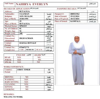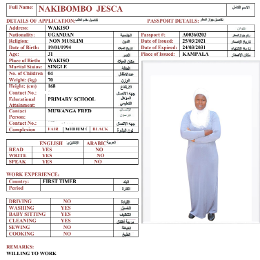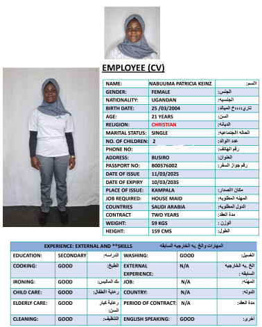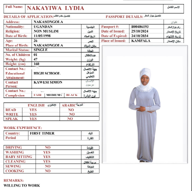 نوع الخدمة نوع الخدمة استقدام تأجير نقل خدمات الجنسية الجنسية الفلبين الهند مصر كينيا اثيوبيا بروندي بنغلاديش أوغندا أوغندا معروفة باكستان الفلبين معروفة اندونيسيا المهنة عاملة منزلية سائق خاص عاملة عناية زوجين ( عامله منزليه وسائق ) الديانة مسلم غير مسلم الخبرة سبق العمل لم يسبق العمل العمر العمر 15 16 17 18 19 20 21 22 23 24 25 26 27 28 29 30 31 32 33 34 35 36 37 38 39 40 41 42 43 44 45 46 47 48 49 50 51 52 53 54 55 56 57 58 59 60 الحالة العائلية الحالة العائلية اعزب متزوج مطلق ارمل اللغة اللغة العربية العربية العربية بنجالي نبالي فلبيني امهرية سواحلي عربي + لغتها الاساسية اندونيسي اوغندي بروندي الوزن الوزن 40 41 42 43 44 45 46 47 48 49 50 51 52 53 54 55 56 57 58 59 60 61 62 63 64 65 66 67 68 69 70 71 72 73 74 75 76 77 78 79 80 81 82 83 84 85 86 87 88 89 90 91 92 93 94 95 96 97 98 99 100 الطول الطول 100 101 102 103 104 105 106 107 108 109 110 111 112 113 114 115 116 117 118 119 120 121 122 123 124 125 126 127 128 129 130 131 132 133 134 135 136 137 138 139 140 141 142 143 144 145 146 147 148 149 150 151 152 153 154 155 156 157 158 159 160 161 162 163 164 165 166 167 168 169 170 171 172 173 174 175 176 177 178 179 180 181 182 183 184 185 186 187 188 189 190 الطلبات الطلبات التنظيف الغسيل الكوي الطبيخ العربي عناية الأطفال عناية كبار السن عناية الرضيع تعليم الأطفال التنظيف - الغسيل - الكوي التنظيف - الغسيل - الكوي- رغبة في تعلم الطبخ التنظيف - الغسيل - الكوي- رغبة في العناية بالاطفال بحث مسح بحث متقدم NAHIRYA EVERLYN أوغندا العمر 29 الخبرة لم يسبق العمل الديانة غير مسلم رقم الملف B00521963 حجز العاملة NAKIBOMBO JESCA أوغندا العمر 31 الخبرة لم يسبق العمل الديانة غير مسلم رقم الملف A00360203 حجز العاملة NAKAYIWA LYDIA أوغندا العمر 26 الخبرة لم يسبق العمل الديانة غير مسلم رقم الملف B00486193 حجز العاملة NABUUMA PATRICIA KEINZ أوغندا العمر 21 الخبرة لم يسبق العمل الديانة غير مسلم رقم الملف B00576002 حجز العاملة TELEKA WINNY أوغندا العمر 24 الخبرة لم يسبق العمل الديانة غير مسلم رقم الملف B00569143 حجز العاملة KYASIIMIRE GLORIA أوغندا العمر 22 الخبرة لم يسبق العمل الديانة غير مسلم رقم الملف B00602300 حجز العاملة NINSIIMA MAVICE أوغندا العمر 34 الخبرة لم يسبق العمل الديانة غير مسلم رقم الملف B00567170 حجز العاملة NATUKUNDA MACKLINE أوغندا العمر 39 الخبرة لم يسبق العمل الديانة غير مسلم رقم الملف B00586082 حجز العاملة KWARISIIMA ANNAKULATE أوغندا العمر 31 الخبرة لم يسبق العمل الديانة غير مسلم رقم الملف B00565863 حجز العاملة TURYASIIMA MARION JOY أوغندا العمر 26 الخبرة لم يسبق العمل الديانة غير مسلم رقم الملف A00672461 حجز العاملة 1 2 3 4 5 6 7 8 9