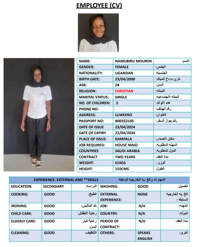 نوع الخدمة نوع الخدمة استقدام تأجير نقل خدمات الجنسية الجنسية الفلبين الهند مصر كينيا اثيوبيا بروندي بنغلاديش أوغندا أوغندا معروفة باكستان الفلبين معروفة اندونيسيا المهنة عاملة منزلية سائق خاص عاملة عناية زوجين ( عامله منزليه وسائق ) الديانة مسلم غير مسلم الخبرة سبق العمل لم يسبق العمل العمر العمر 15 16 17 18 19 20 21 22 23 24 25 26 27 28 29 30 31 32 33 34 35 36 37 38 39 40 41 42 43 44 45 46 47 48 49 50 51 52 53 54 55 56 57 58 59 60 الحالة العائلية الحالة العائلية اعزب متزوج مطلق ارمل اللغة اللغة العربية العربية العربية بنجالي نبالي فلبيني امهرية سواحلي عربي + لغتها الاساسية اندونيسي اوغندي بروندي الوزن الوزن 40 41 42 43 44 45 46 47 48 49 50 51 52 53 54 55 56 57 58 59 60 61 62 63 64 65 66 67 68 69 70 71 72 73 74 75 76 77 78 79 80 81 82 83 84 85 86 87 88 89 90 91 92 93 94 95 96 97 98 99 100 الطول الطول 100 101 102 103 104 105 106 107 108 109 110 111 112 113 114 115 116 117 118 119 120 121 122 123 124 125 126 127 128 129 130 131 132 133 134 135 136 137 138 139 140 141 142 143 144 145 146 147 148 149 150 151 152 153 154 155 156 157 158 159 160 161 162 163 164 165 166 167 168 169 170 171 172 173 174 175 176 177 178 179 180 181 182 183 184 185 186 187 188 189 190 الطلبات الطلبات التنظيف الغسيل الكوي الطبيخ العربي عناية الأطفال عناية كبار السن عناية الرضيع تعليم الأطفال التنظيف - الغسيل - الكوي التنظيف - الغسيل - الكوي- رغبة في تعلم الطبخ التنظيف - الغسيل - الكوي- رغبة في العناية بالاطفال بحث مسح بحث متقدم NAMUBIRU MOUREN أوغندا معروفة العمر 24 الخبرة لم يسبق العمل الديانة غير مسلم رقم الملف B00332105 حجز العاملة
